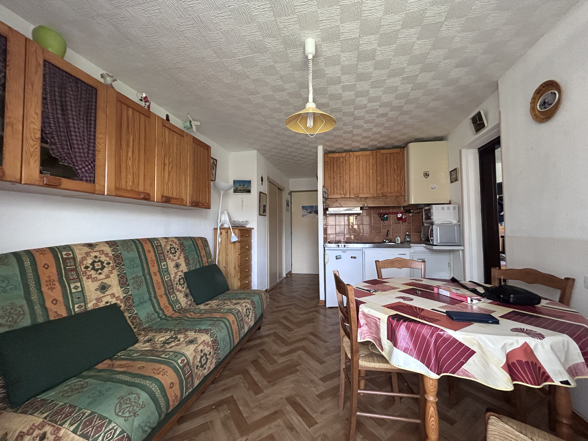 une pièce à vivre avec coin cuisine, une chambre, et une salle de bain.