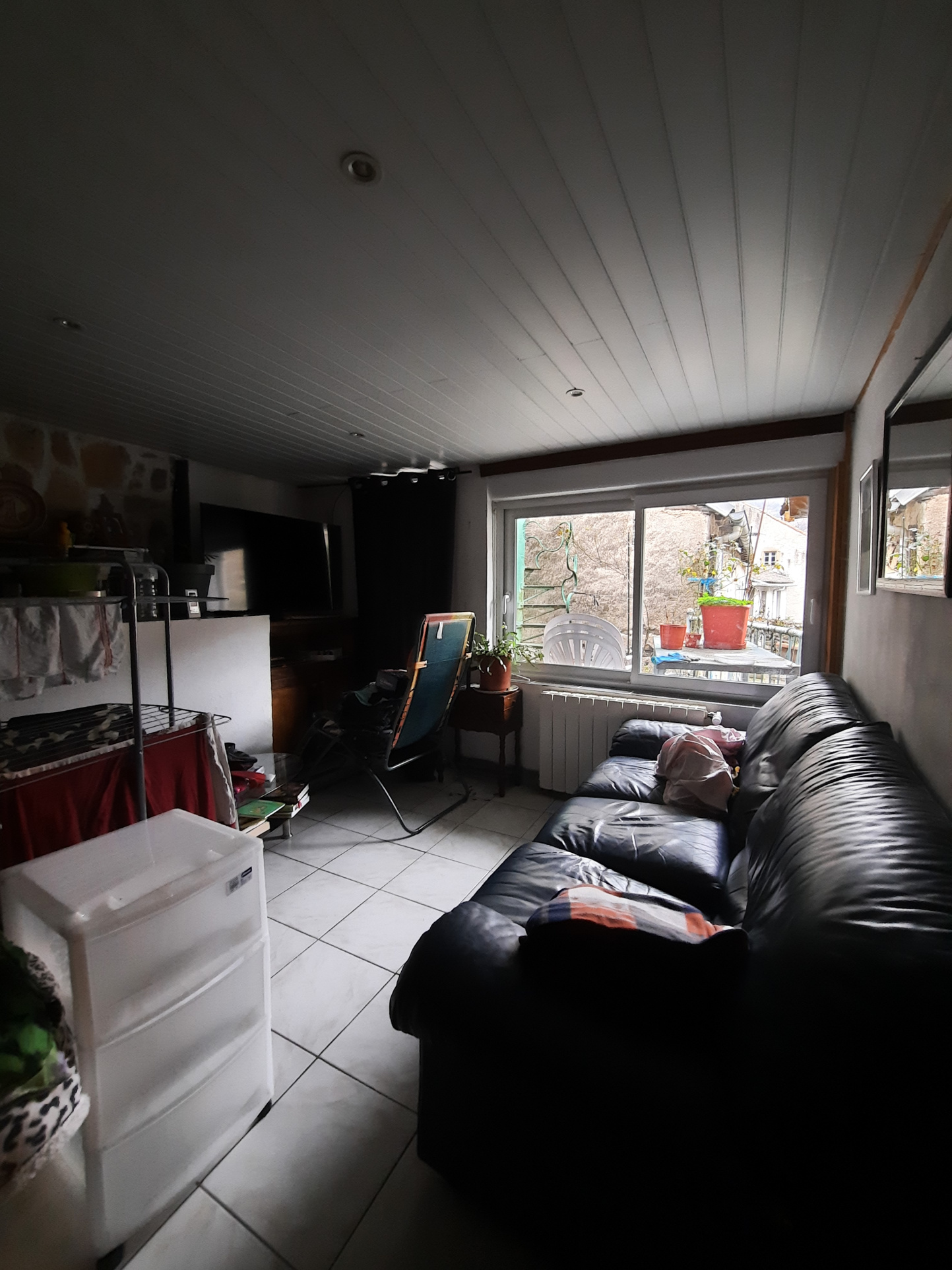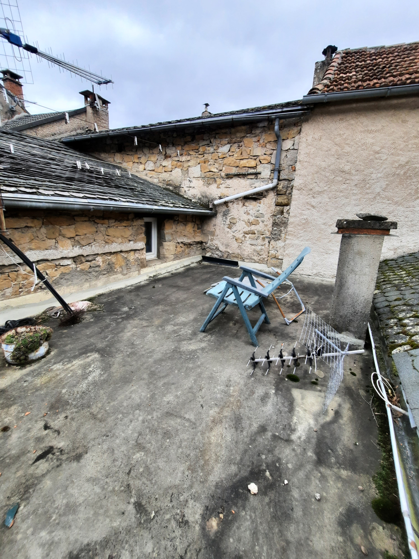 À l'étage : séjour avec cheminée à insert, cuisine ouverte, salle d'eau, une chambre avec débarras, ainsi qu'un salon donnant sur une belle terrasse avec accès au toit-terrasse.