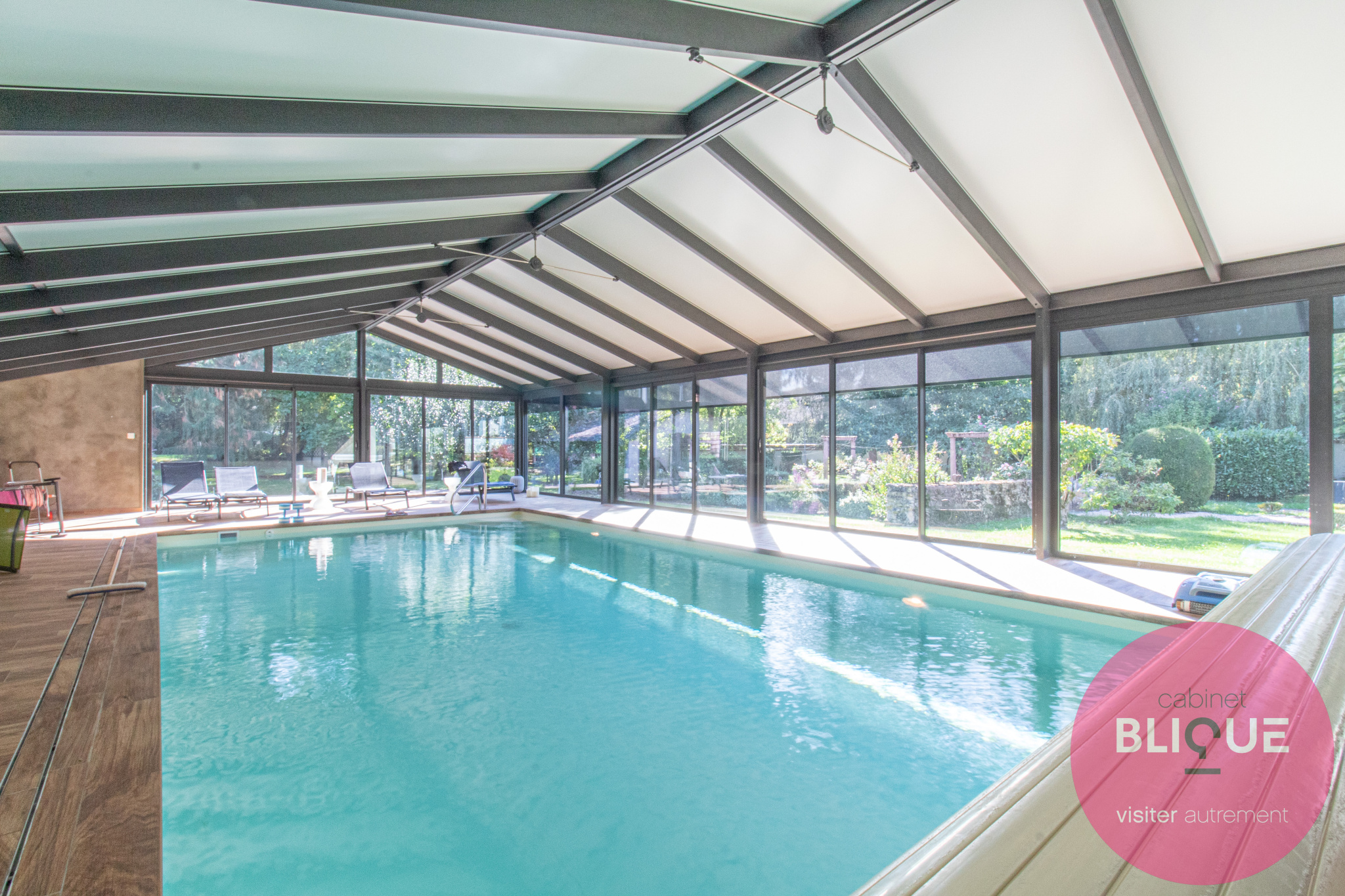 L'espace piscine vous offrira une vue panoramique sur le parc arboré de 5 533 m2, ponctué d'arbres bicentenaires, et sa dépendance.