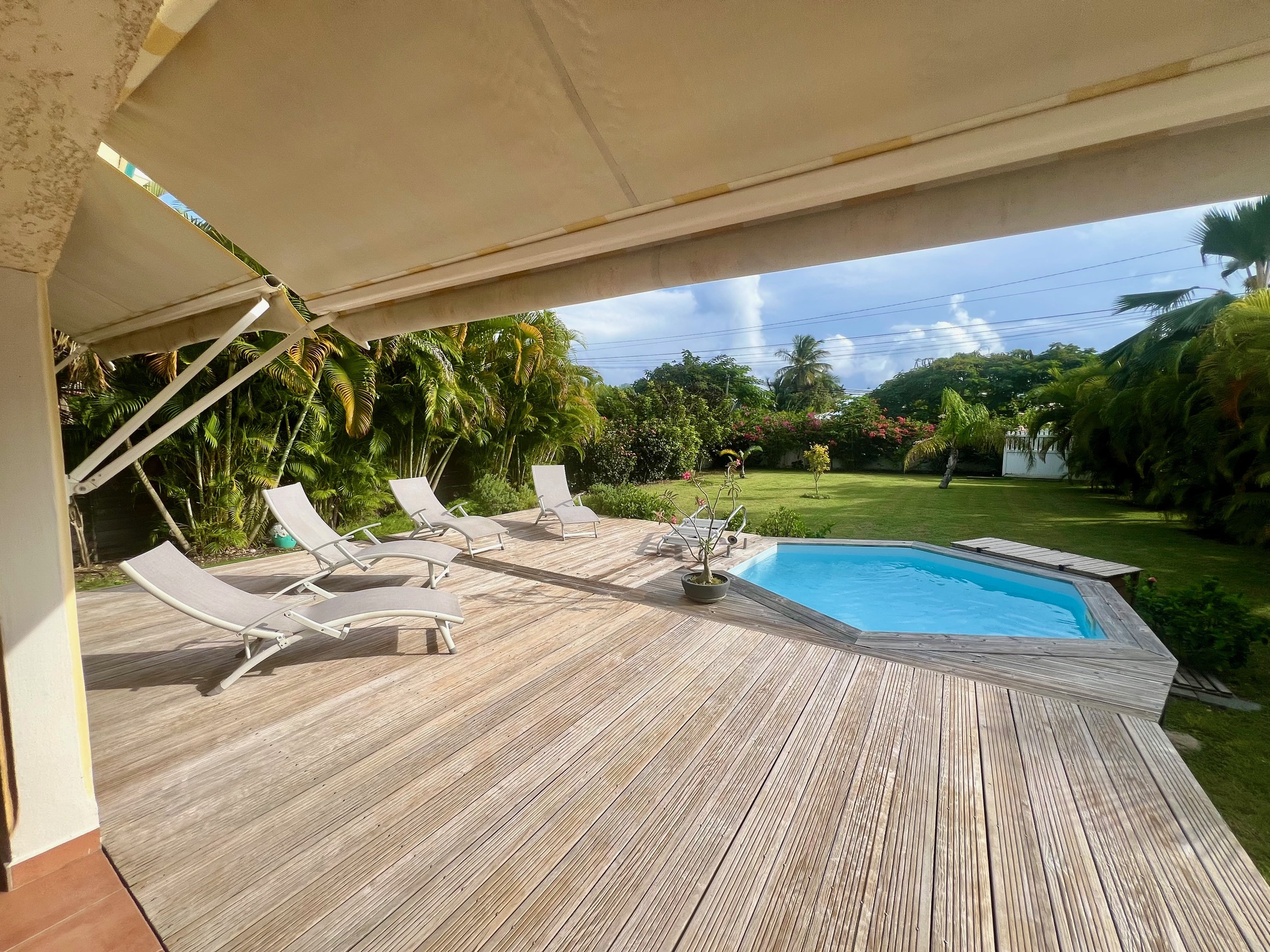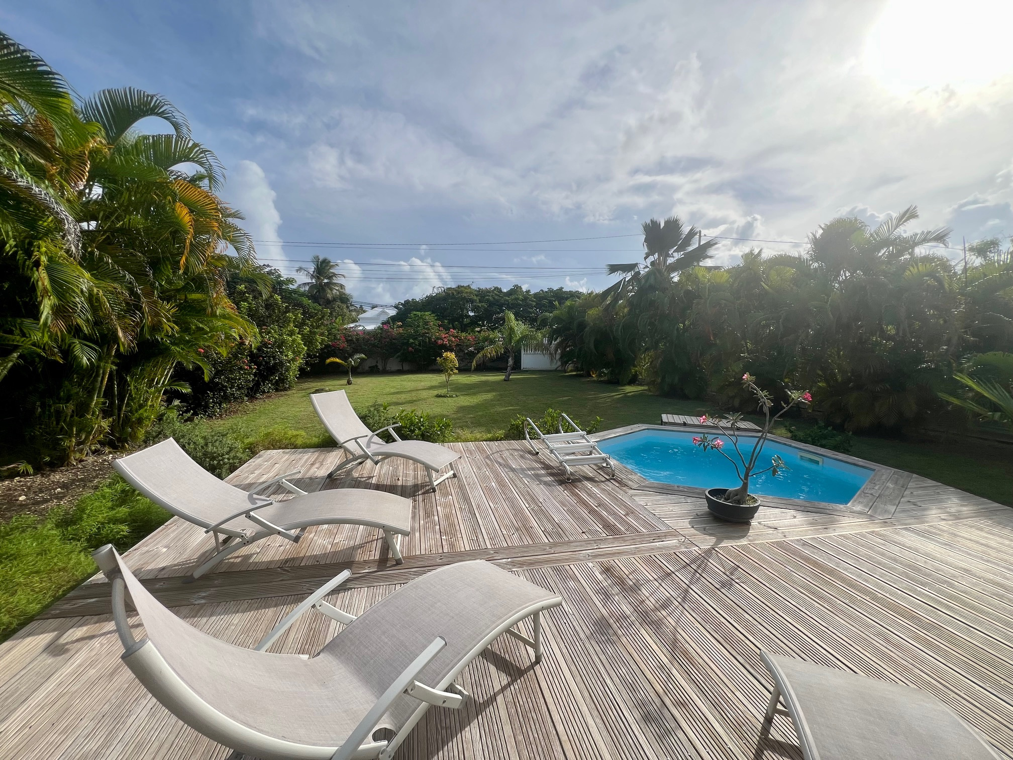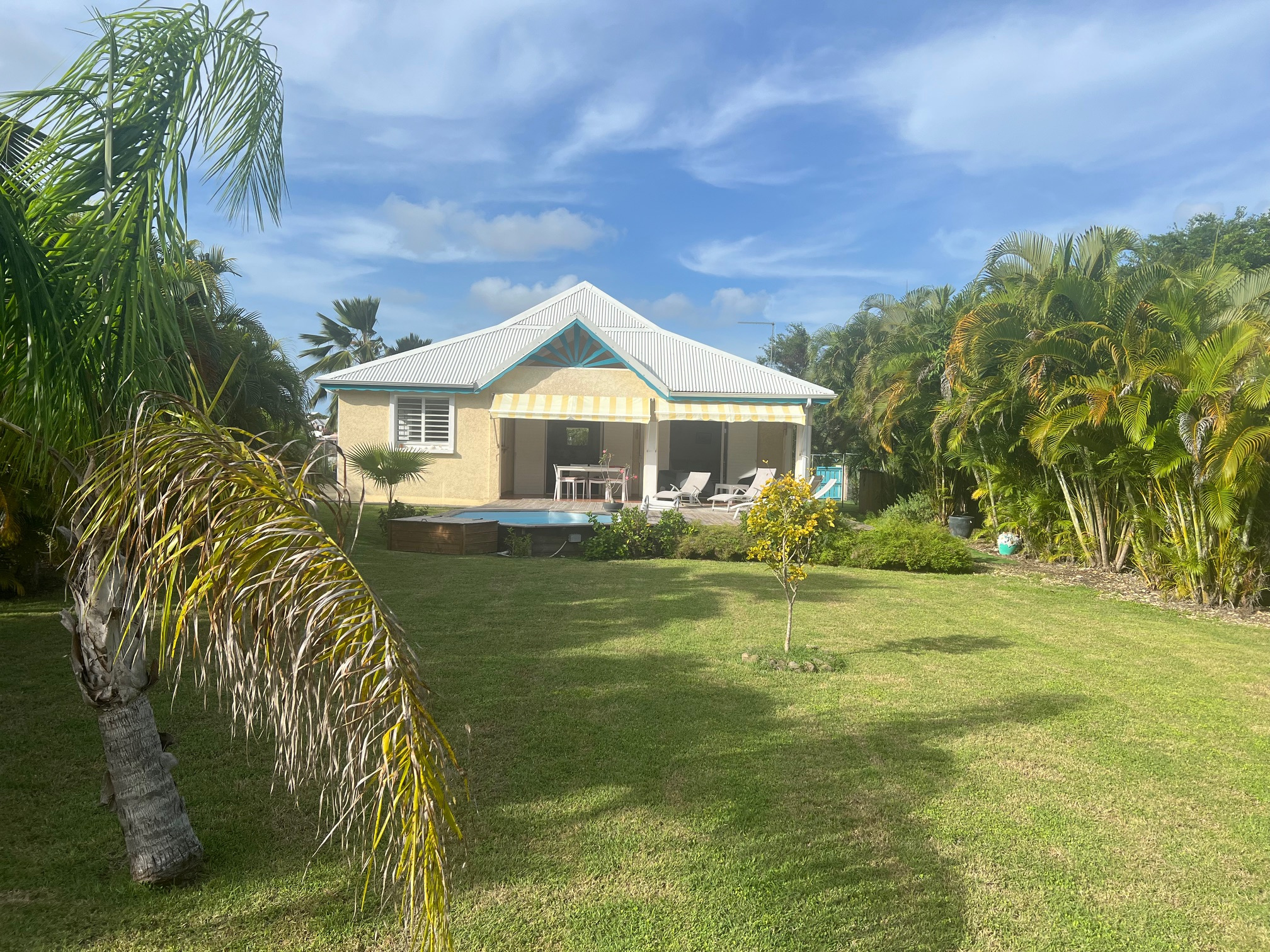 A deux pas du bourg et de la Marina, découvrez cette jolie villa nichée dans un jardin paysager de 800m2. Elle se compose d'un séjour avec une belle hauteur sous plafond offrant la possibilité d'installer une mezzanine, une cuisine américaine entièrement équipée et son cellier attenant, 2 chambres climatisées avec chacune sa salle d'eau attenante, un wc visiteur, une terrasse à vivre donnant sur un grand deck et son bac à punch, le tout sur un magnifique parc arboré.