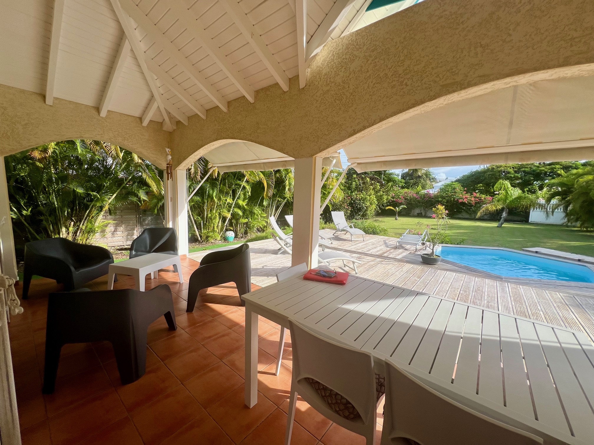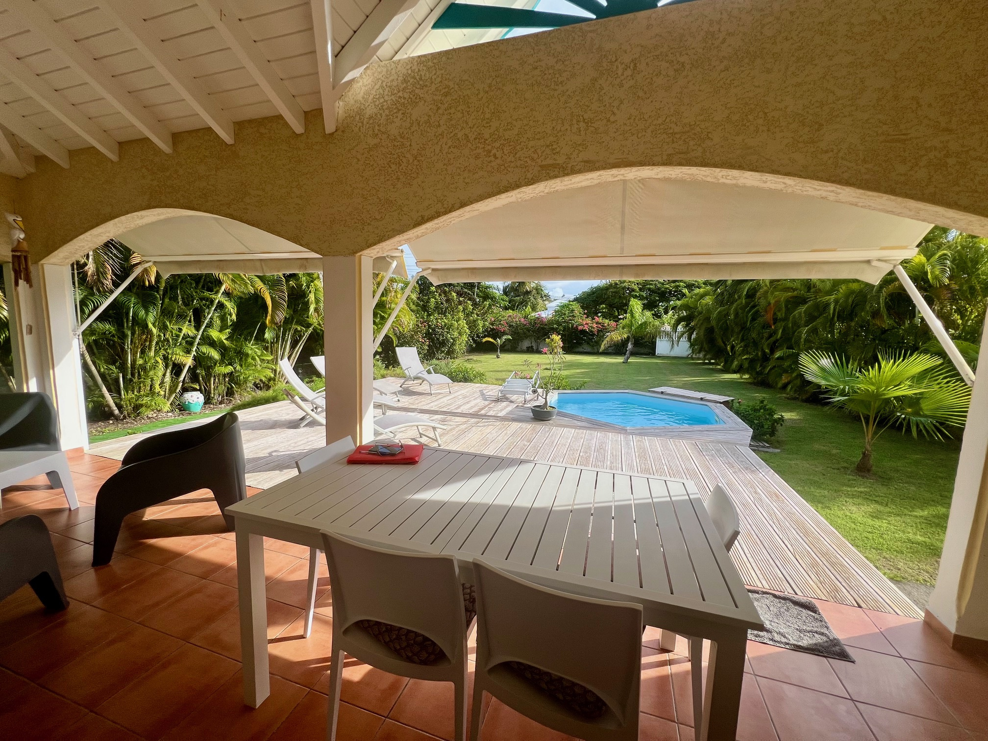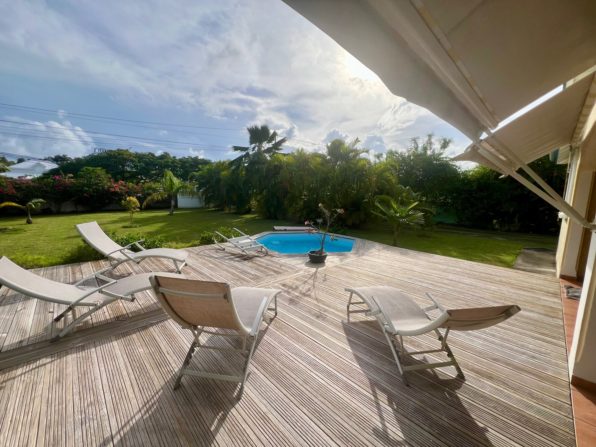 A deux pas du bourg et de la Marina, découvrez cette jolie villa nichée dans un jardin paysager de 800m2. Elle se compose d'un séjour avec une belle hauteur sous plafond offrant la possibilité d'installer une mezzanine, une cuisine américaine entièrement équipée et son cellier attenant, 2 chambres climatisées avec chacune sa salle d'eau attenante, un wc visiteur, une terrasse à vivre donnant sur un grand deck et son bac à punch, le tout sur un magnifique parc arboré.