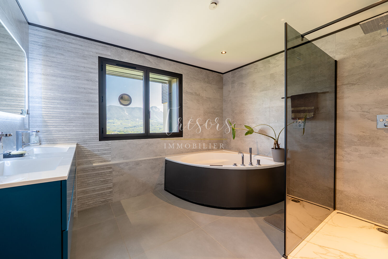 Située sur les hauteurs de Groisy, l'agence TRÉSORS IMMOBILIER vous propose cette magnifique villa contemporaine, offrant une vue panoramique sur les montagnes et un cadre de vie préservé, alliant calme et proximité des commodités.Édifiée sur une parcelle paysagée de 1500 m², entièrement
