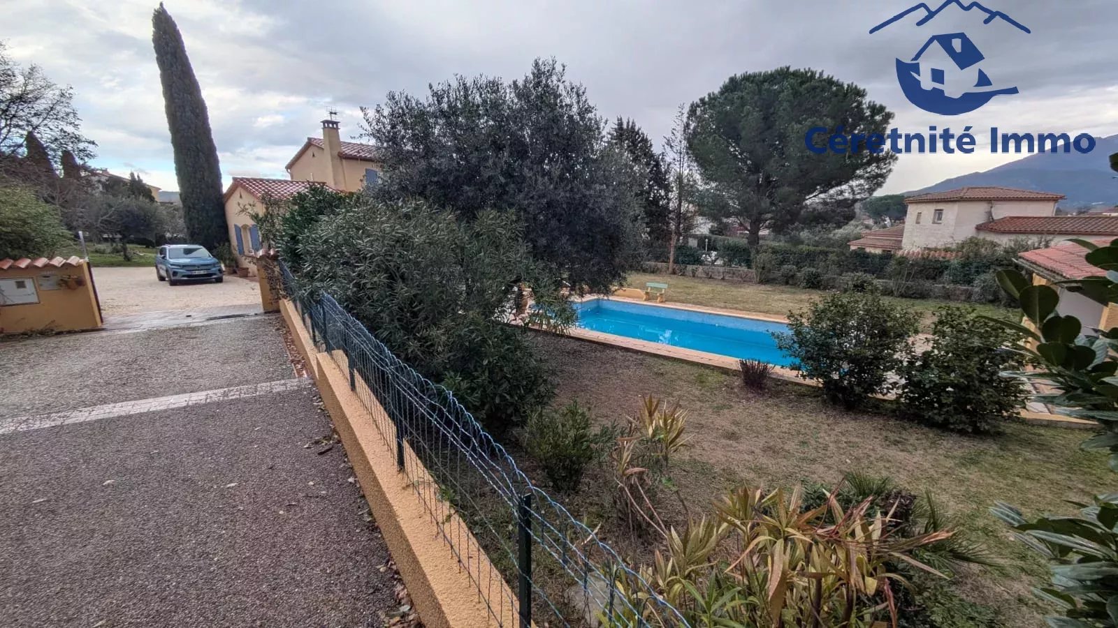 Céretnité Immo vous propose cette belle villa 4 faces construite en 1990 par Solans. Son orientation plein sud offre une vue dégagée sur le massif des Albères, vue dont vous pourrez profiter depuis la piscine lors des beaux jours. Composé de deux niveaux, ce bien bénéficie de 4 chambres et d'une grande pièce de vie permettant d'accueillir aisément famille et amis. Les 2145 m² de terrain permettront aux amoureux du jardinage et/ou du potager d'assouvir leur passion dans un cadre idéal, proche du centre mais suffisamment à l'écart pour profiter du calme environnant. Un grand garage avec porte electrique laisse la possibilité de stationner deux véhicules et de faire un atelier pour les plus bricoleurs. La propriété bénéficie également d'un terrain constructible de 696 m² de l'autre coté du chemin.