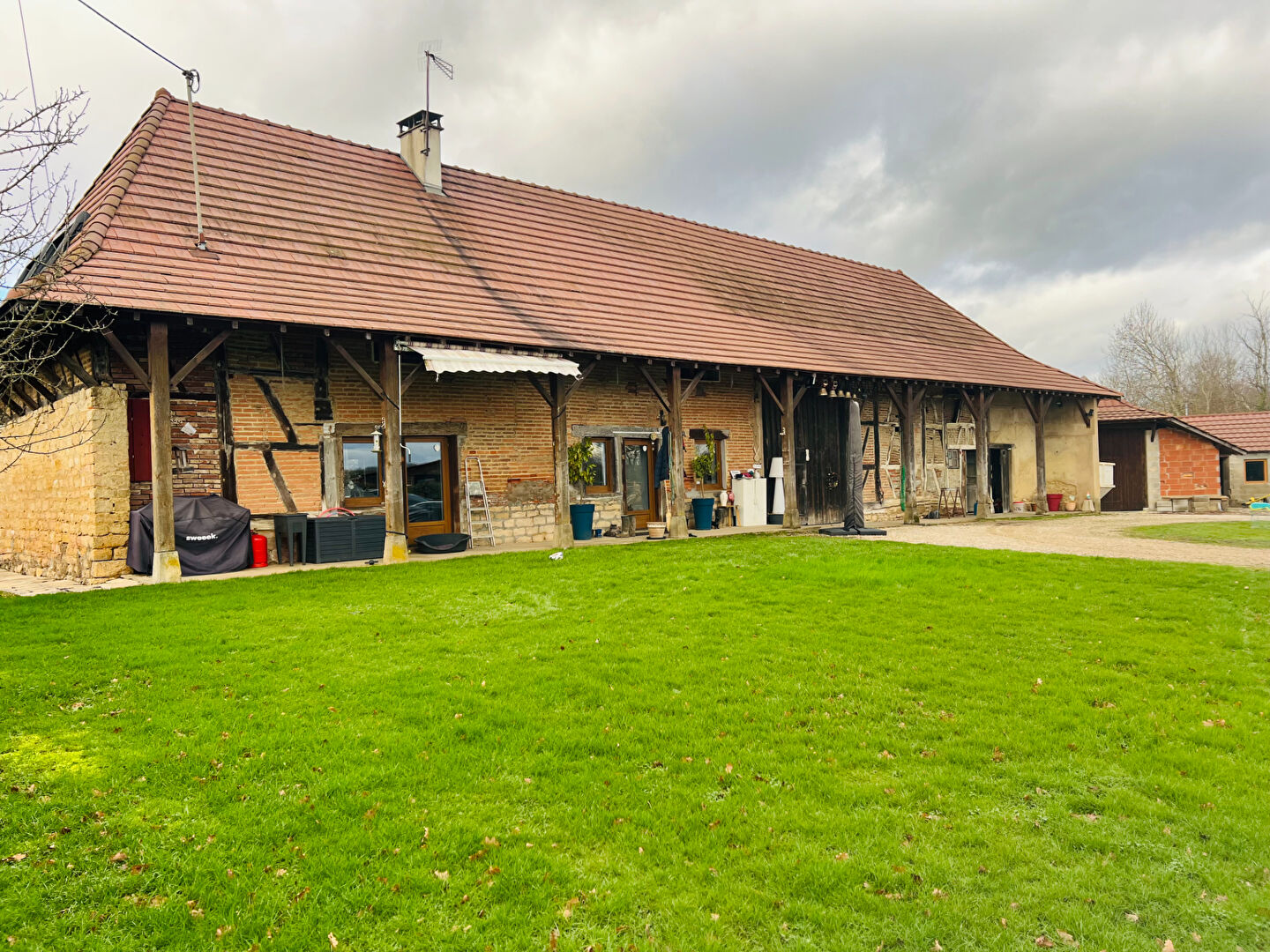 Ferme bressane rénovée composée de : Cuisine équipée ouverte pièce de vie de 42 m² avec 2 poêles à bois et granulés, 1 chambre, salle d'eau et W.C. Etage : 2 chambres, salle de bains-W.C. et combles aménageables. Grange, écuries et remises attenantes. 2 dépendances séparées servant de garage et remises. Terrain adapté pour les chevaux avec stabulations, puits, carrière de 40X20 et prés clôturés.