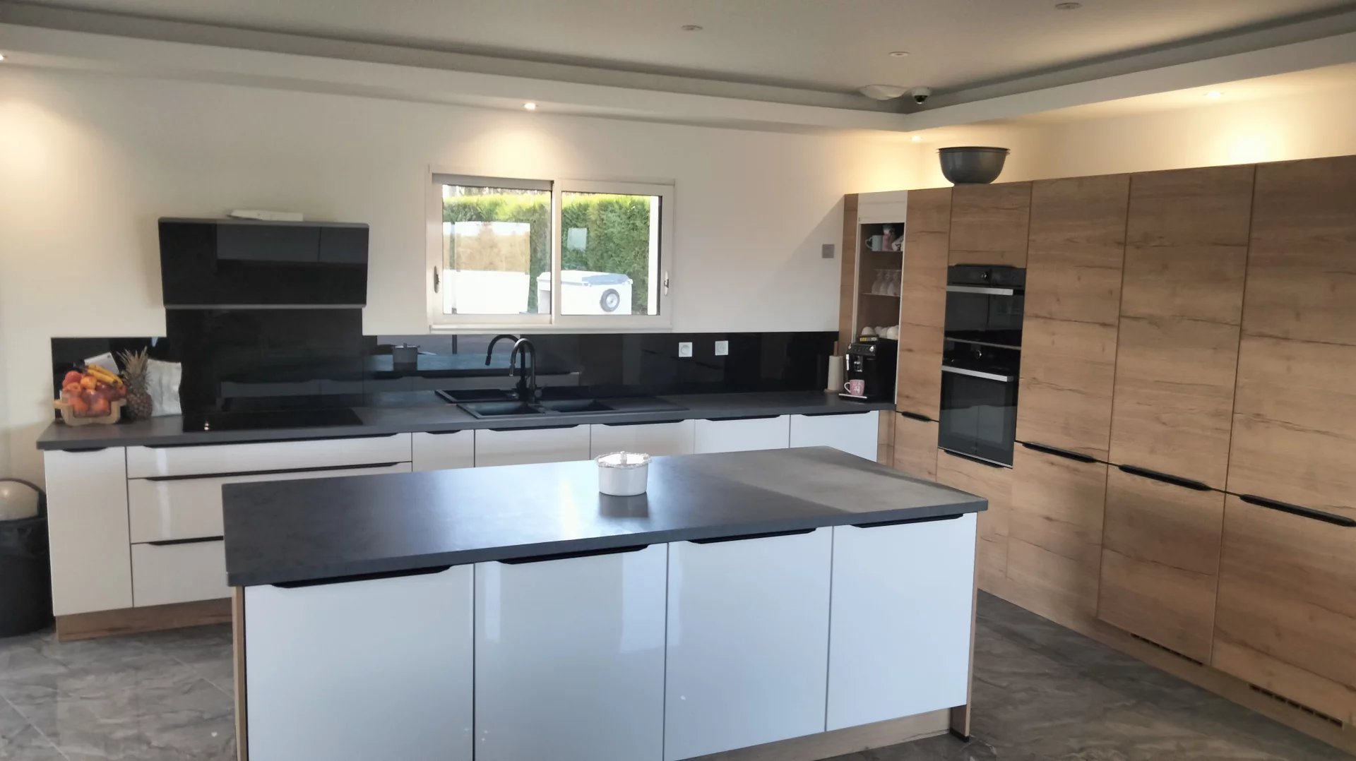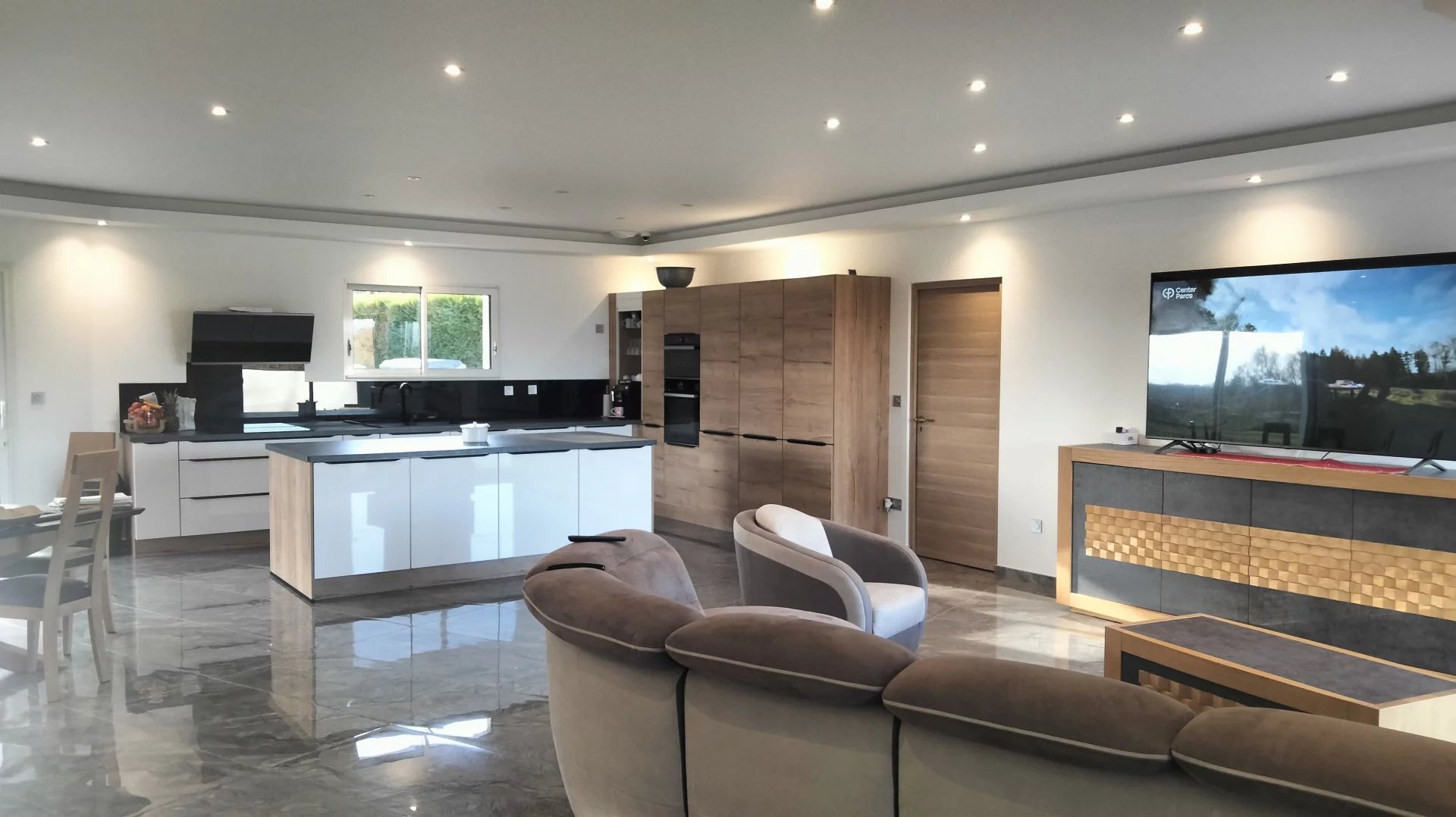Elle se compose d'une cuisine aménagée et entièrement équipée, ouverte sur une belle pièce de vie lumineuse, idéale pour les moments de convivialité.