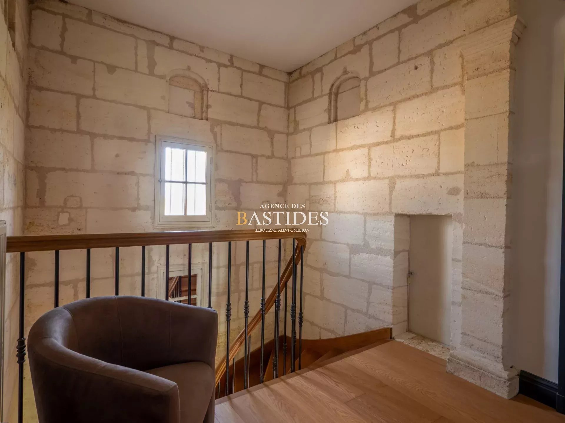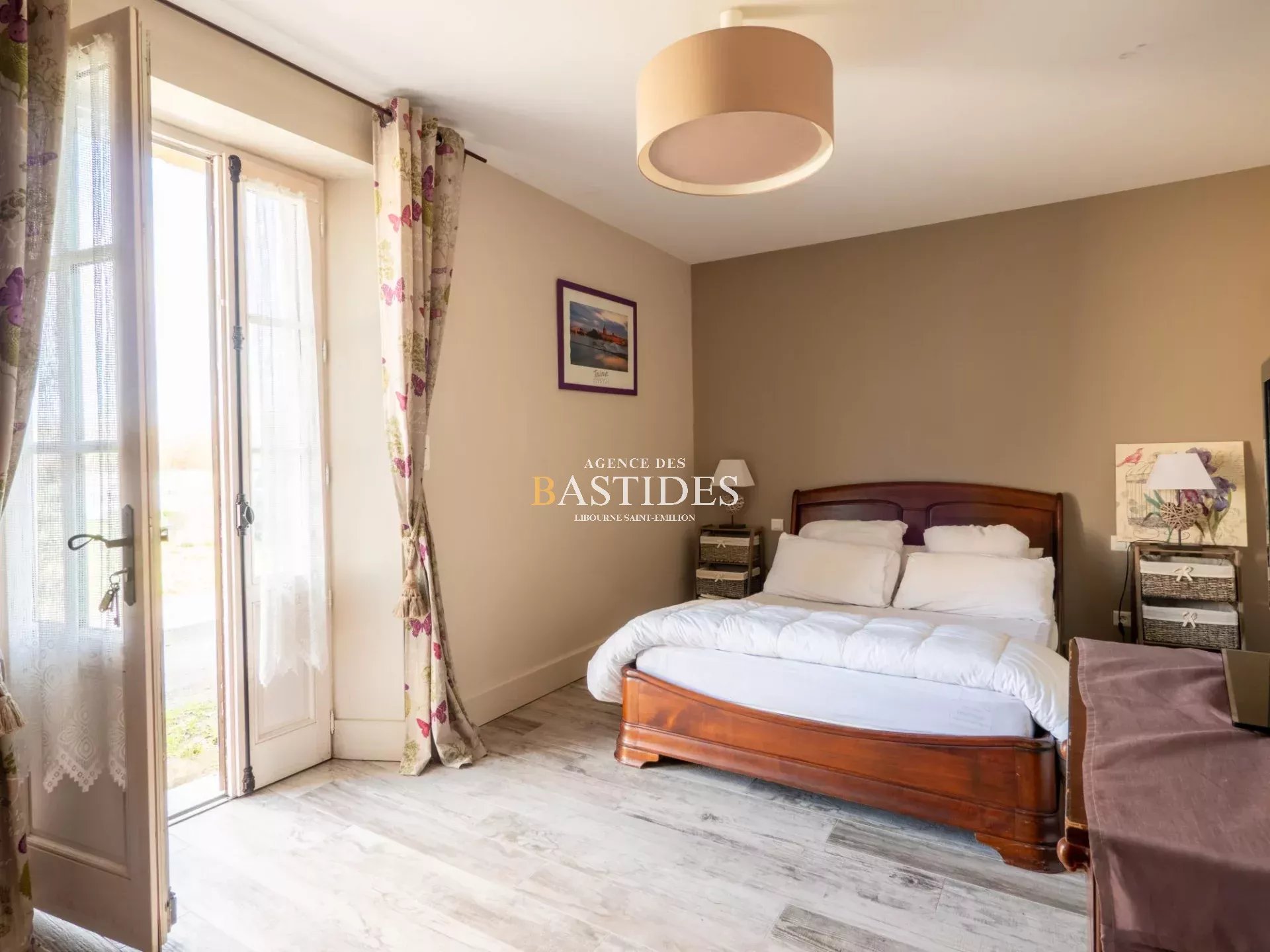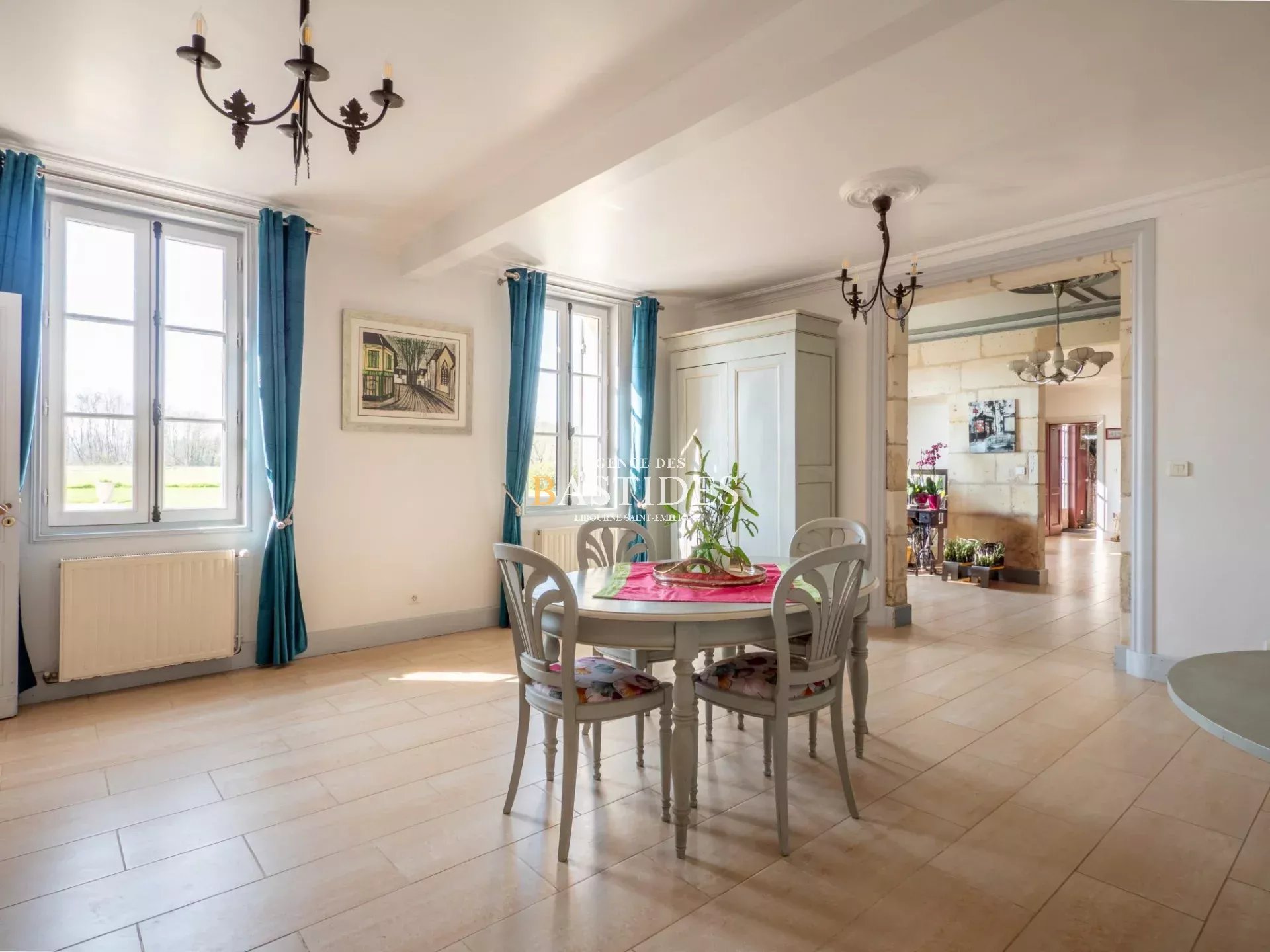 Une bâtisse authentique par son aspect magistral et bien original, car cette demeure se vit comme un petit chateau. En façade les pièces ont du volume, conforme à la promesse audacieuse que la maison fait depuis l'extérieur. On circule librement à travers un RDC filant : une cuisine conviviale avec son master piano de cuisson LACANCHE, ses carreaux de Gironde et sa cheminée en pierre, deux vastes séjours de part et d'autre de l'entrée et un bureau avec cheminée. Une cave à vin aménagée comme une réelle salle de dégustation avec comptoir et casiers en pierre : de quoi stocker dignement de fabuleux trésors. Sur l'arrière, au nord, deux suites parentales avec accès extérieur. Un bel escalier signé d'un compagnon nous guide à l'étage vers un joli palier qui dessert deux chambres, une salle d'eau et une master suite avec dressing. Dans cette demeure les côtés pratiques n'ont pas été oubliés : garage, grenier, buanderie... Prestations anciennes conservées et modernité à tous les étages, piscine maçonnée et véritable pigeonnier en pierre à l'entrée de la propriété.