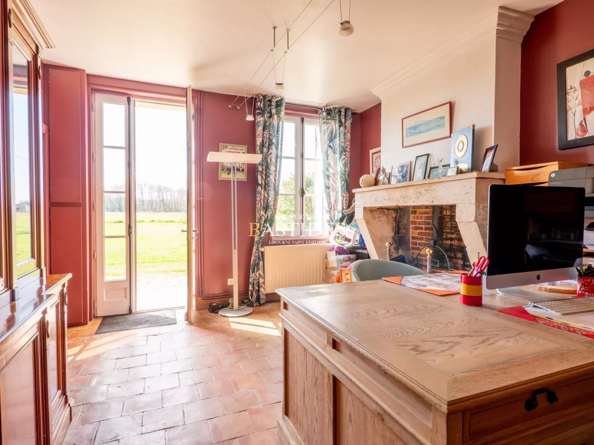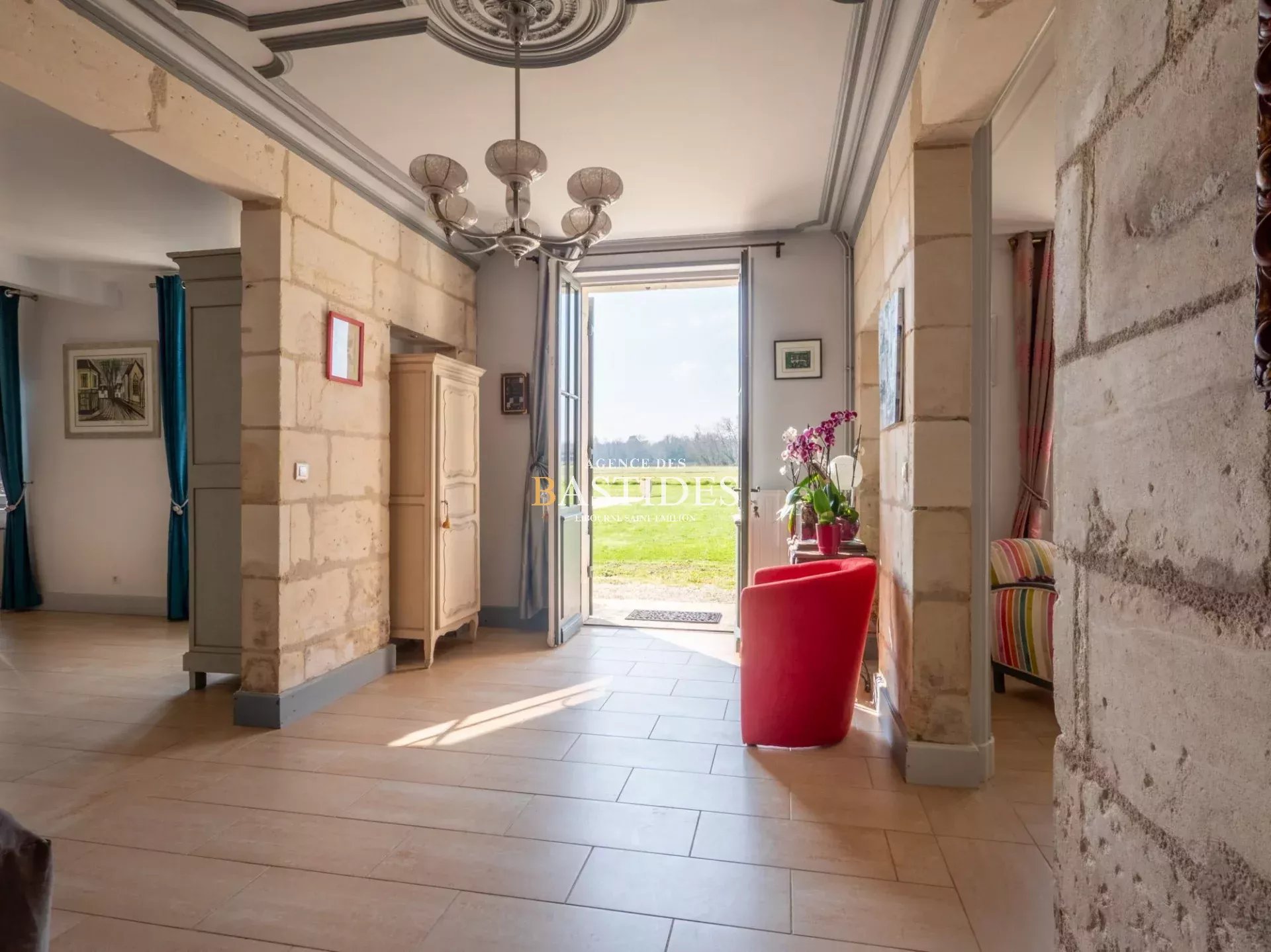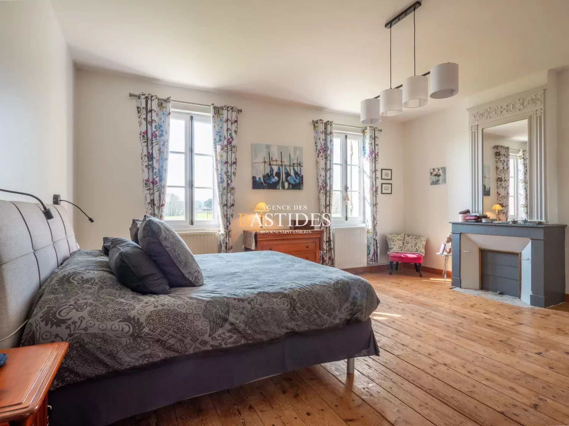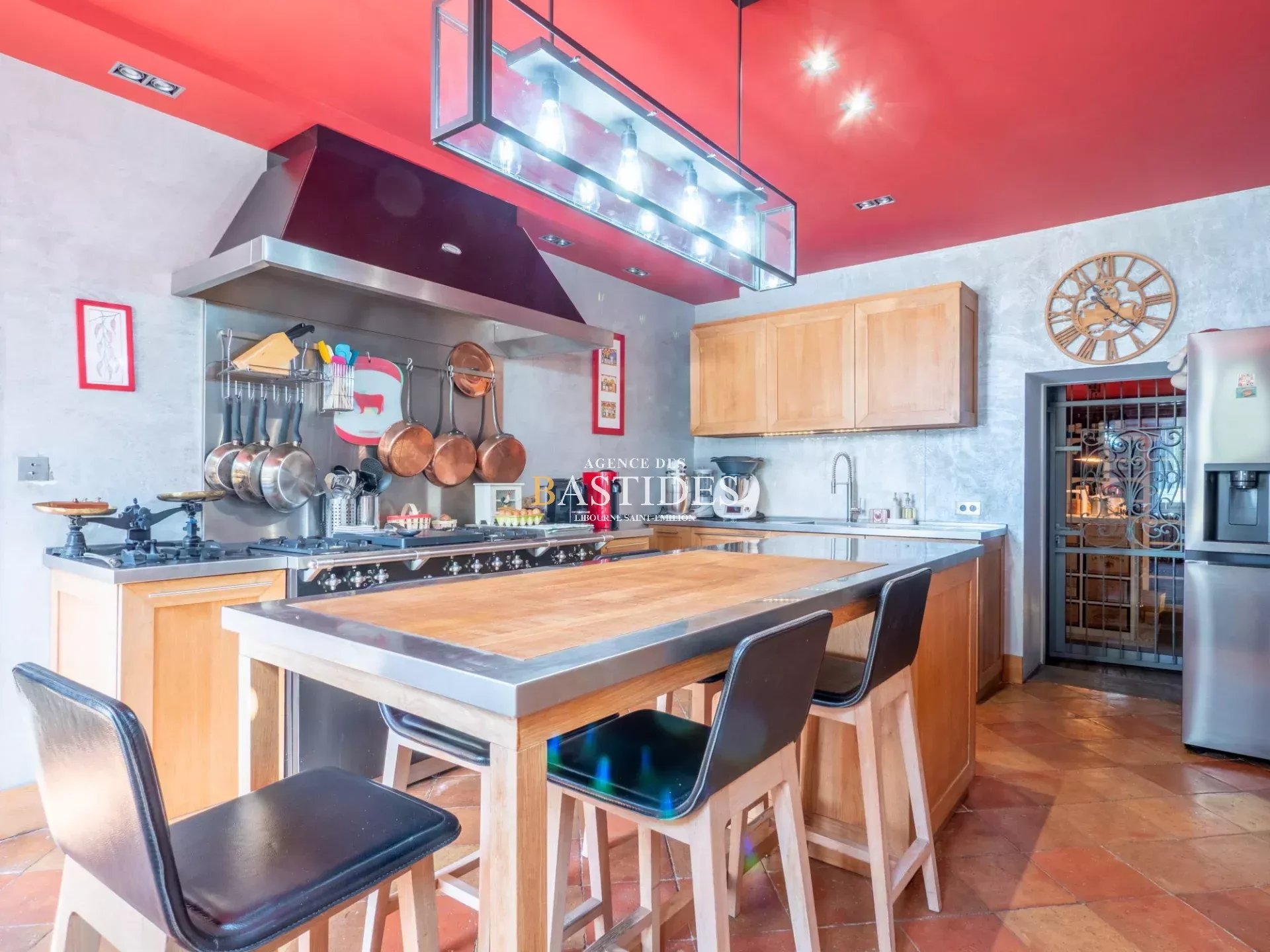 Une bâtisse authentique par son aspect magistral et bien original, car cette demeure se vit comme un petit chateau. En façade les pièces ont du volume, conforme à la promesse audacieuse que la maison fait depuis l'extérieur. On circule librement à travers un RDC filant : une cuisine conviviale avec son master piano de cuisson LACANCHE, ses carreaux de Gironde et sa cheminée en pierre, deux vastes séjours de part et d'autre de l'entrée et un bureau avec cheminée. Une cave à vin aménagée comme une réelle salle de dégustation avec comptoir et casiers en pierre : de quoi stocker dignement de fabuleux trésors. Sur l'arrière, au nord, deux suites parentales avec accès extérieur. Un bel escalier signé d'un compagnon nous guide à l'étage vers un joli palier qui dessert deux chambres, une salle d'eau et une master suite avec dressing. Dans cette demeure les côtés pratiques n'ont pas été oubliés : garage, grenier, buanderie... Prestations anciennes conservées et modernité à tous les étages, piscine maçonnée et véritable pigeonnier en pierre à l'entrée de la propriété.