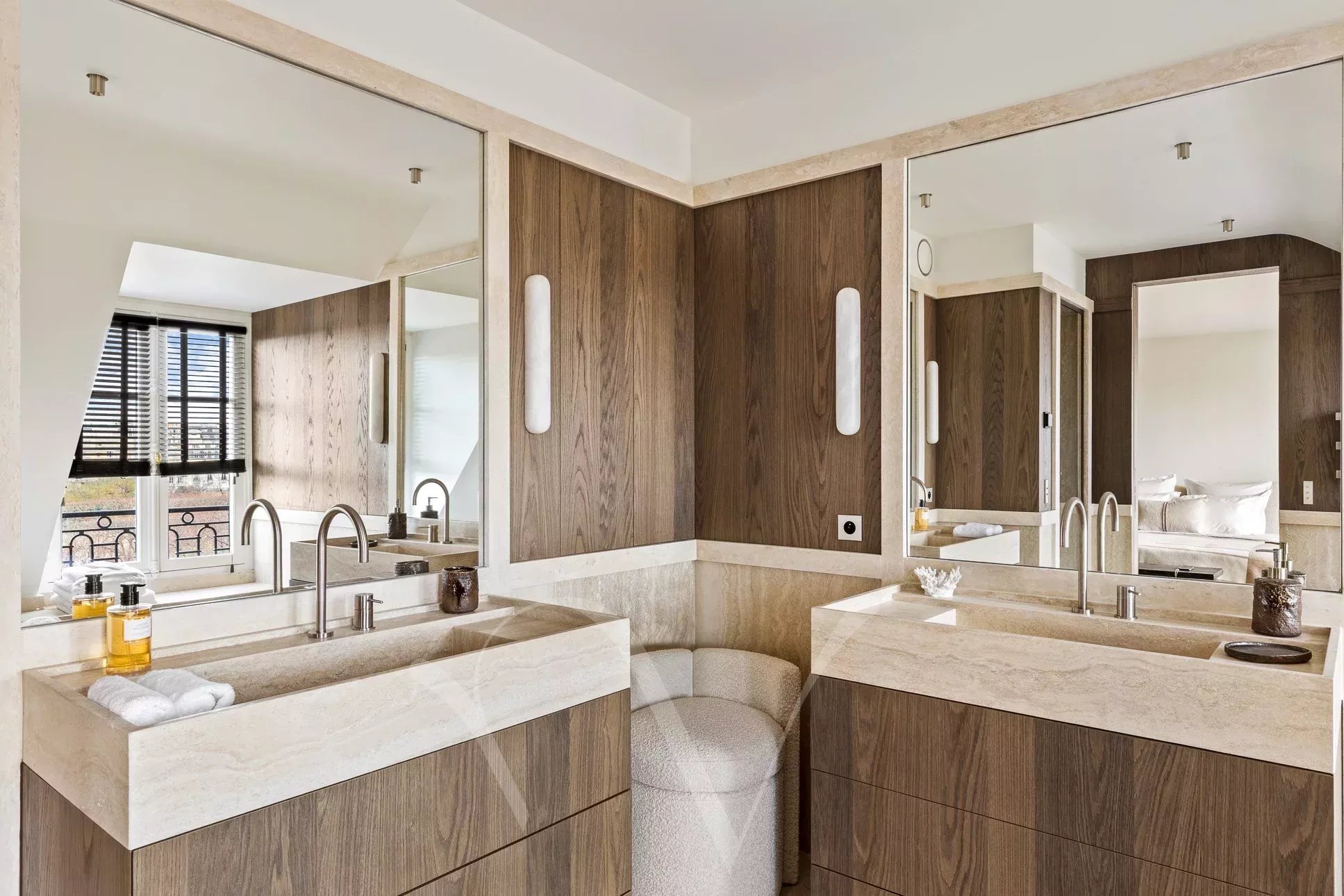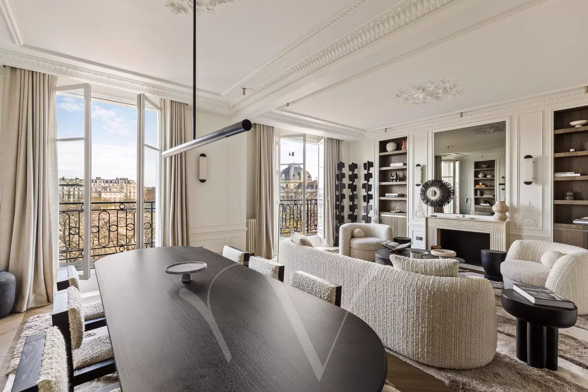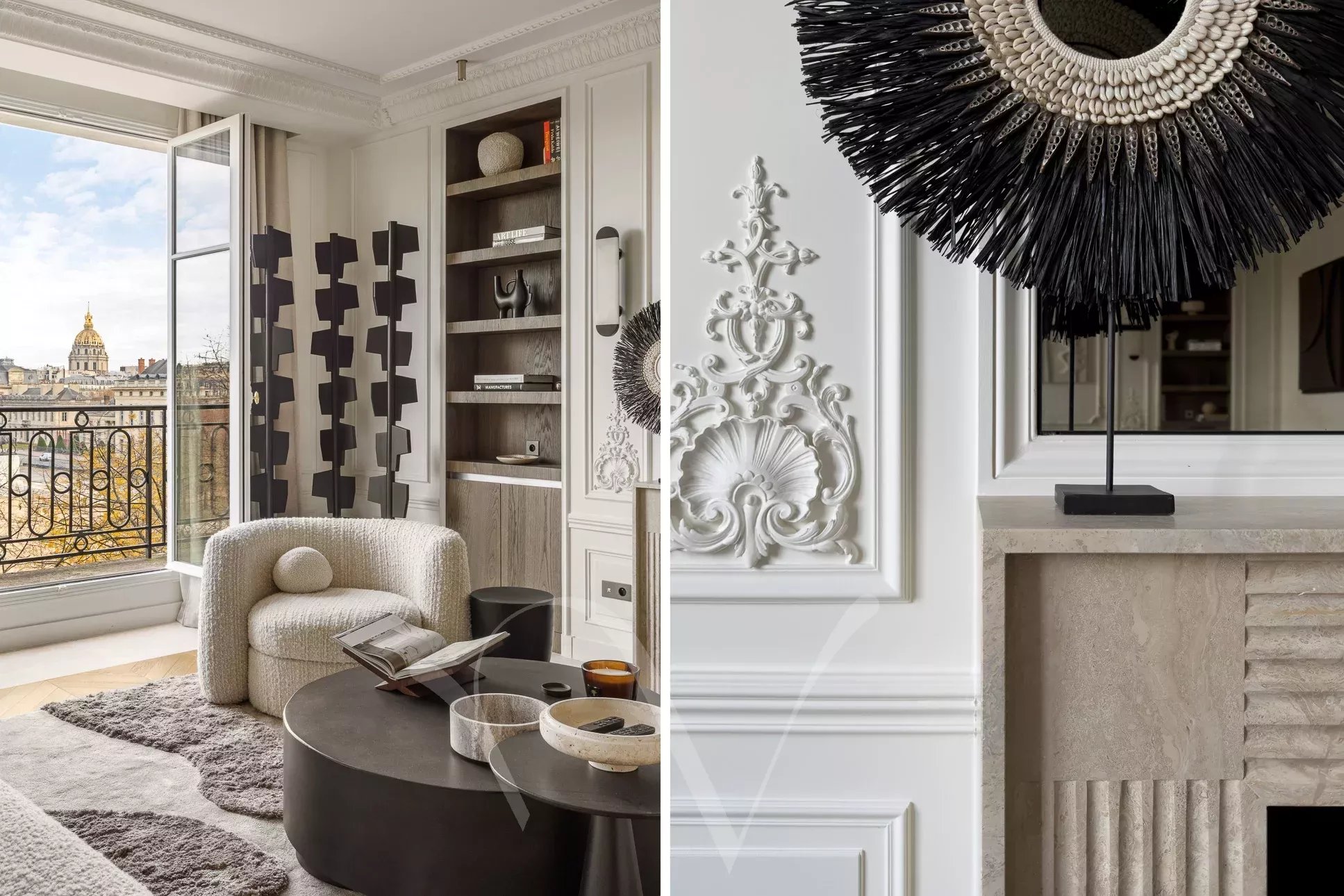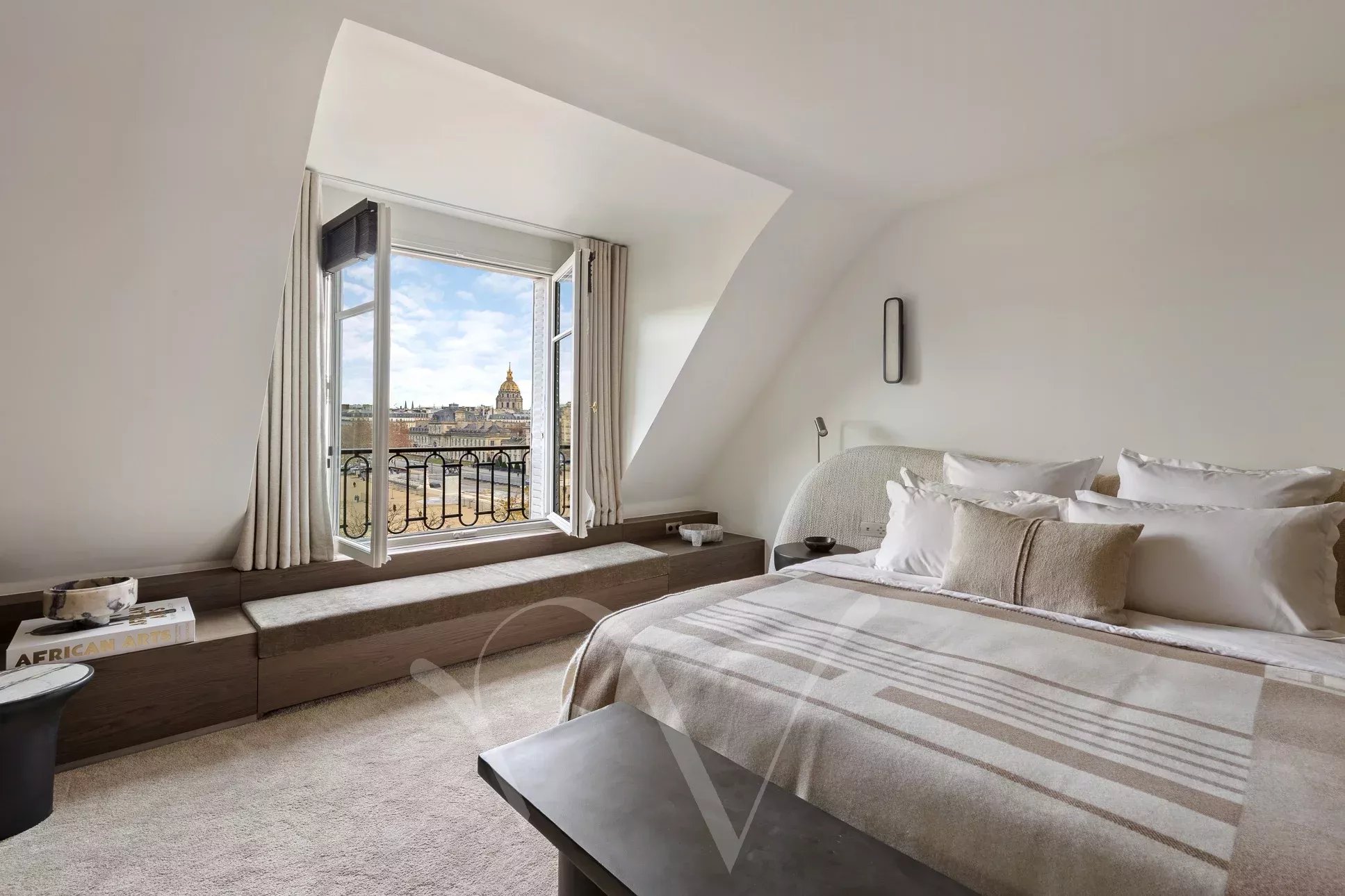 Situé au cœur du recherché quartier Ecole Militaire, cet appartement d’exception développe une surface de 191 m² et occupe les deux derniers étages d’un immeuble 1930 aux belles parties communes, avec ascenseur et gardien. Entièrement rénové par Félix Millory avec des matériaux de grande qualité, il offre des volumes élégants et une atmosphère à la fois contemporaine et chaleureuse. En première ligne sur le Champ-de-Mars, l’appartement bénéficie de vues spectaculaires et dégagées sur l’École militaire, les Invalides et la Tour Eiffel.