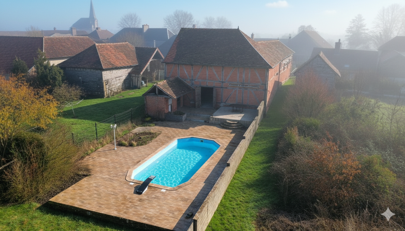 À l'extérieur, un cadre privilégié : piscine creusée, terrasse tournée vers la nature et coucher de soleil en toile de fond.