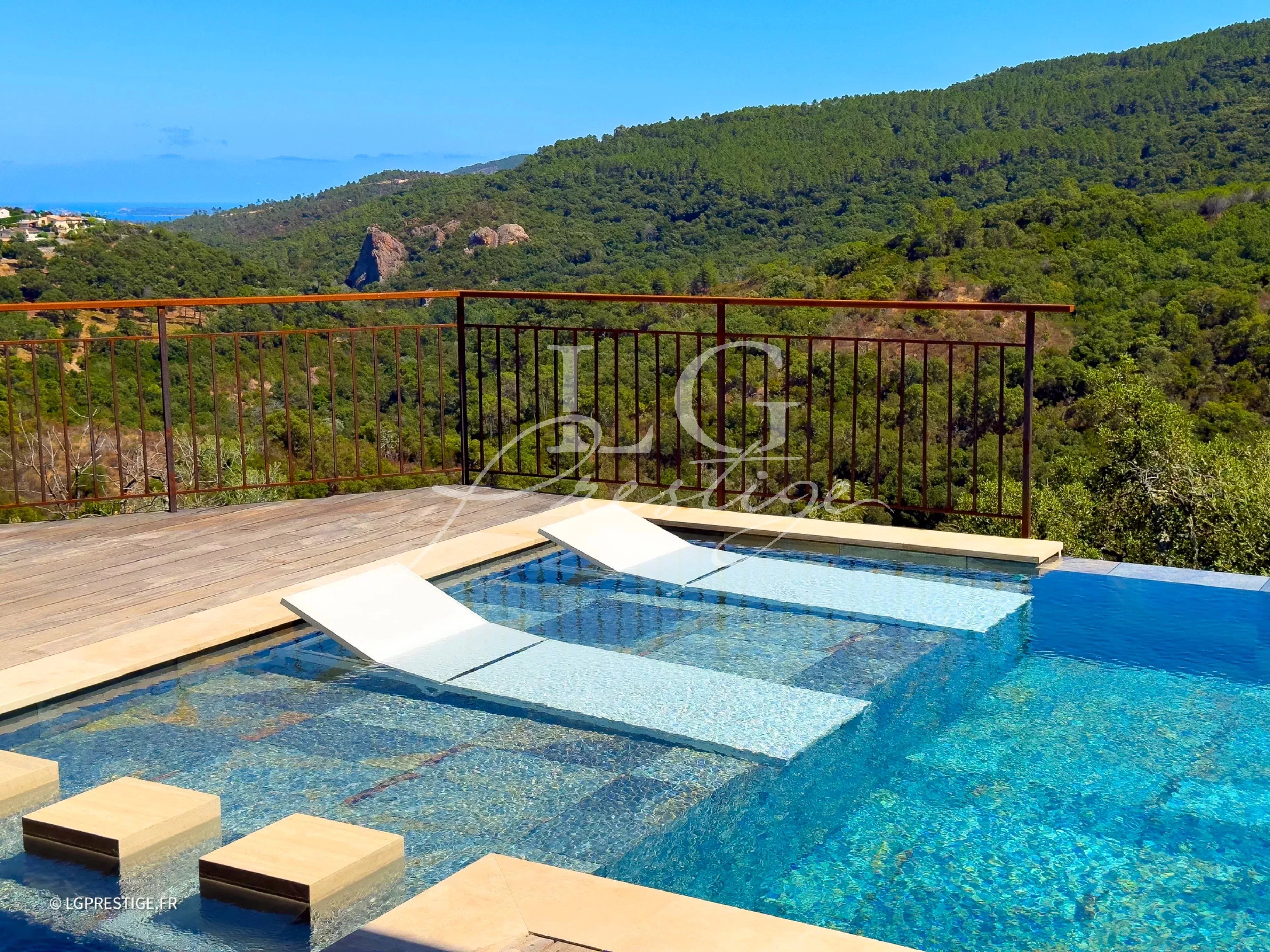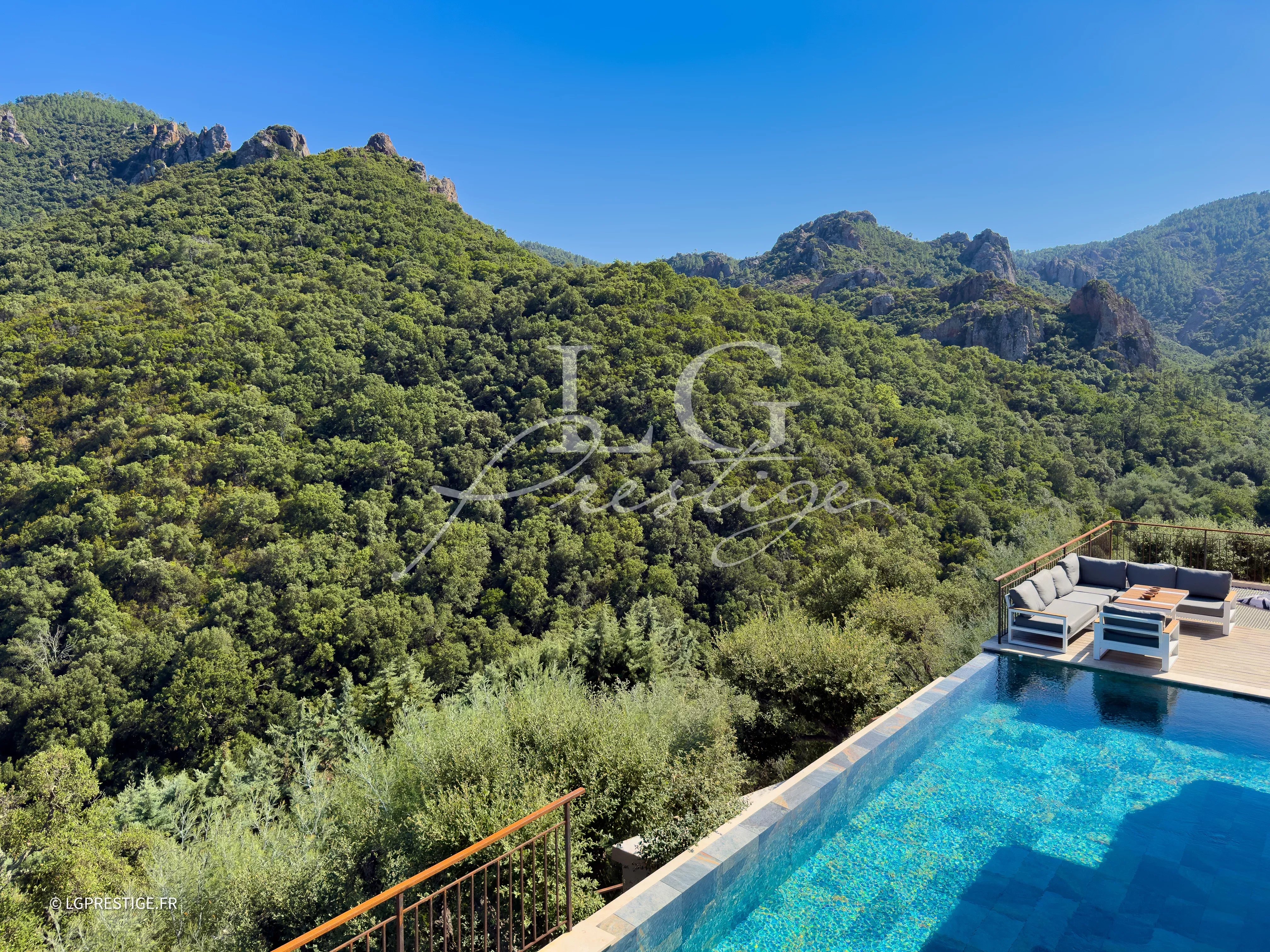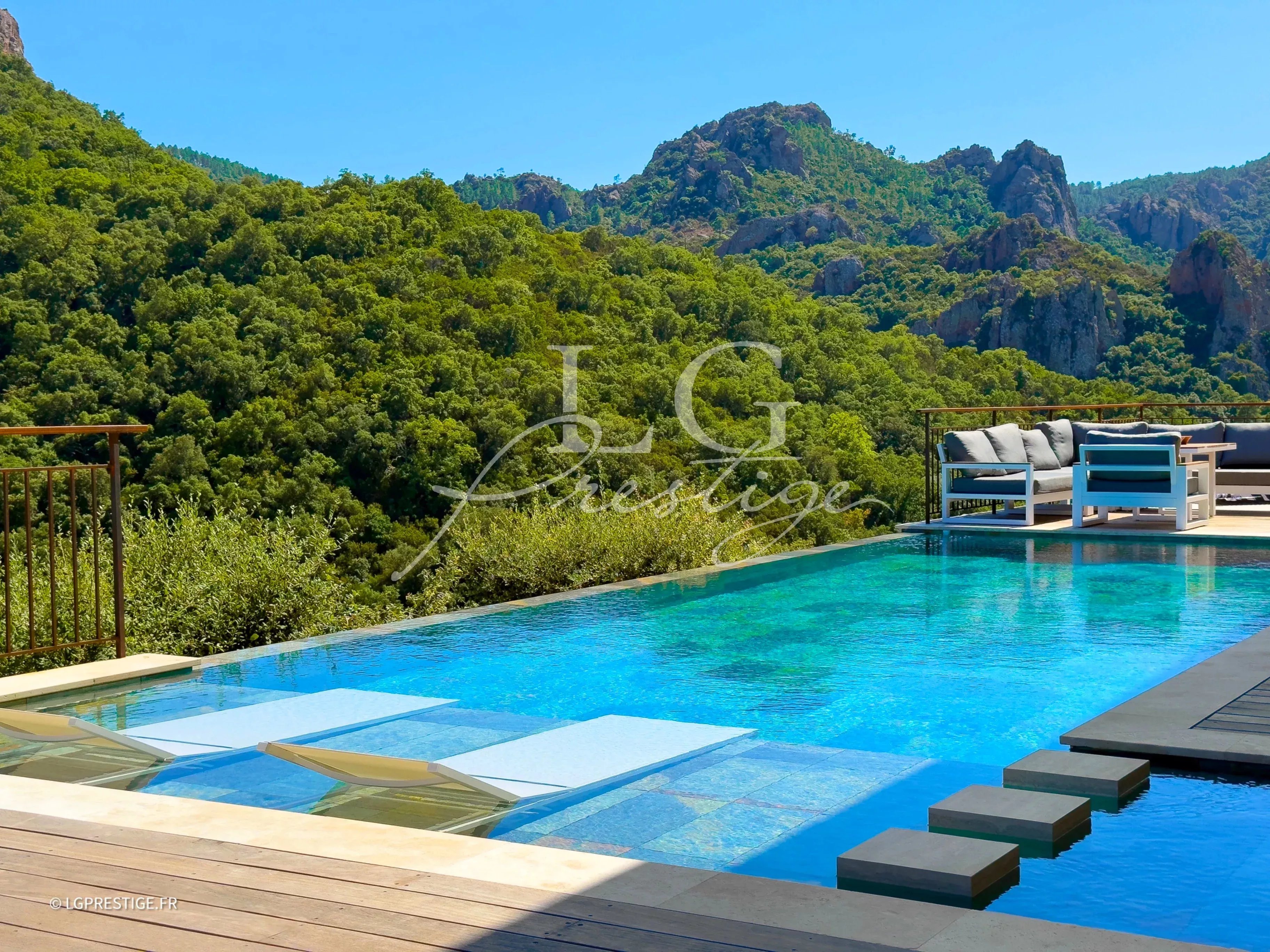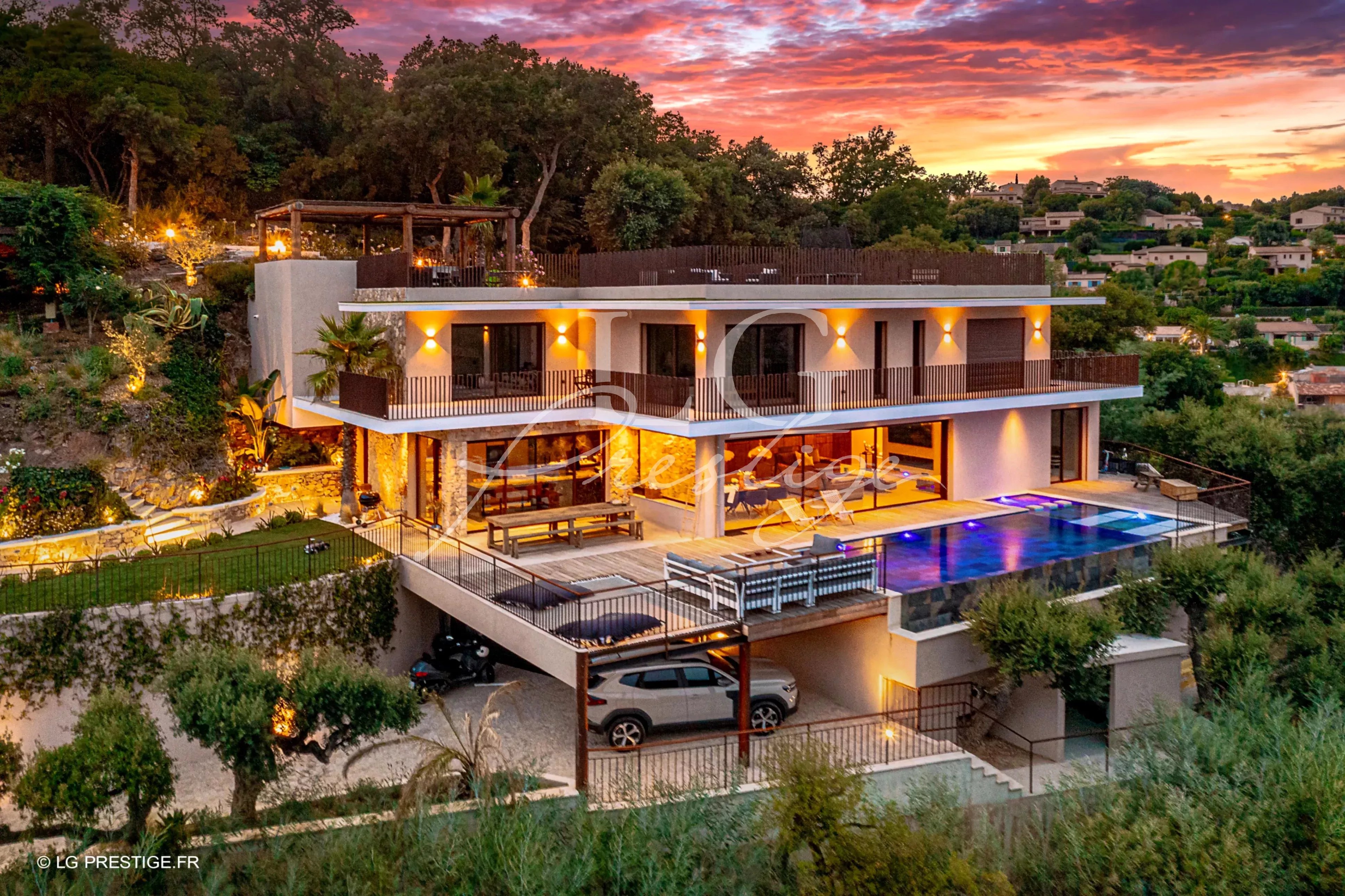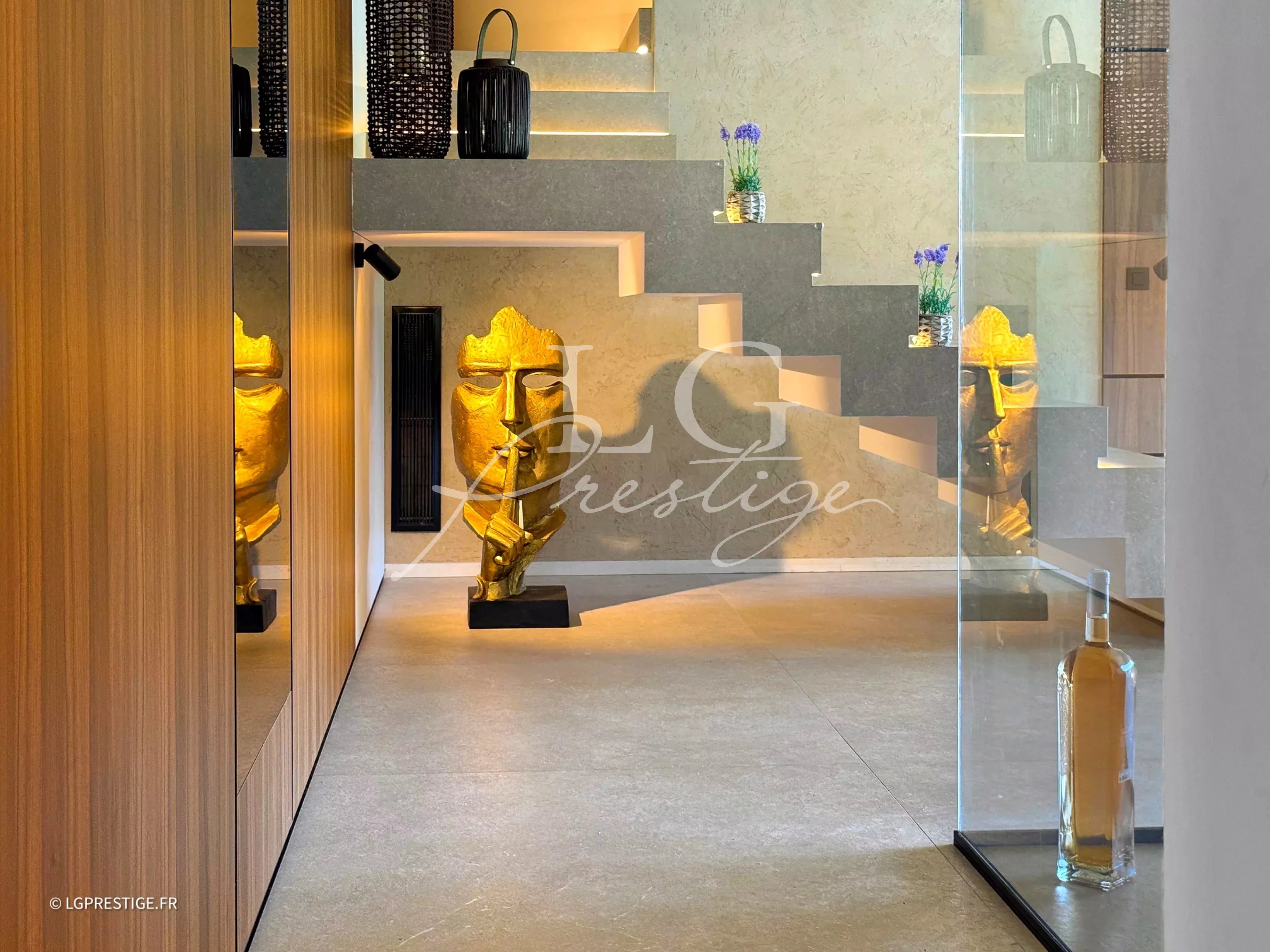 Dans un domaine privé et sécurisé à 10 minutes des plages de MANDELIEU-LA-NAPOULE, Sublime villa de prestige d’exception, nichée au cœur d'un environnement paisible et verdoyant, à l’abri des regards. Parfaitement pensée pour accueillir une grande famille ou un amateur de sport, cette propriété dispose de prestations haut de gamme ainsi que des espaces de vie lumineux. Le rez-de-chaussée se compose d’une entrée, d’un vaste séjour/cuisine équipée d’environ 100 m² ouvrant sur la terrasse et la piscine à débordement, d’un cellier, d’une buanderie, de toilettes invités, d’une chambre avec dressing et salle d’eau/wc. Le tout desservi par de beaux dégagements et finitions soignées. L’étage accueille 4 chambres, dont plusieurs suites avec salle d’eau ou salle de bains, des dressings, et un grand dégagement. Vous y trouverez aussi une salle de cinéma entièrement équipée de 24 m² pour des soirées en famille, ainsi qu’une piscine intérieure chauffée pour votre sport quotidien. Le terrain de 2 000 m² est joliment arboré, offrant plusieurs espaces détente (jeux de boules…), de larges terrasses, un solarium sur le toit avec cuisine d’été et vue imprenable. Un garage double avec rangements supplémentaires ainsi qu’un abri permettent d’accueillir deux véhicules et un chalet indépendant de 31 m² (non compris dans la surface habitable) complètent ce bien. A vendre en Exclusivité dans votre agence LG Prestige Immobilier de Mandelieu-la-Napoule