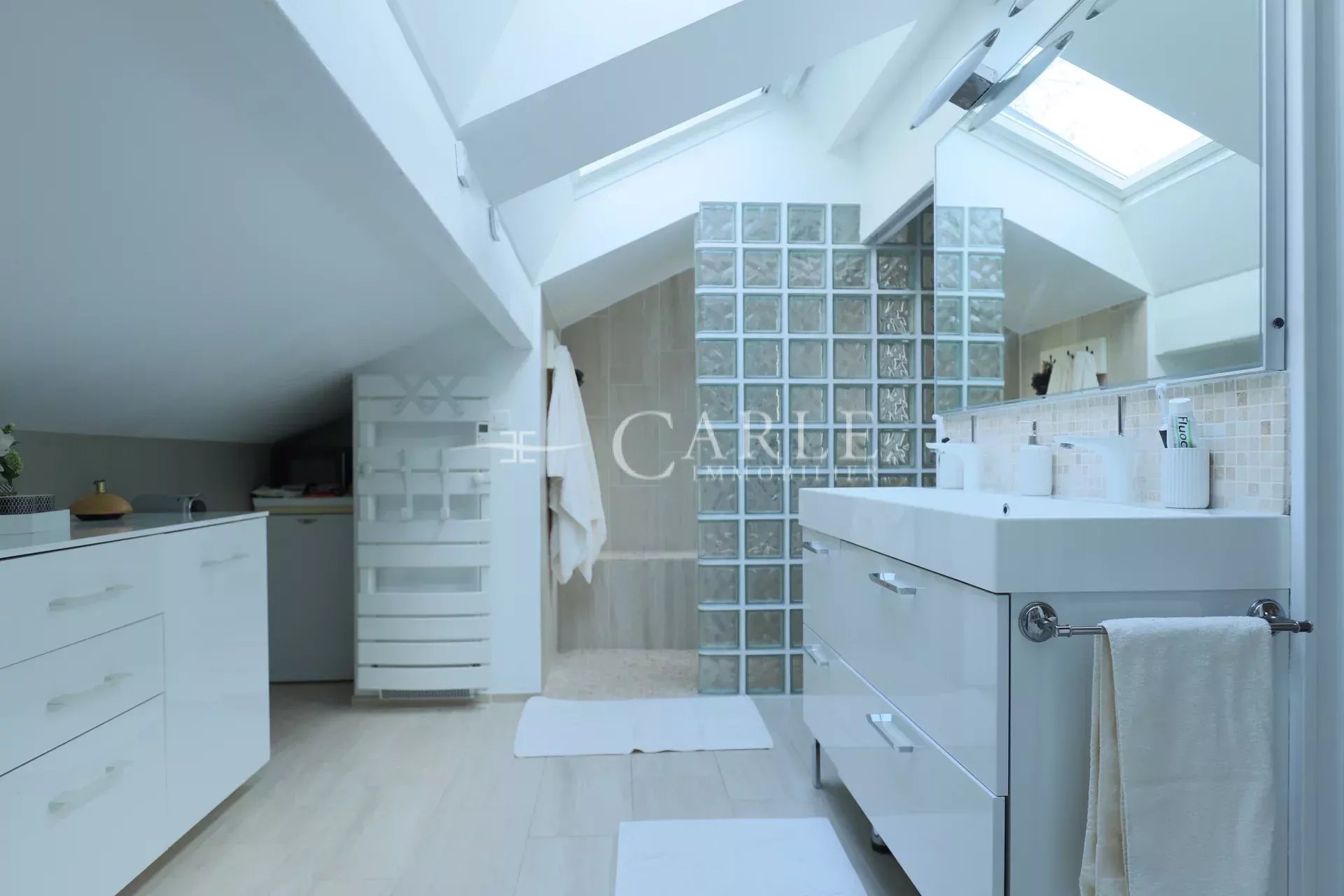 L'étage dispose d'une mezzanine ouverte sur le séjour, ainsi que d'une immense suite parentale de près de 70 m² composée d'un bureau, d'un salon lecture, d'une très grande chambre, de 2 dressings et d'une salle d'eau avec douche italienne.