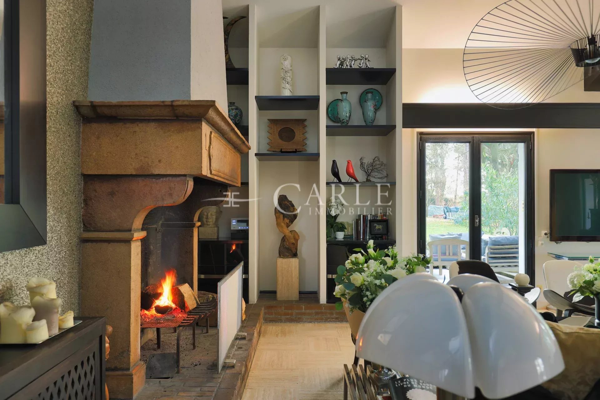 Entrez par un grand hall d'accueil ouvrant sur une belle pièce de vie de plus de 81 m² baignée de lumière et orientée plein Sud. Ce bel espace ouvert est composé d'un salon avec cheminée, d'une salle à manger et d'une cuisine ouverte.