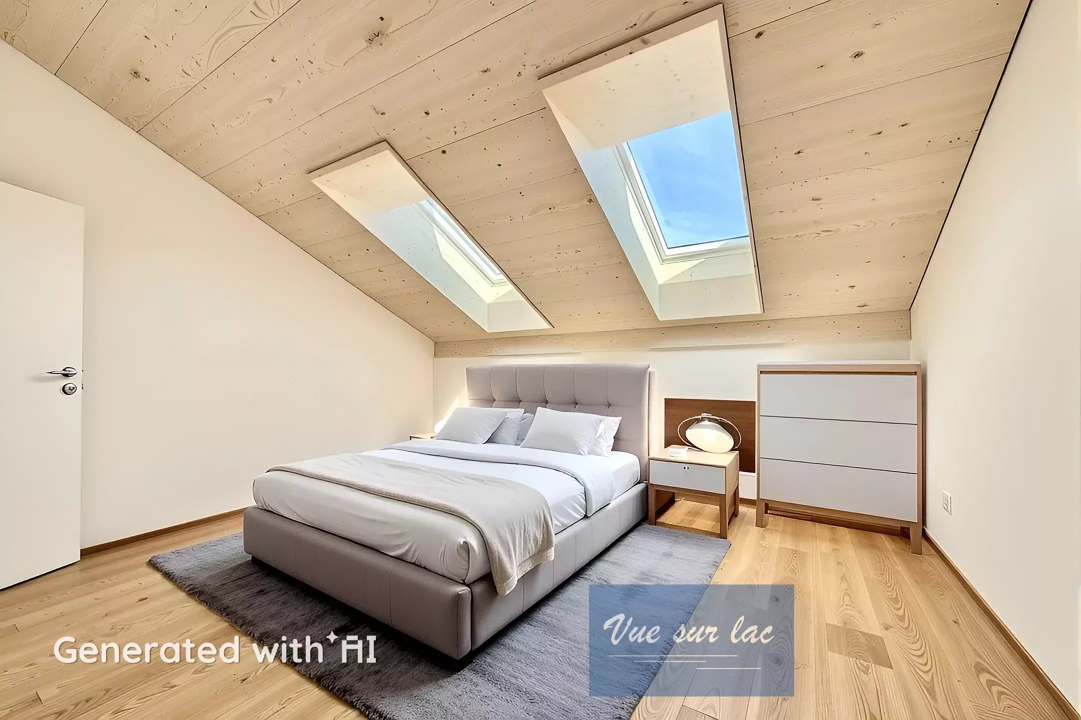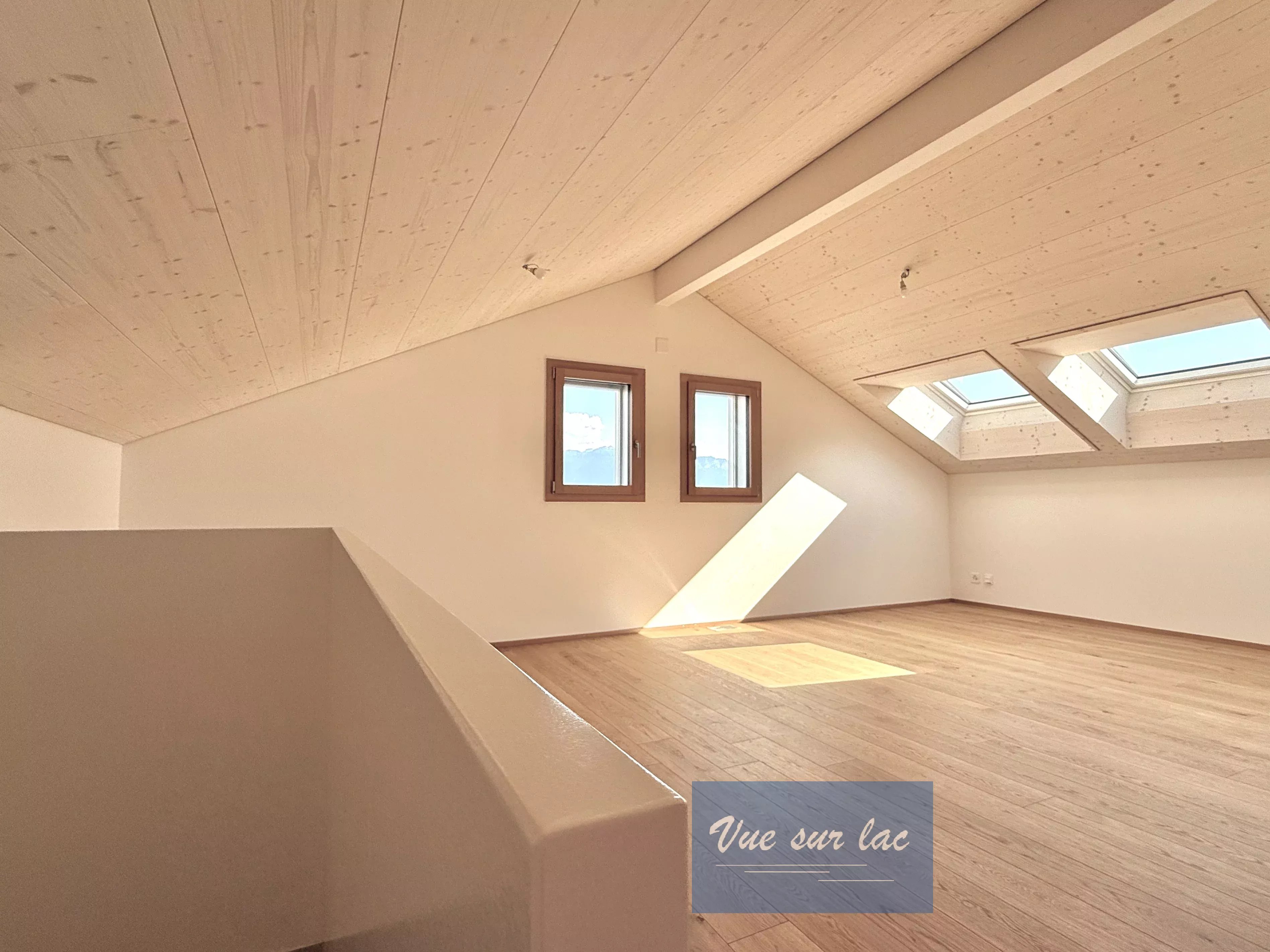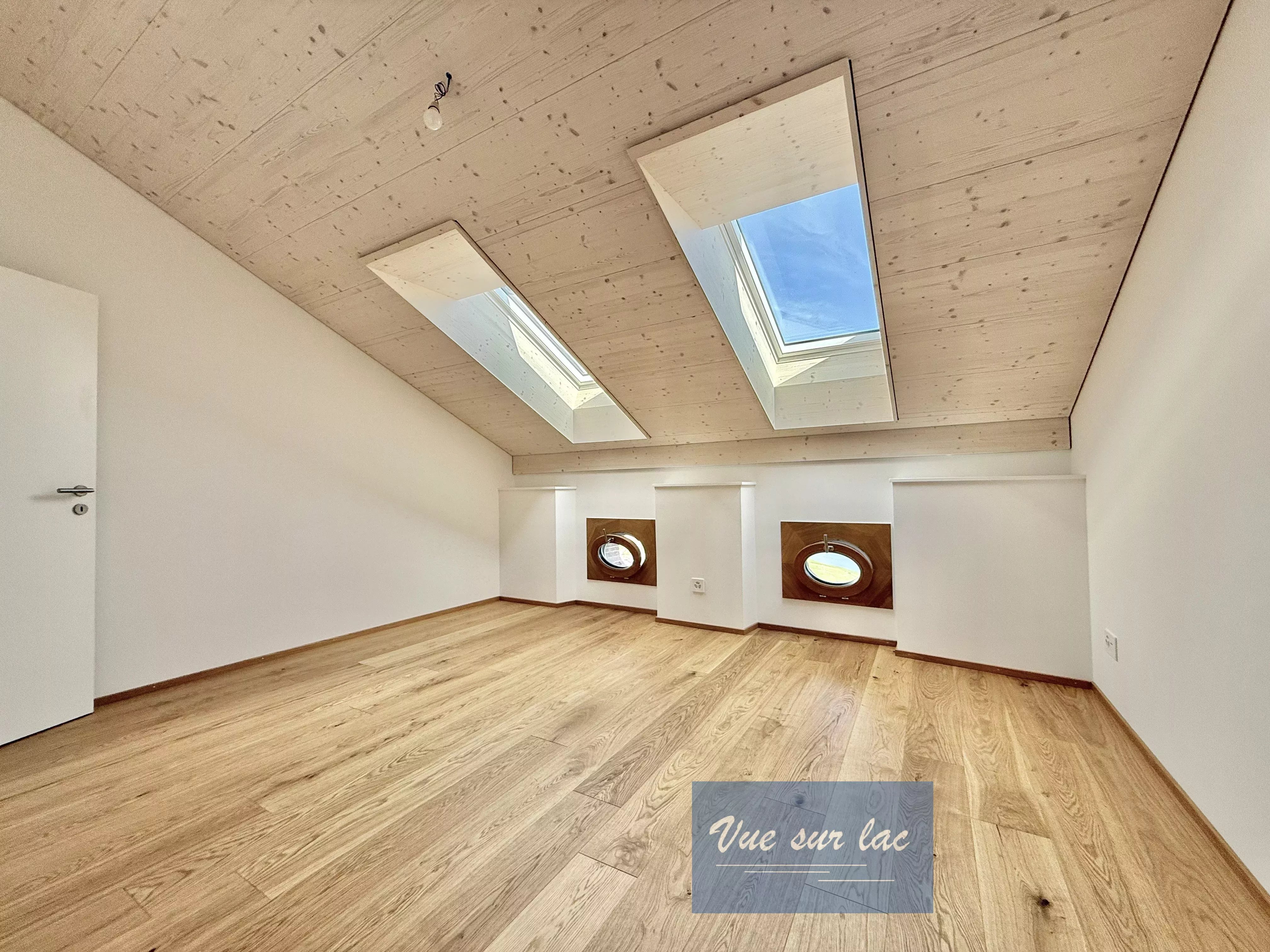 - 2 chambres Sud dont une avec dressing, vue sur le Lac et Alpes au travers de trois "oeil de boeuf" dont le chassis en bois est fait à l'ancienne, les V-Lux dans le toit apportent beaucoup de lumière