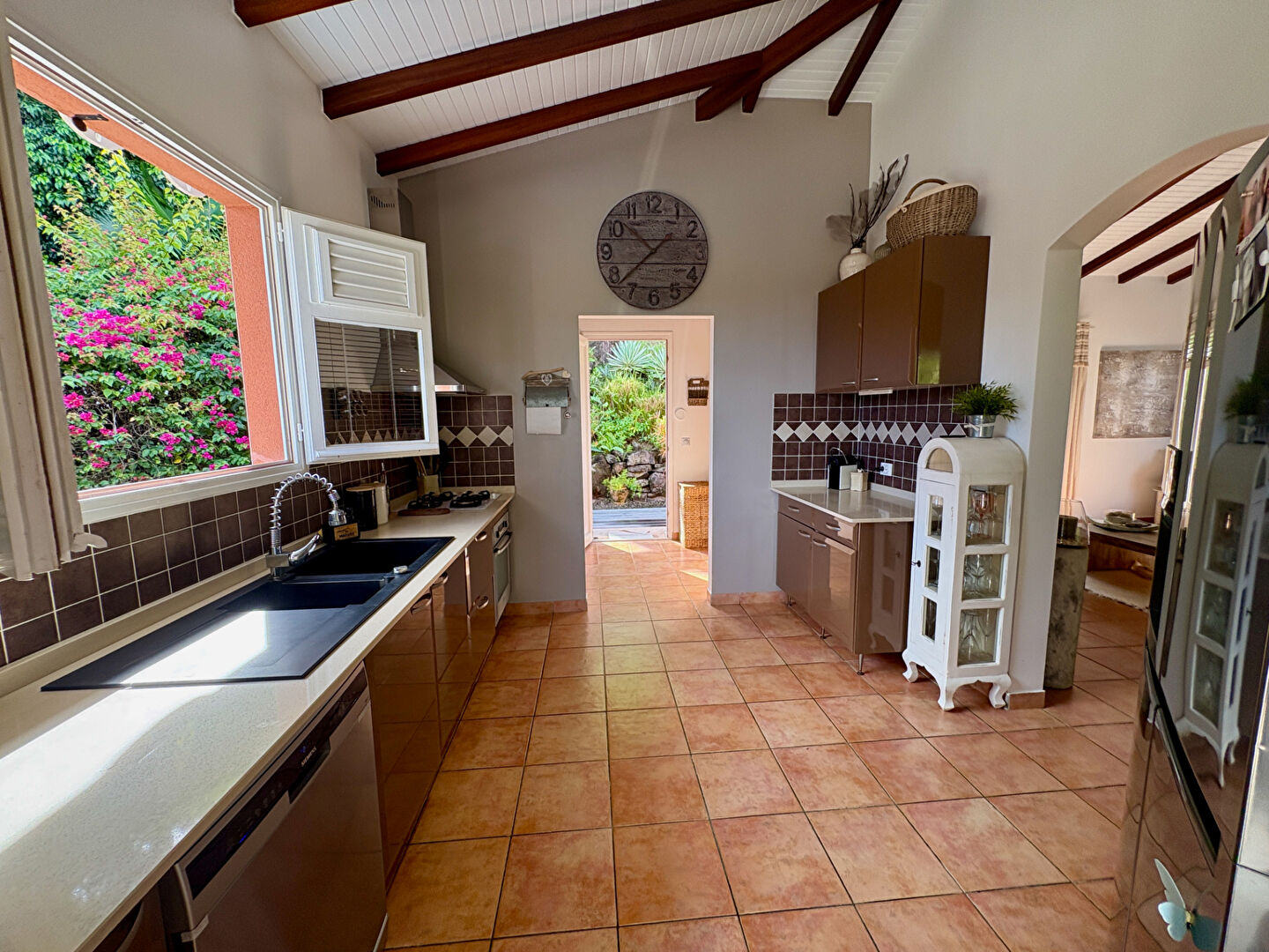 Dans les hauteurs du Vauclin, cette villa offre une vue imprenable sur l'océan Atlantique. Elle se compose d'un séjour spacieux, d'une cuisine aménagée avec arrière-cuisine, d'un couloir desservant deux chambres, un bureau pouvant faire office de chambre supplémentaire, un WC indépendant, une salle d'eau, une suite parentale avec dressing, chambre et salle d'eau privative avec WC. Le séjour s'ouvre sur une grande terrasse couverte, idéale pour la détente, donnant sur un jardin paysagé avec piscine, dans un environnement calme et privilégié. Prix HAI : 630.000 euros (dont 4 ,29% d'honoraires à la charge de l'acquéreur) Prix hors honoraires : 603.000 euros Les informations sur les risques auxquels ce bien est exposé sont disponibles sur le site Géorisques : www.georisques.gouv.fr (4.48 % honoraires TTC à la charge de l'acquéreur.)