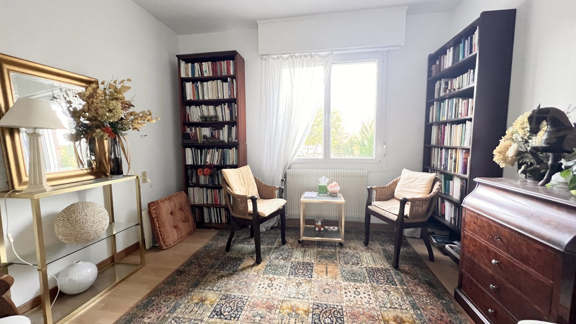 RDC : Séjour lumineux avec cheminée feu de bois, grande cuisine séparée, 3 chambres, bureau, SDB.