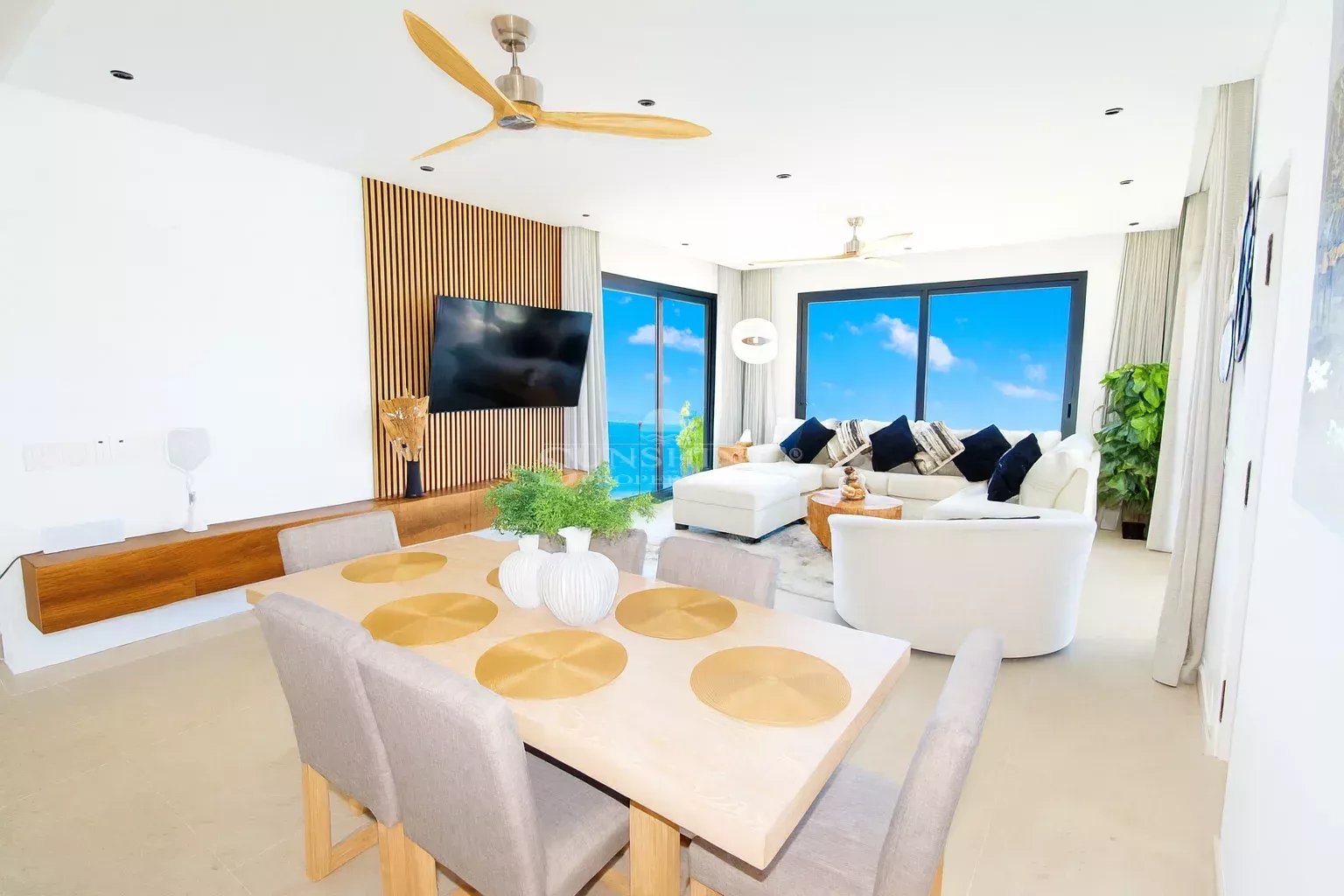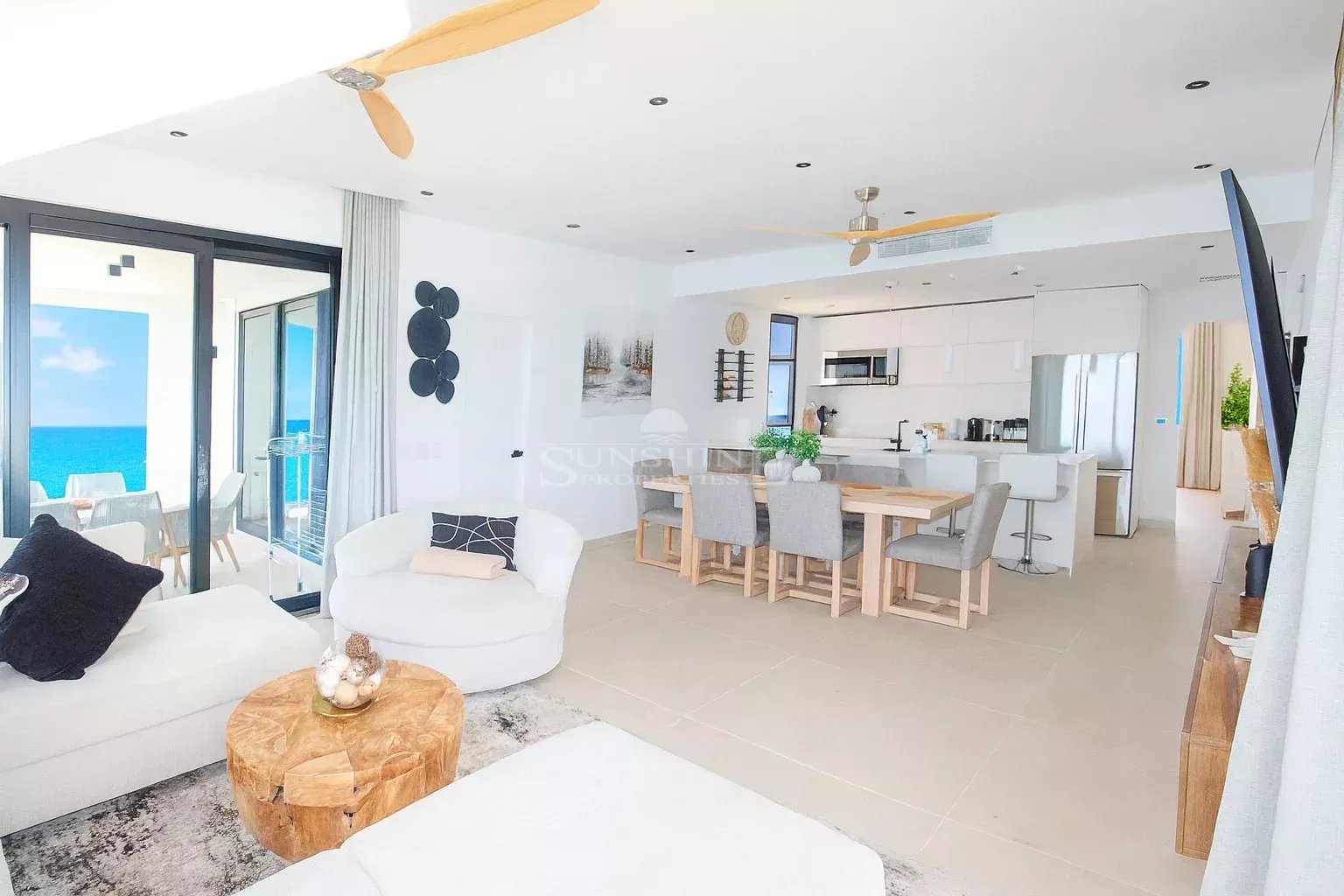 Ce appartement de 2 chambres et 2,5 salles de bains est entièrement meublé et décoré dans un style moderne. De grandes portes en verre laissent entrer la lumière naturelle et offrent une vue imprenable sur la mer. L'agencement ouvert relie harmonieusement la cuisine, équipée d'appareils électroménagers haut de gamme et dotée de plans de travail au design contemporain.