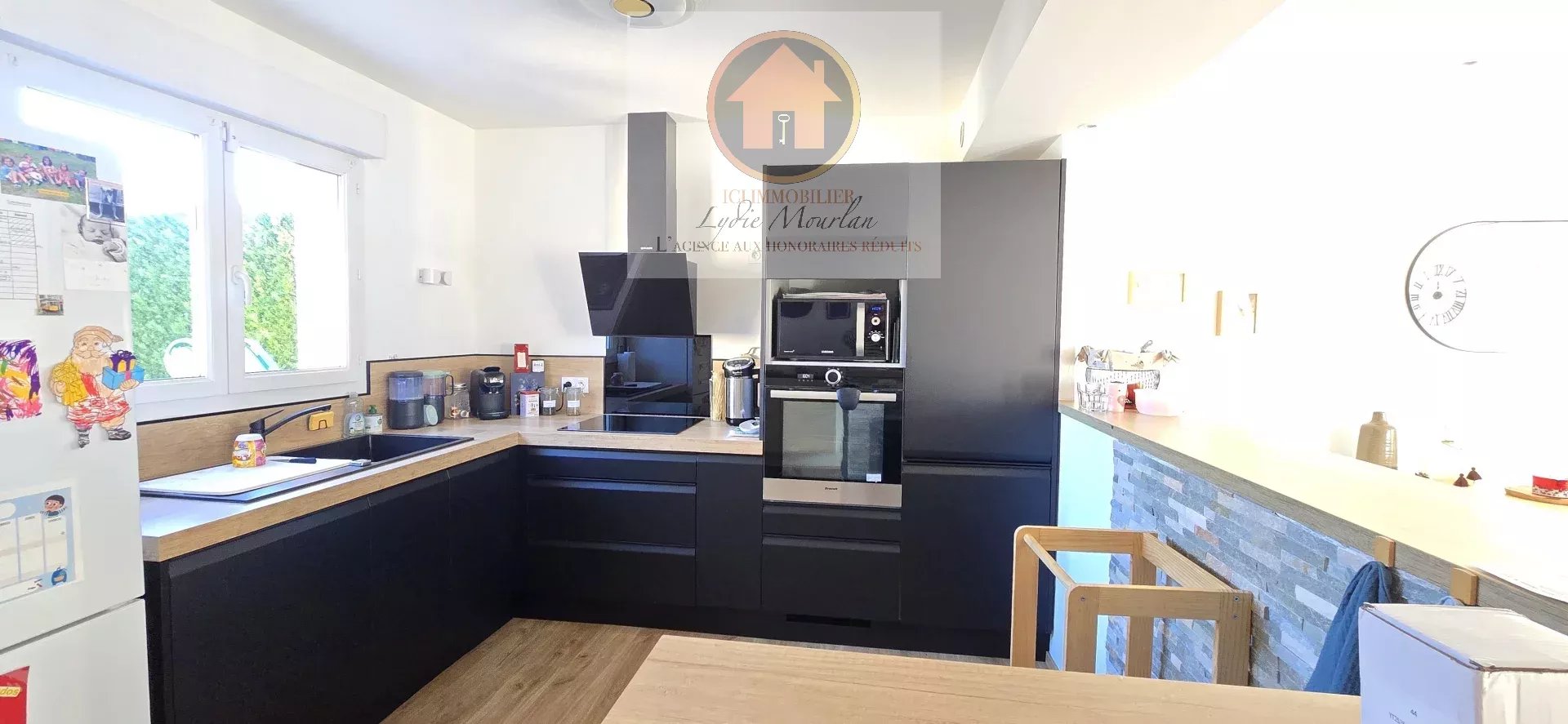 La pièce de vie d’environ 40 m², chaleureuse et lumineuse, accueille une cuisine ouverte entièrement équipée, offrant un bel espace de vie tourné vers un jardin sans aucun vis-à-vis.