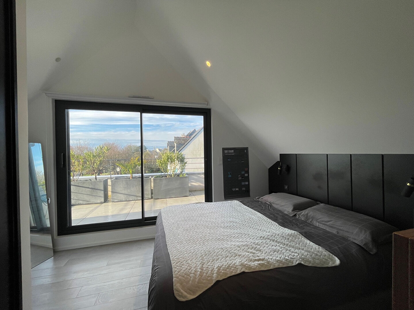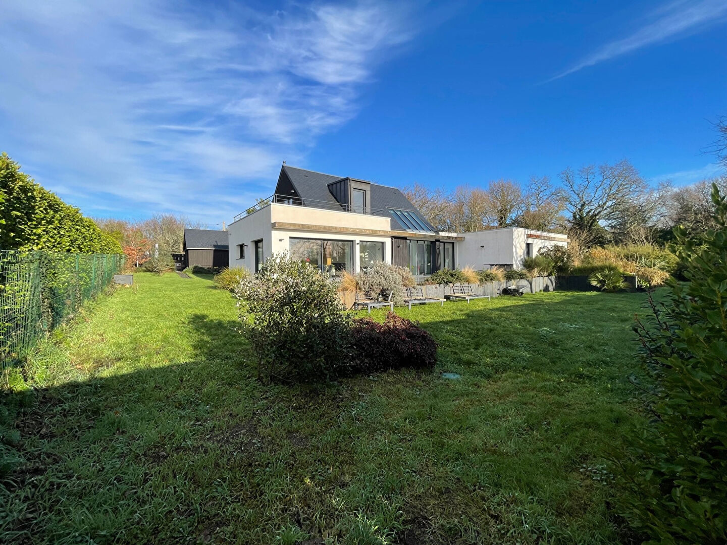 En exclusivité, Villadici vous propose de découvrir, à l'entrée d'un hameau confidentiel de quelques maisons seulement, cette remarquable maison d'architecte construite en 2021, située dans un environnement calme et privilégié, dont le chemin d'accès mène directement à une grande plage de sable fin. Développant environ 170 m² habitables , la propriété offre de très beaux volumes, une luminosité exceptionnelle et des prestations de grande qualité, le tout implanté sur un terrain clos et paysagé d'environ 1 450 m², avec garage, dépendances et 2 espaces pour le bien-être. Dès l'entrée, le ton est donné : lumière, élégance et confort. Au rez de chaussée, nous trouvons une entrée, une très grand pièce de vie d'environ 70m2 comprenant Salon, salle à manger et cuisine aménagée équipée. Un cellier contiguë à la cuisine, un wc avec lave-mains et accès direct à un garage d'environ 30m2 viennent parfaire cette première aile.. Dans l'autre aile, nous avons un couloir qui distribue une buanderie, un wc séparé avec lave mains, une chambre avec sa salle d'eau et wc, une superbe suite parentale, composée d'un couloir privatif, d'une chambre master avec accès terrasse et spa, d'un dressing et d'une salle de bains avec baignoire et douche. A l'entrée du séjour, un escalier nous mène à une mezzanine lumineuse qui nous dévoile une petite vue mer, une chambre avec accès à une grande terrasse et sa salle d'eau. Un wc japonais séparé. Un bureau idéal pour le télétravail ou une pièce polyvalente. Un jardin clos paysagé d'environ 1450m2 avec une dépendance pour le Sauna. un abri de jardin. Taxe foncière 2025 est de 1741 euros. Assainissement individuel conforme. Maison sous garantie décennale. (architecte DPLG Lorient - Paris) A 500m à pieds de la plage, 5mn à pieds. A 10mn à pieds du ramassage scolaire. A 5Kms du Bourg de Tregunc (Écoles, Collège, Lycée, tous commerces, 3 grandes surfaces) A 7Kms de la très touristique Pointe de Trévignon. A 8Kms du Bourg de Nevez ( tous commerces, 1 grande surface) A 10kms de la Ville Close et de l'hypercentre de Concarneau. Un bien rare, alliant architecture contemporaine, confort haut de gamme et proximité immédiate du littoral, idéal en résidence principale comme secondaire. Les informations sur les risques auxquels ce bien est exposé sont disponibles sur le site Géorisques : https://www.georisques.gouv.fr/ Pour tout renseignement, contacter Thibaud Kempen au 06.07.79.57.38. Agent Commercial Indépendant (E.I) RSAC 523 682 268 (5.20 % honoraires TTC à la charge de l'acquéreur.) THIBAUD KEMPEN (EI) Agent Commercial - Numéro RSAC : 523 682 268 - Quimper.