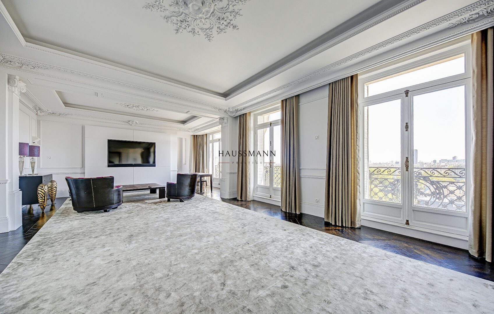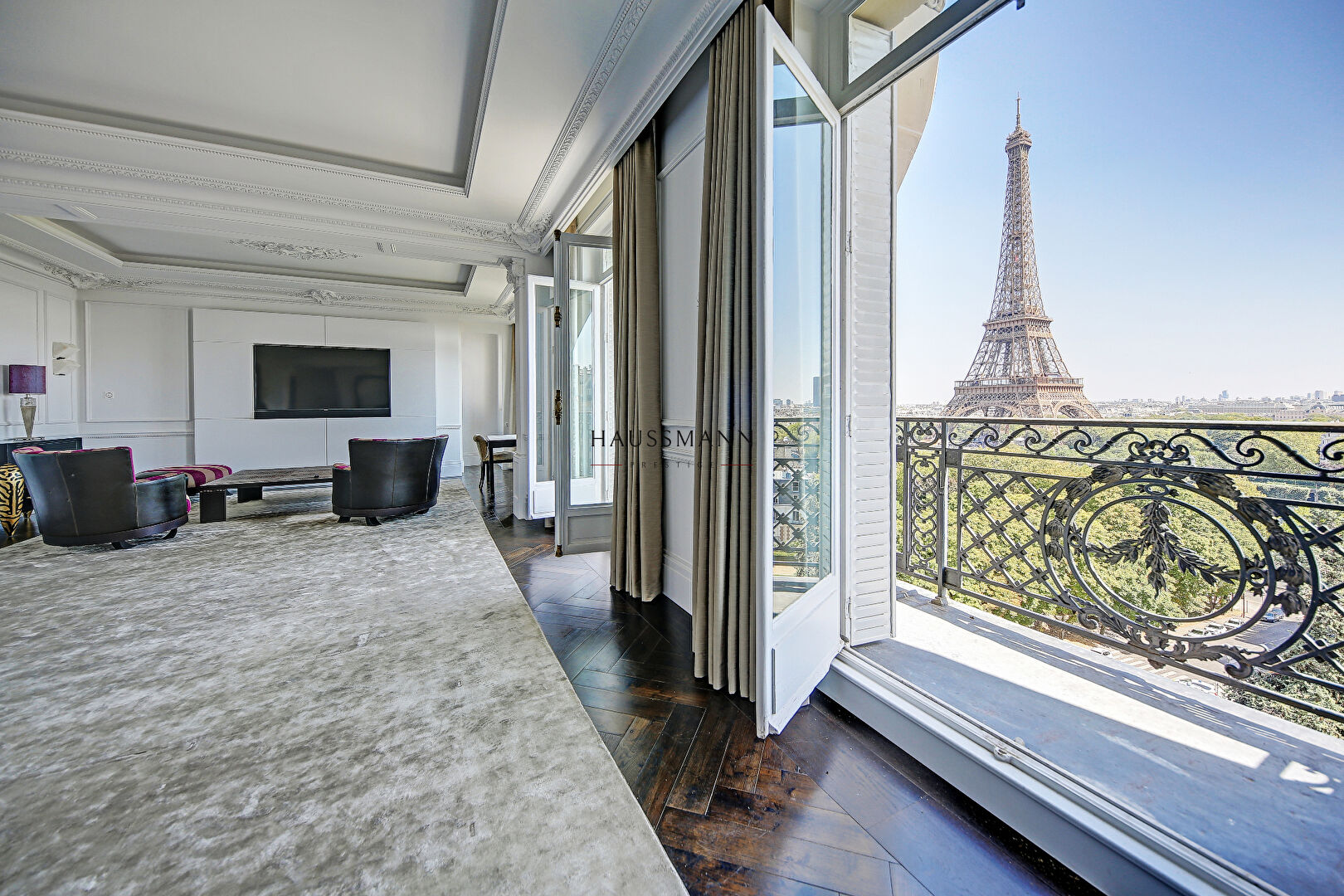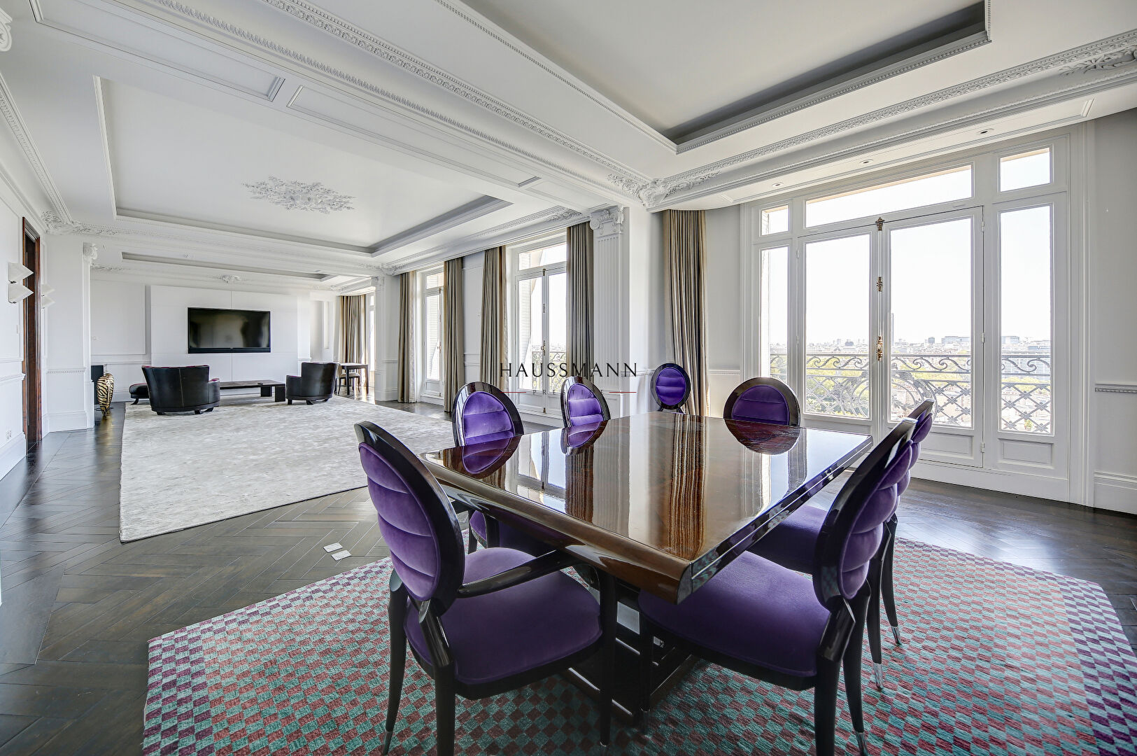 Trocadéro Dans un superbe immeuble haussmannien avec ascenseur et gardien, cet appartement de 288,6 m² offre une vue unique et exceptionnelle sur la Tour Eiffel de plain pied, la Seine et les jardins du Trocadéro, sans aucun vis-à-vis. L'appartement s'ouvre sur une belle entrée donnant accès à un vestibule, une majestueuse recpetion avec balcon offrant une vue spectaculaire sur la Tour Eiffel, une salle à manger, une pièce de réception avec îlot central et cave à vin, ainsi qu'une cuisine indépendante aménagée et équipée avec office, Trois chambres en suite sont disponibles dont une suite parentale avec la sublime vue Tour Eiffel depuis le lit de 40 m² avec double dressing Madame, Monsueur, salle de bains,douches,wc. L'appartement est vendu avec 3 emplacements de parking. Deux caves. 3 chambres de service. Copropriété de lots Honoraires Inclus charge vendeur Les informations sur les risques auxquels ce bien est exposé sont disponibles sur le site Géorisques : www.georisques.gouv.fr