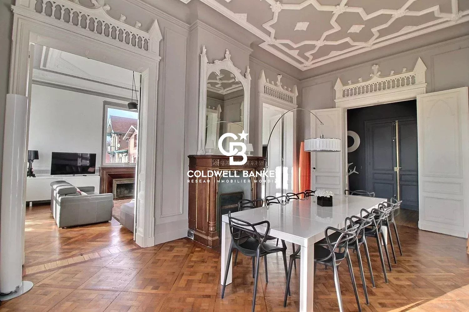 Situé dans l'une des plus imposantes Villa Historique d'Arcachon, dans un environnement paisible et arboré, à deux minutes seulement à pieds de la plage, cet appartement vous séduira par sa rareté et ses prestations luxueuses. Se vit comme une maison et bénéficie d'une luminosité hors pair grâce à son exposition plein Sud. Les pièces de vies sont spacieuses et lumineuses, la cuisine moderne équipée semi ouverte sur le salon, donnant sur une grande terrasse filante. La partie nuit se compose de 4 chambres dont 3 avec salle de bains privative, 2 chambres cabine aménagées et une salle d'eau familiale. Une cave ainsi que deux garages fermés complètent ce bien d'exception. Surface carrez : 194m² DPE F (357) GES C (12) Estimation des couts annuel d'énergie : 4150€ - 5615€ Bien en copropriété, 7 lots principaux, absence de procédures en cours. 1 795 000€ FAI, dont 70 000€ d'honoraires d'agence à la charge des acquéreurs soit 4%. Proposée par Marina Tonneau, Retrouvez tous nos biens sur IMMOBA. Les informations sur les risques (naturel, miniers, technologiques) auxquels ce bien est exposé sont disponibles sur le site Géorisques : georisques.gouv.fr