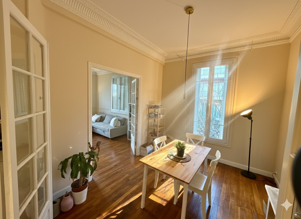 Au coeur du Parc Impérial, découvrez ce superbe appartement de 4 pièces de 80 m² situé au premier étage d'une adresse de caractère. Ce bien d'exception s'ouvre sur une entrée élégante qui distribue une cuisine ouverte fonctionnelle. La pièce de vie principale, comprenant un salon et une salle à manger baignés de lumière grâce à une exposition Sud-Ouest, est sublimée par un authentique parquet massif en chêne et des détails de plafond soignés avec moulures avec accès à un petit balcon privatif également disponible. L'espace nuit se compose de deux chambres, dont une de très grande taille exposée plein Sud. Pour votre confort, l'appartement est équipé d'une climatisation gainable intégrale, d'un double vitrage performant et d'un chauffage individuel au gaz par chaudière. Ce bien dispose d'une salle de bain et d'une salle d'eau séparées. Idéalement situé à proximité immédiate du quartier Libération, de ses halles gourmandes et de ses transports (tramway et bus), ce bien en très bon état est complété par une cave. Les charges de copropriété sont maîtrisées à 130 EUR par mois. Contactez M. DOMINGO Olivier au 06 16 94 40 97 dès maintenant pour organiser une visite et découvrir tout le charme de cette propriété unique. « Les informations sur les risques auxquels ce bien est exposé sont disponibles sur le site Géorisques : www.georisques.gouv.fr » 1.Informations LOI ALUR :