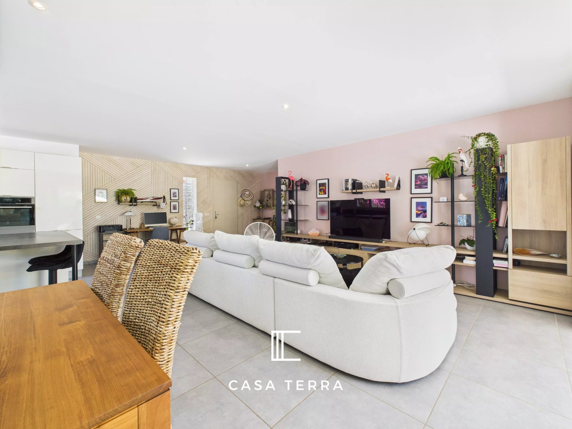 une pièce de vie pour un total de 54 m² composée d'un salon-séjour et d'une cuisine ouverte, entièrement équipée donnant accès à un cellier/buanderie,
