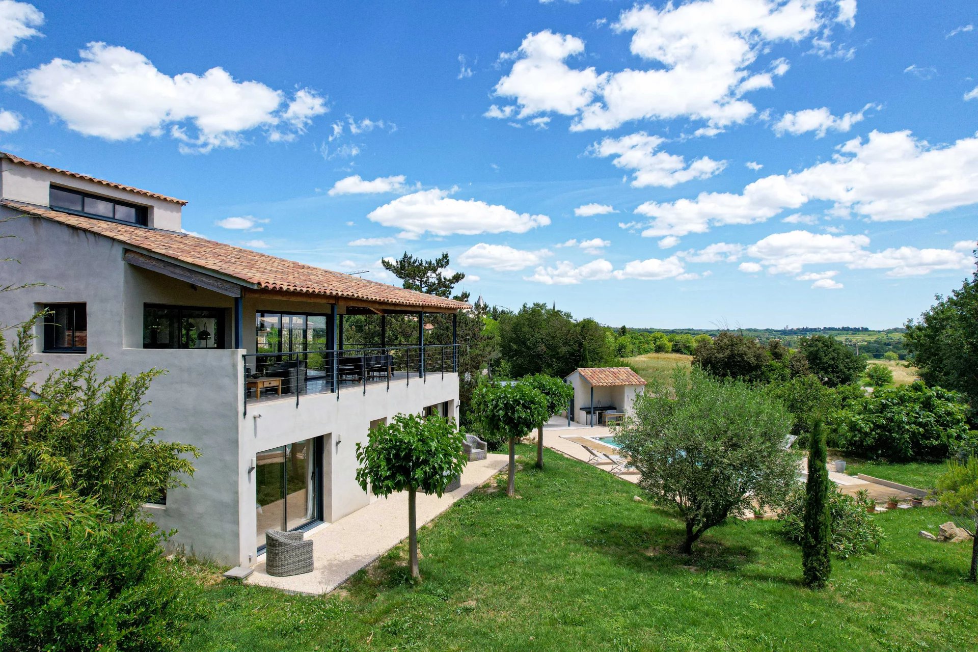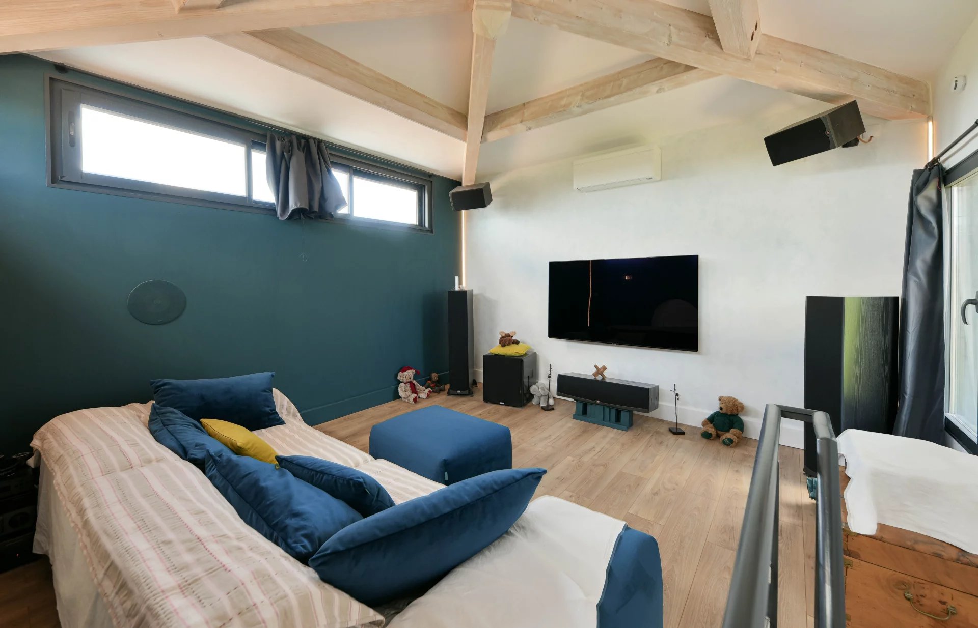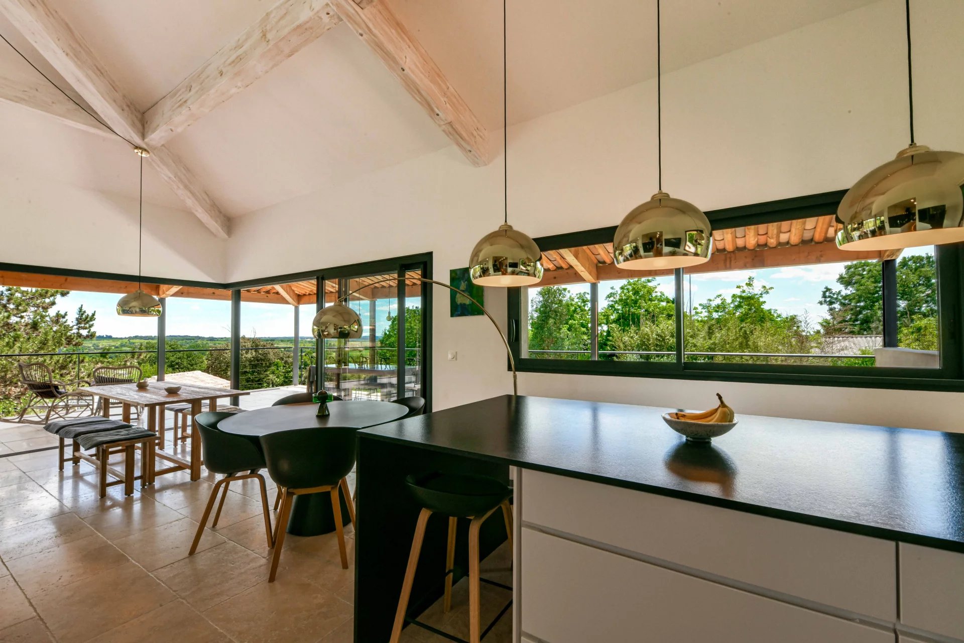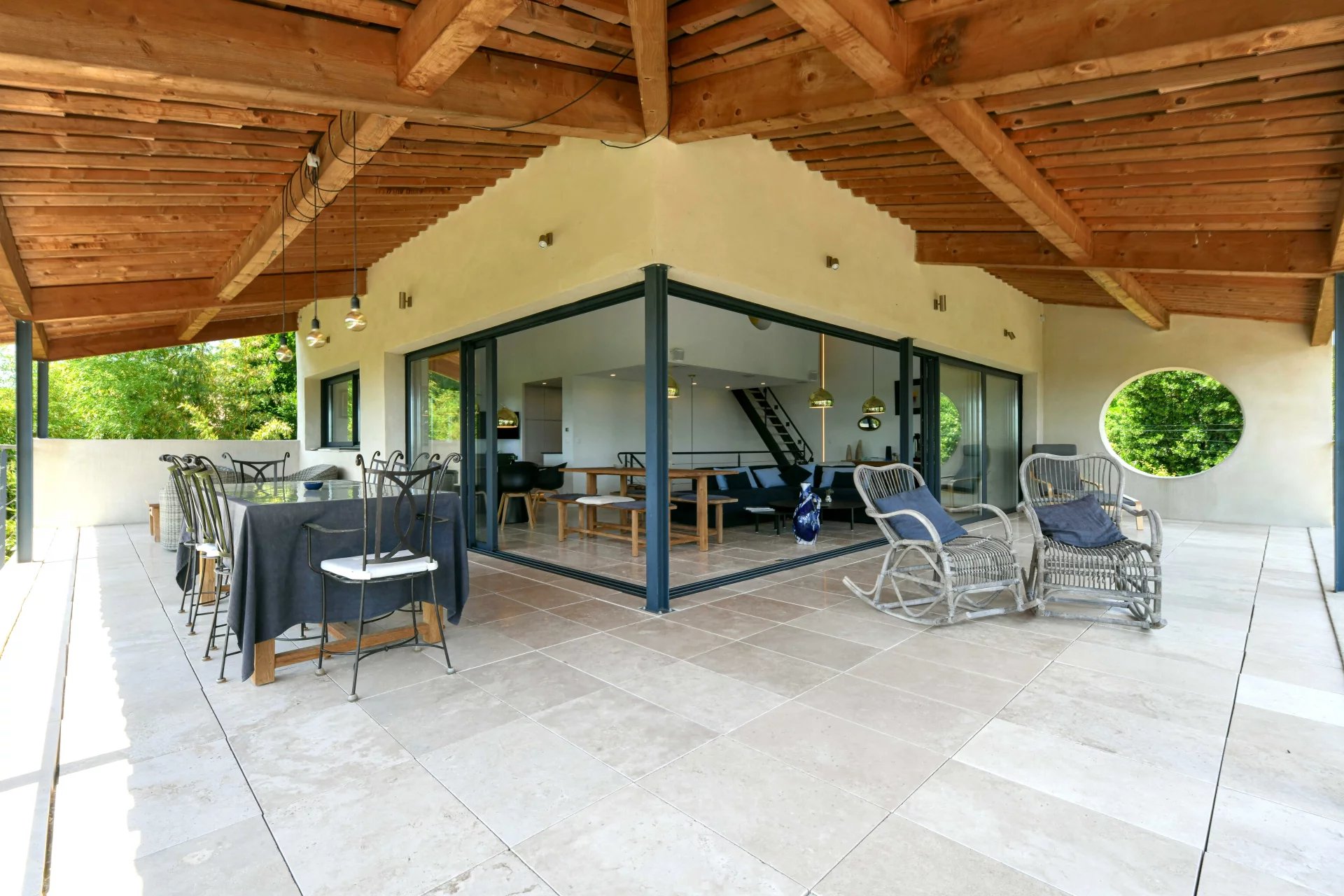 Superbe ensemble de réception ouvert sur une terrasse avec vue panoramique. 3 chambres, 4 salles de bains, large bureau ou salon de télévision. Parc arboré offrant de nombreux espaces. Piscine et pool house. Matériaux de grande qualité. Double carport, atelier
