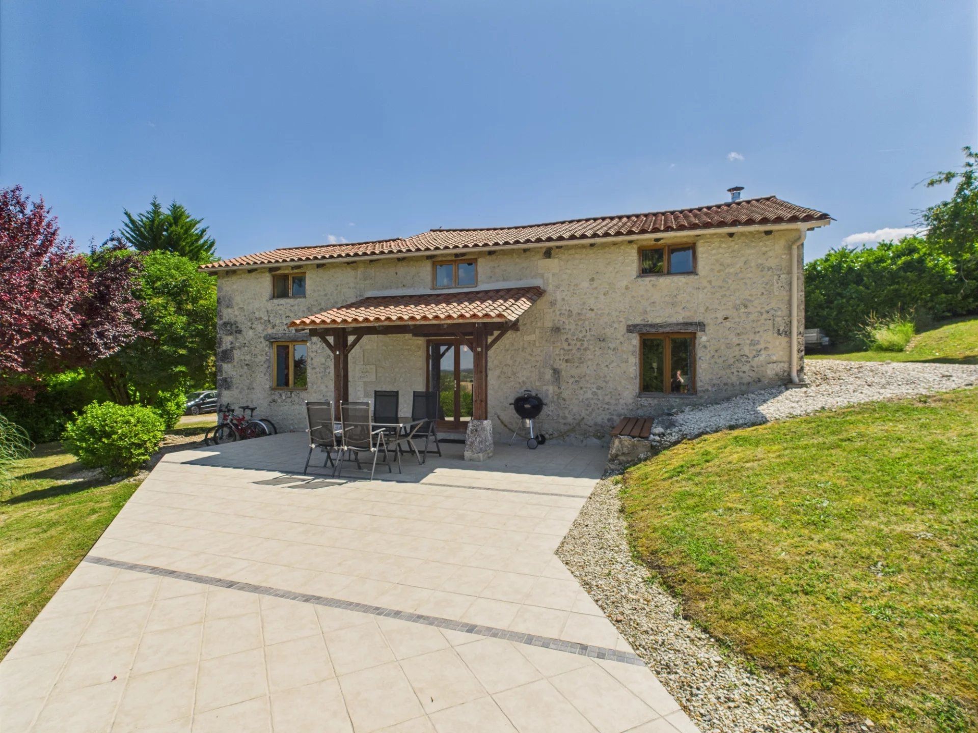 EN EXCLUSIVITÉ! Jolie maison individuelle en pierre, agrandie et rénovée par les propriétaires actuels, située dans un quartier prisé et pratique. Le logement extrêmement bien présenté comprend au rez-de-chaussée un grand salon comprenant un coin repas et une cuisine, ainsi qu'une chambre double et une superbe salle de douche attenante. Au premier étage, deux autres chambres doubles et une salle de bains rénovée. L'extension récente à l'arrière crée une jolie cour fermée et offre un excellent atelier. Il y a également un débarras et un abri de jardin. À l'extérieur, le terrain de 4 389 m² comprend une piscine, des espaces extérieurs à l'avant et à l'arrière, ainsi que de vastes pelouses et arbres fruitiers. La situation dominante de la propriété offre une vue imprenable depuis le jardin à l'avant et la piscine. Commodités à moins de 7 km : gare TGV d'Angoulême à environ 44 km et aéroport de Bergerac à environ 80 km.