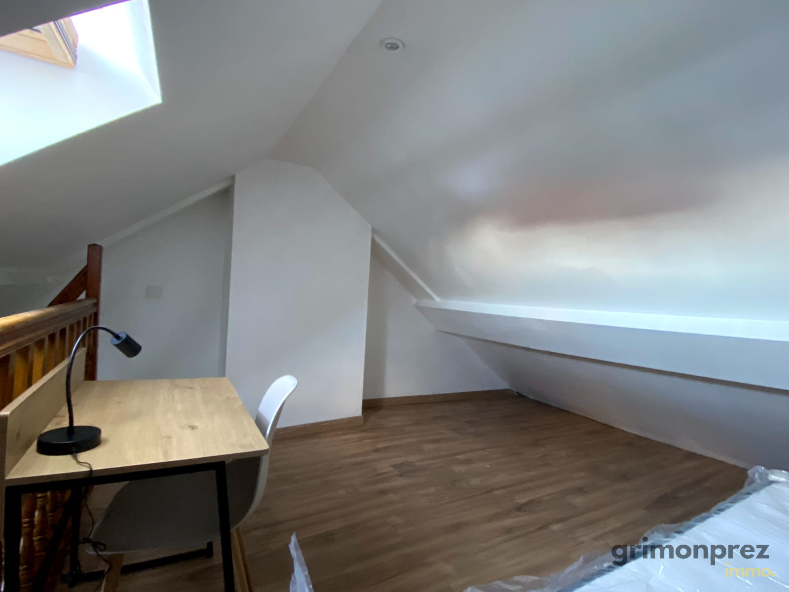 Grimonprez Immo vous propose cette chambre en colocation de 14m2, intégralement meublée avec une mezzanine, dotée d'une douche ainsi que d'un WC privatifs dans une maison rénovée située à Roubaix, à moins de 10min à pieds de la station de tram 'Jean Moulin' et du métro 'Charles de Gaulle'.