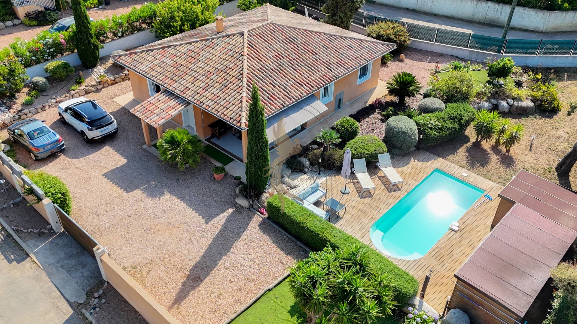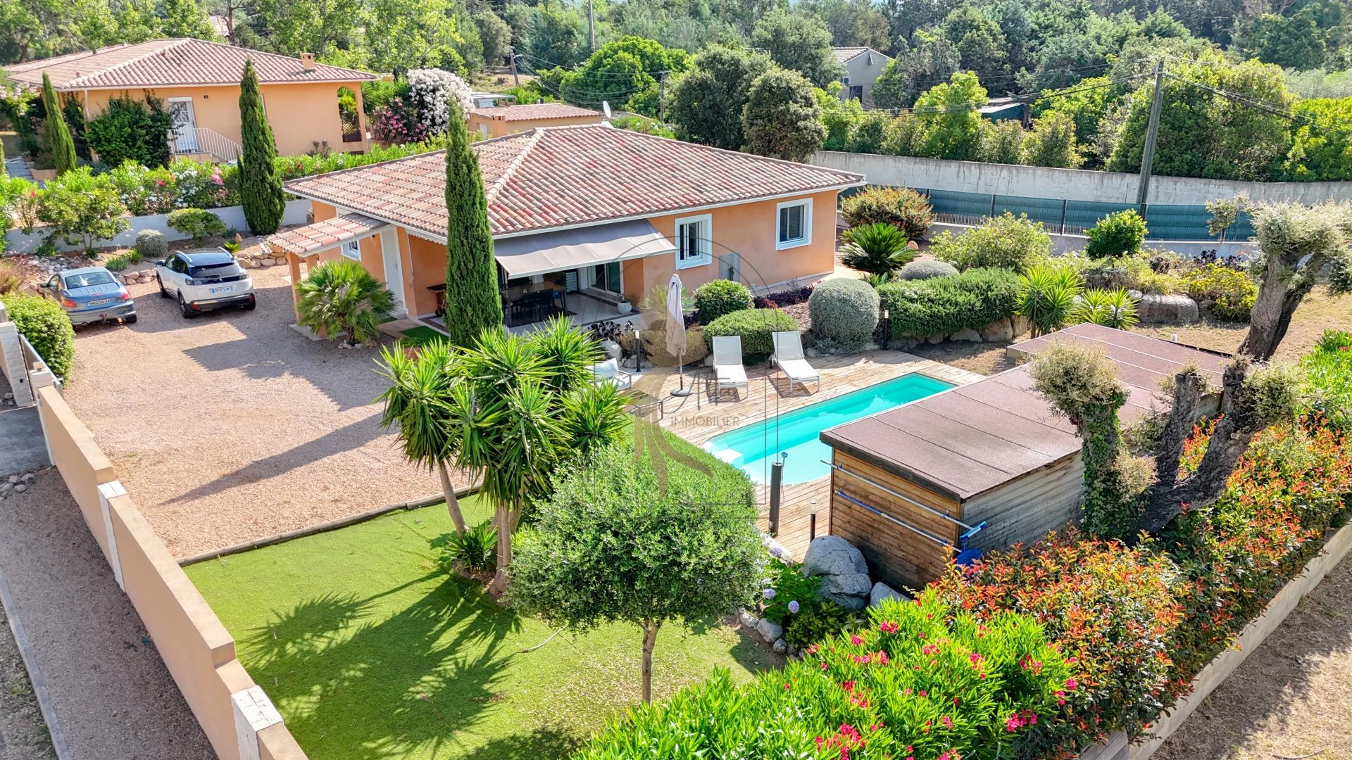 Située au calme, sur la commune de Sainte Lucie, à moins de 10 minutes de la superbe plage de Pinarello, cette agréable villa de plain-pied construite en 2012 saura vous séduire par son environnement et ses prestations. D’une surface habitable de 100m2 environ, elle se compose d’une pièce de vie lumineuse avec cuisine ouverte sur le salon-séjour, s’ouvrant sur une belle terrasse couverte de 20 m² idéale pour les repas d’extérieur. La partie nuit offre 3 chambres, dont une suite parentale avec salle d’eau attenante. À l’extérieur, vous profiterez d’un magnifique terrain arboré de 1049 m² planté d’arbres fruitiers, entièrement clôturé et sécurisé par un portail électrique. La propriété permet également de stationner jusqu’à 4 véhicules à l’intérieur. La piscine (7,5 m x 3 m) vient compléter cet agréable cadre de vie.