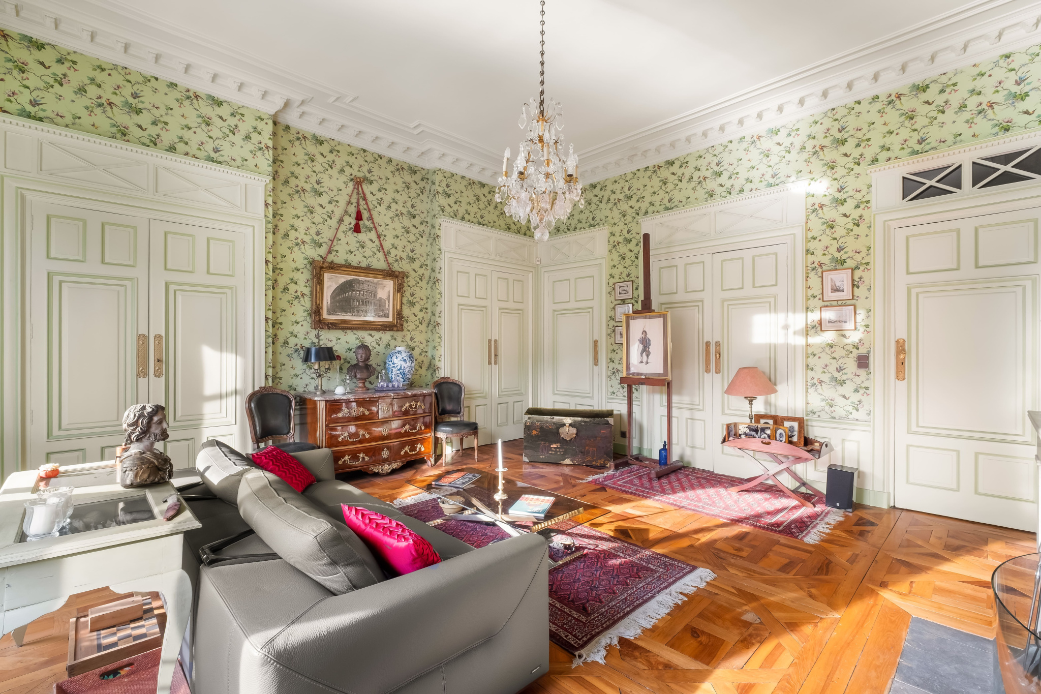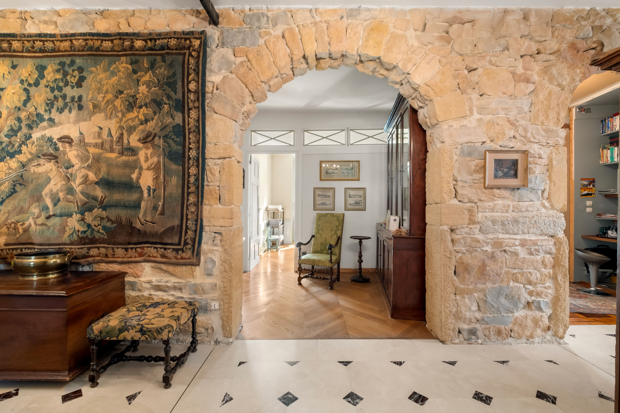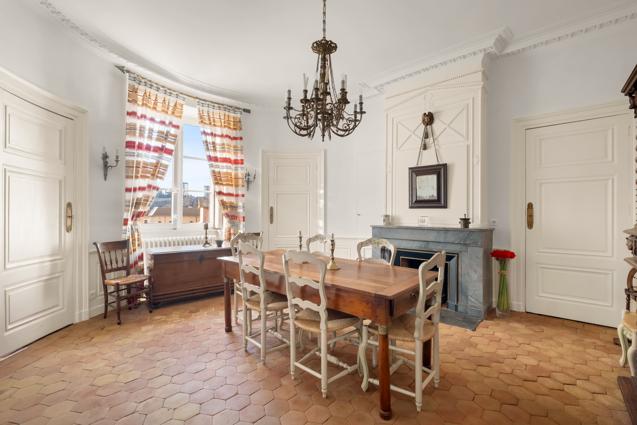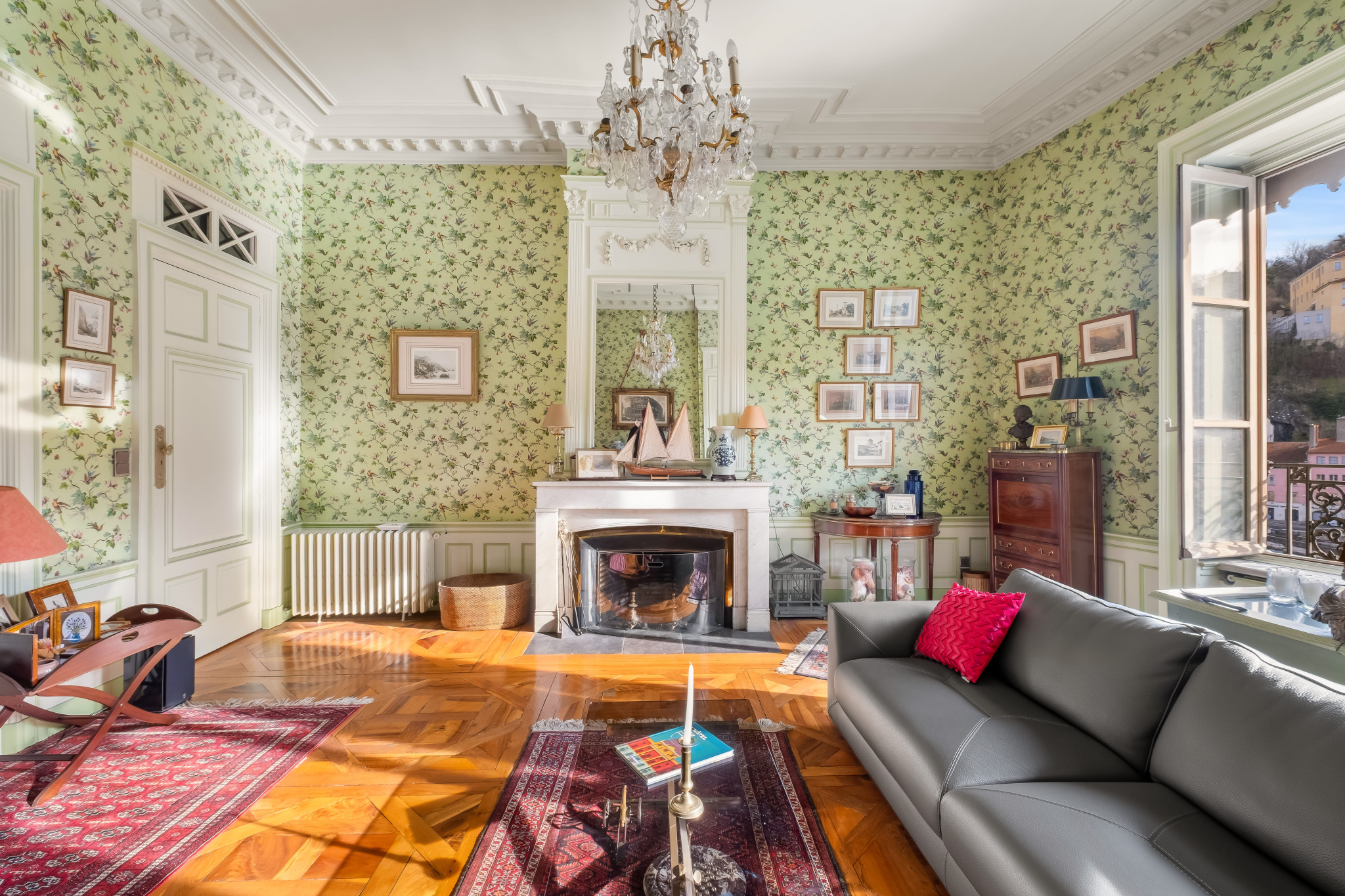Vous serez immediatements séduits par le charme de l'appartement (parquets d'Aremberg, stylobates, moulures, cheminées, mur en pierre), sa vue dégagée sur la Saône, son absence de vis-à-vis et sa luminosité (triple exposition).