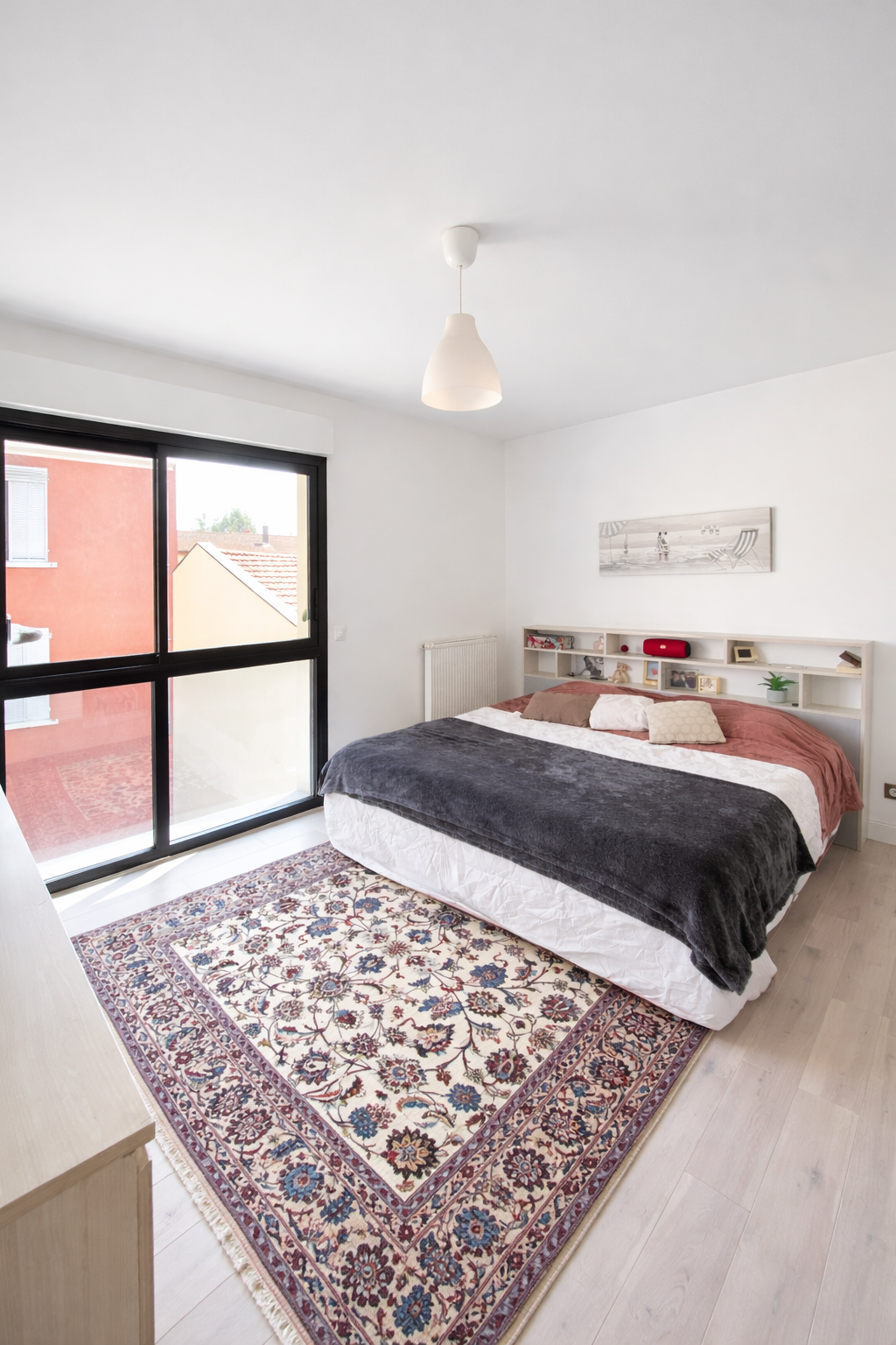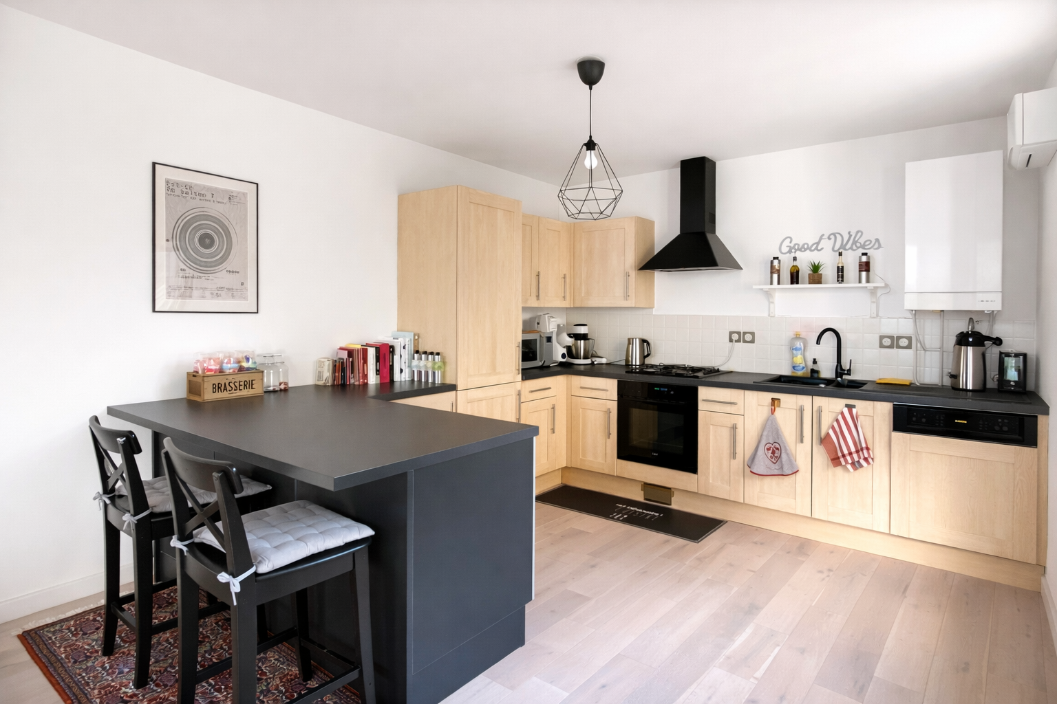L'appartement se compose d'une spacieuse pièce de vie de 43 m2 avec parquet, climatisation réversible, et cuisine ouverte entièrement équipée avec îlot central, offrant un accès direct à une terrasse de 9 m2.