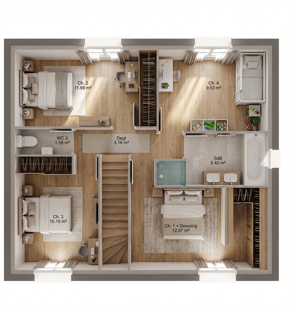 DÉTAILS DU MODÈLE PRÉSENTÉ (102m2) :