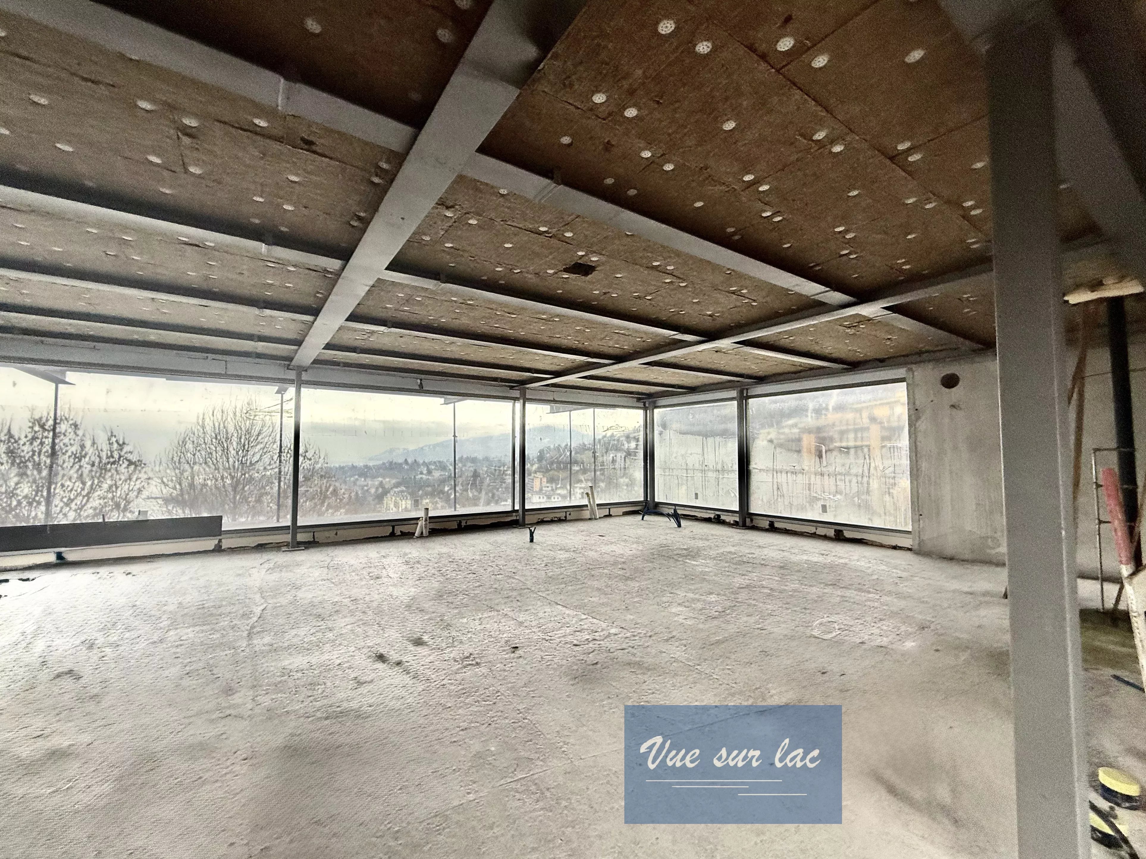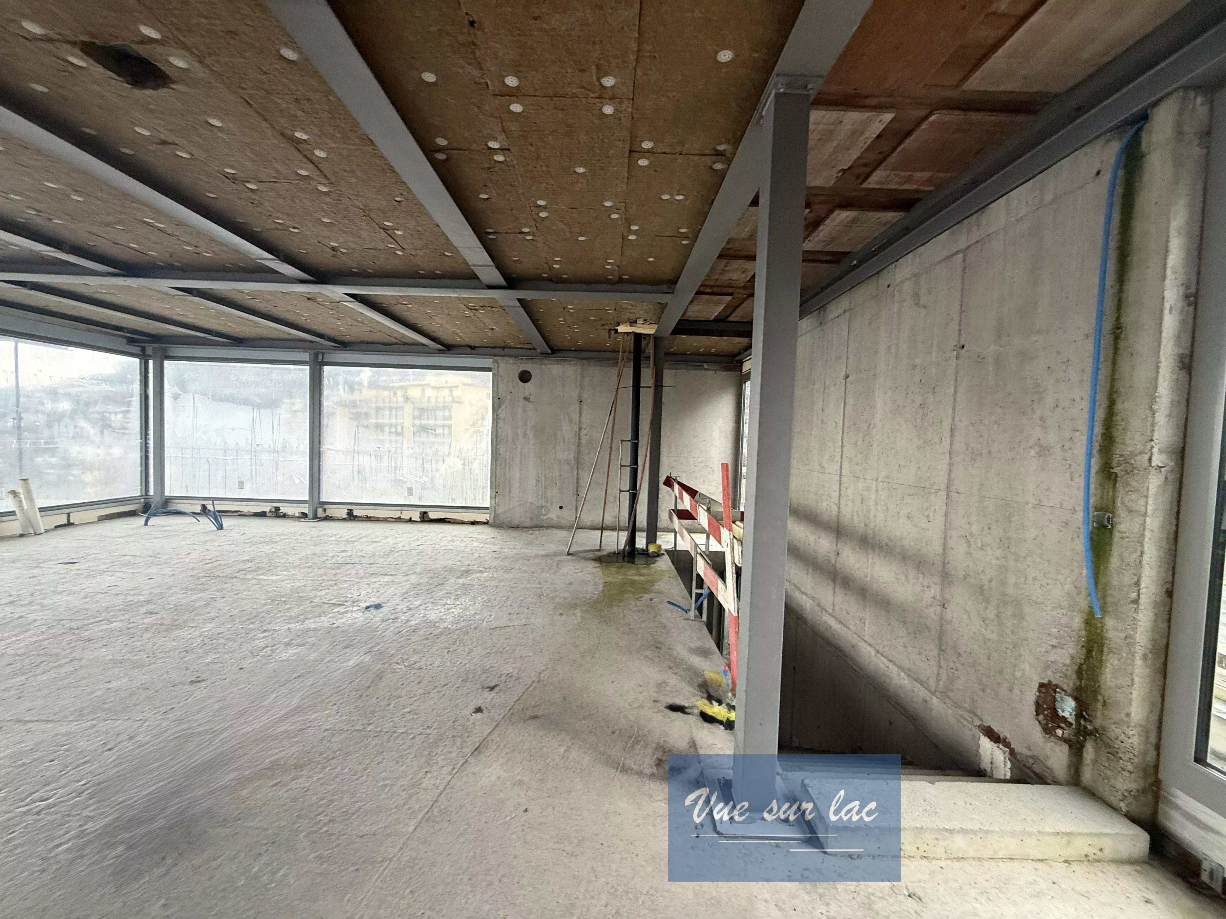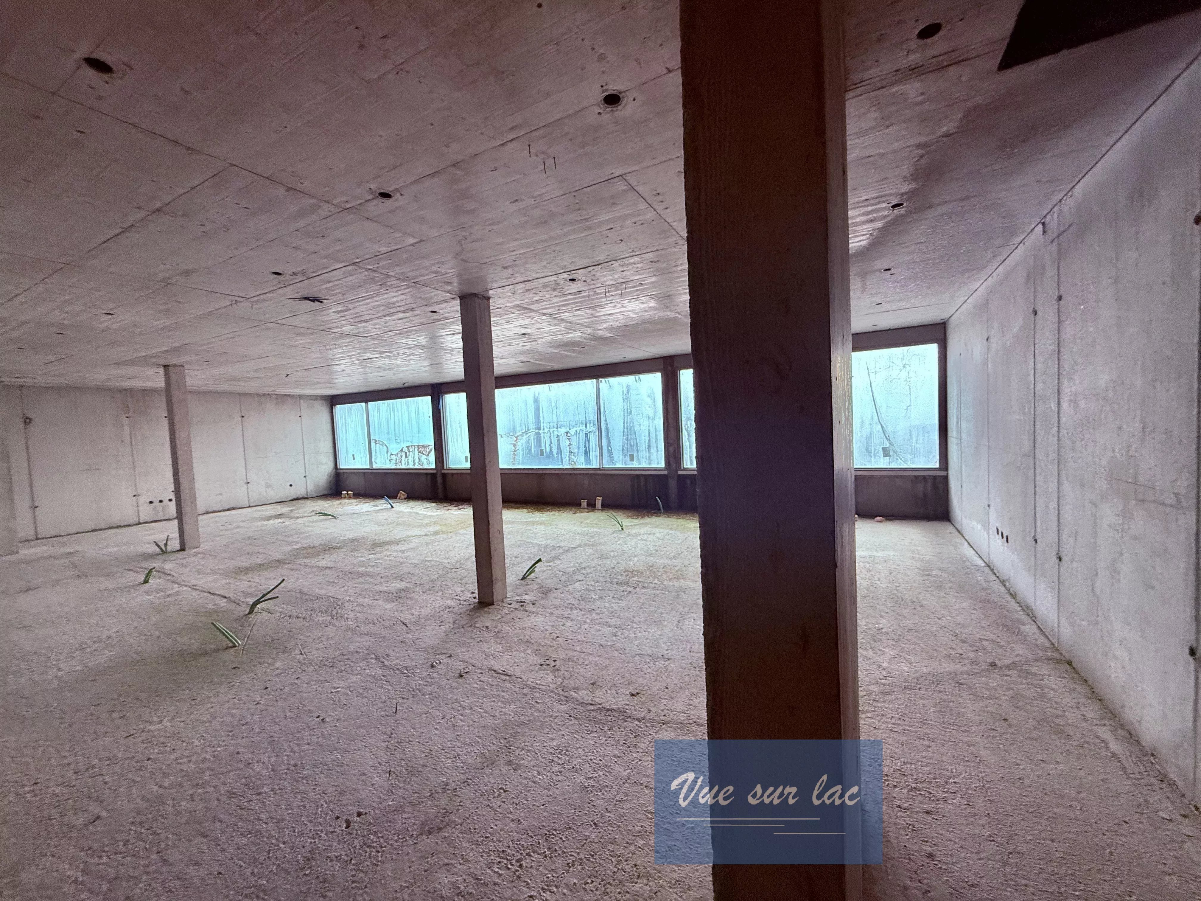 Rez supérieur: entrée, grand espace ouvert pour le séjour, salle à manger et cuisine ouverte. Le tout avec de grandes baies vitrées et face au lac avec une vue panoramique.