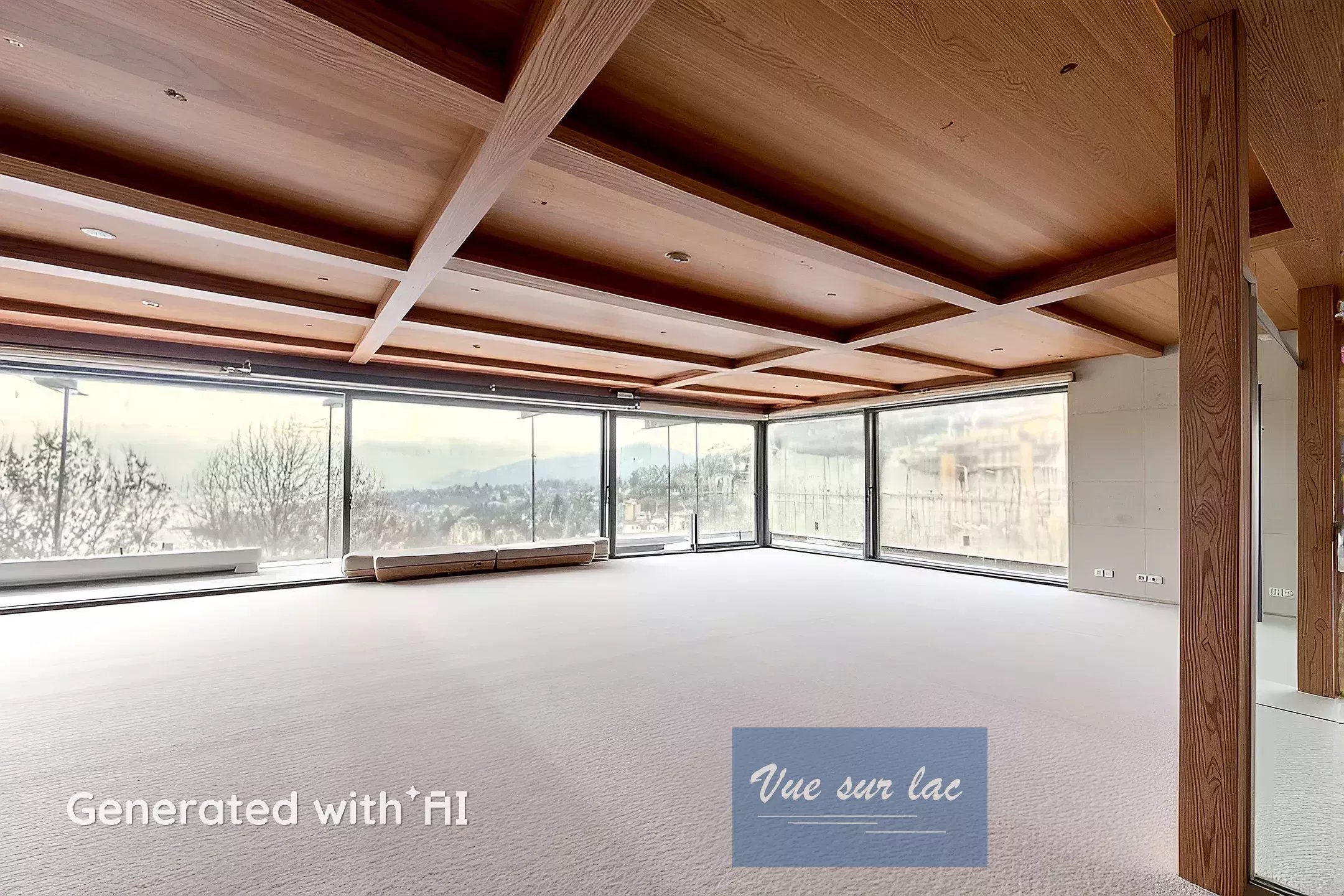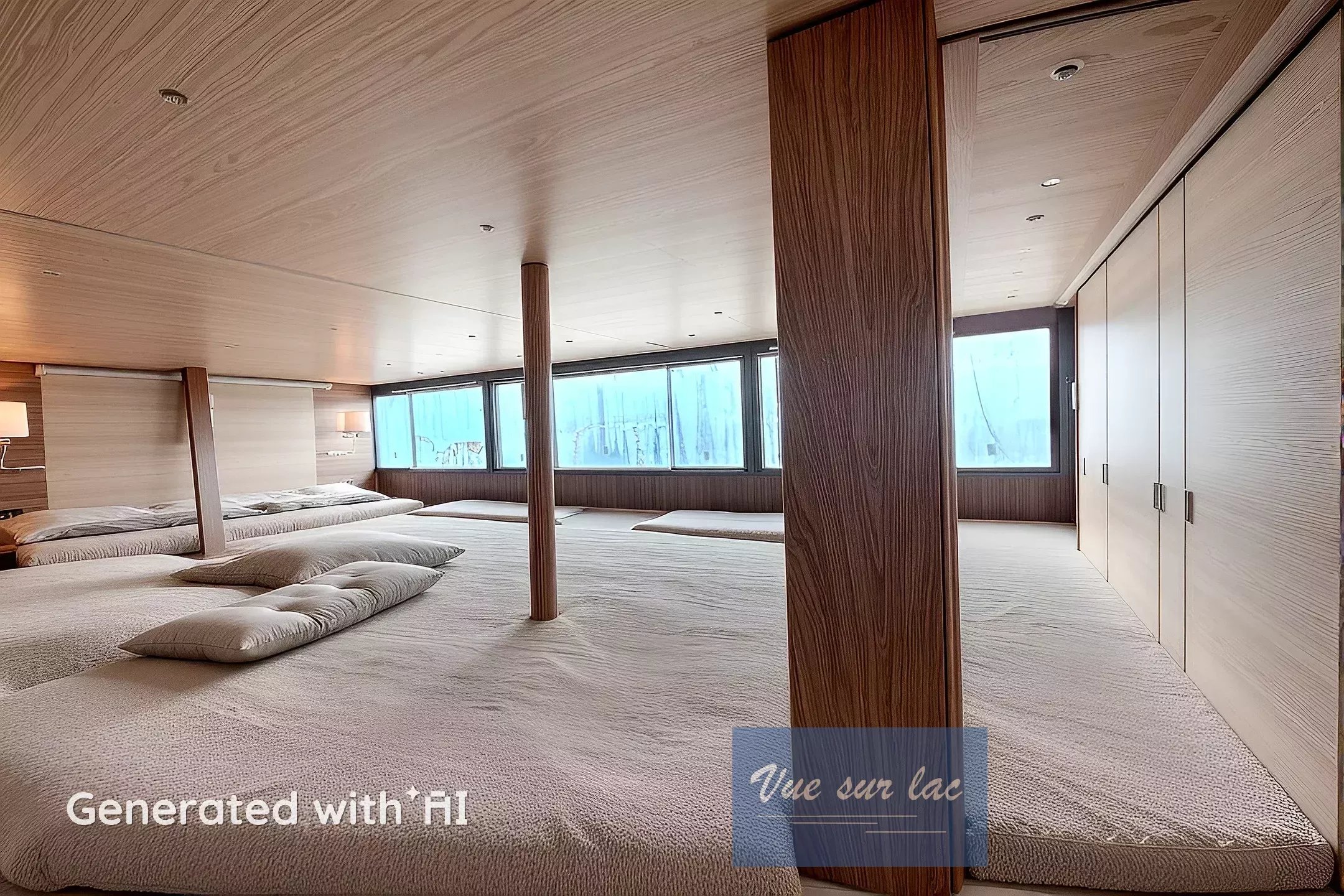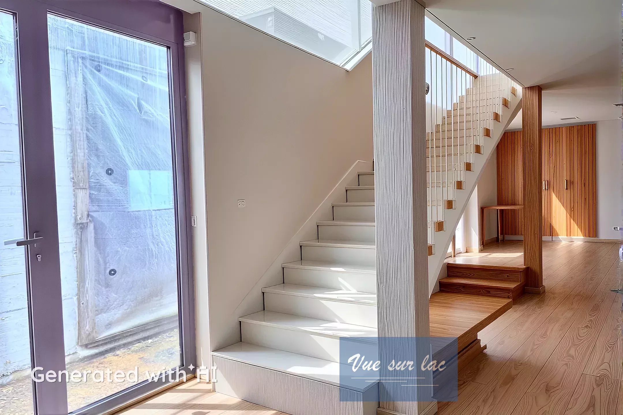 Rez supérieur: entrée, grand espace ouvert pour le séjour, salle à manger et cuisine ouverte. Le tout avec de grandes baies vitrées et face au lac avec une vue panoramique.