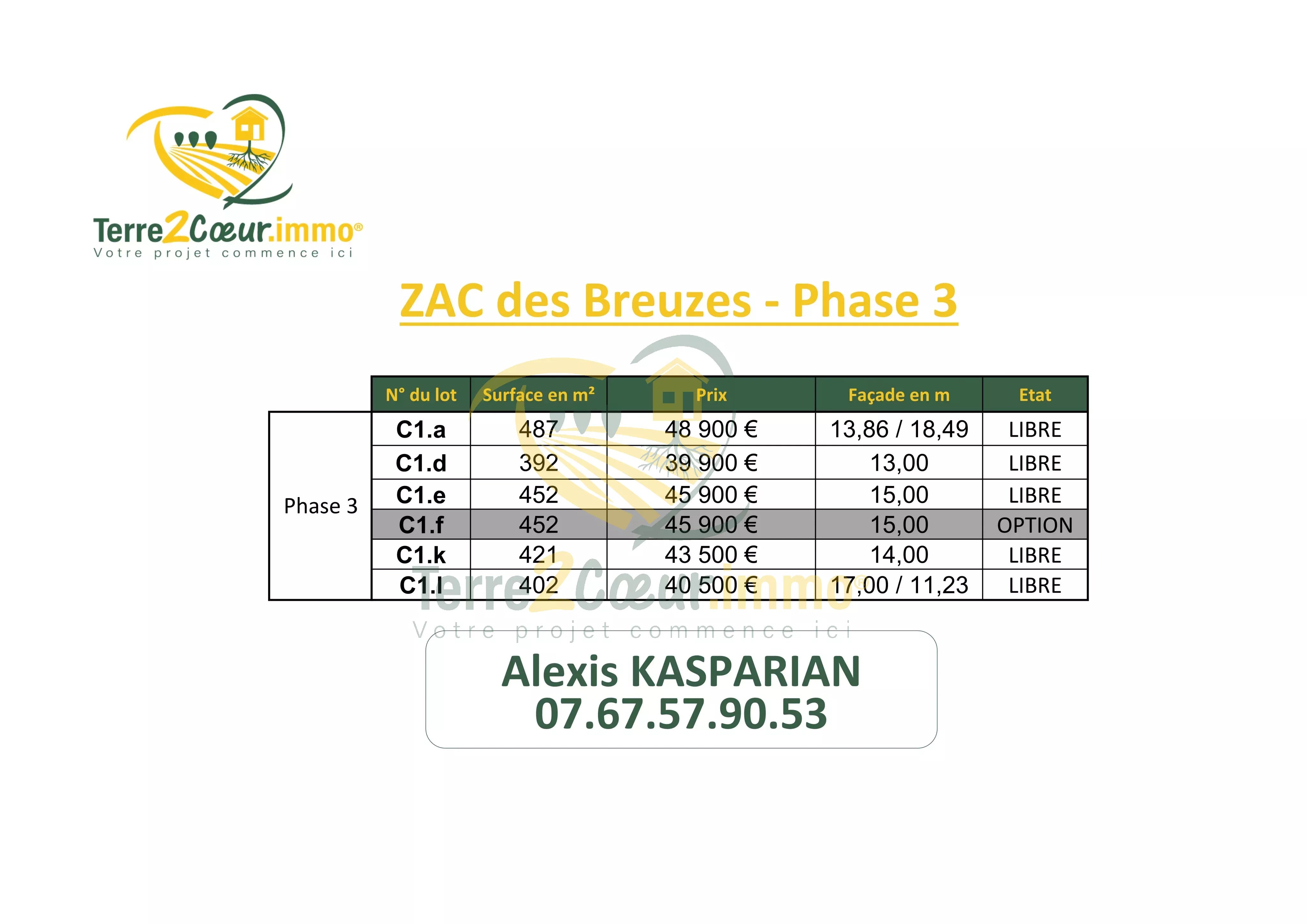🌿 À vendre – Terrains à bâtir entièrement viabilisés à Bourges – ZAC des Breuzes (Phase 3) 🌿 📍 Entre le Chemin de Villeneuve et la Route de la Chapelle – Cadre verdoyant et emplacement stratégique ! ✨ Un véritable quartier nature aux portes de la ville : la ZAC des Breuzes bénéficie d’un magnifique parc paysager, idéal pour les promenades, les loisirs en plein air et un cadre de vie sain et apaisant. 🔹 Parcelles disponibles : de 327 m² à 774 m² 💰 Prix : de 32 900 € à 75 500 € – voir grille tarifaire en annexe 🎯 Des surfaces adaptées à tous les projets : primo-accédants, familles, investisseurs ou résidence secondaire ✅ Terrains 100 % viabilisés : Eau, Électricité, Gaz, Fibre, Tout-à-l’égout ✅ Bornés et avec étude de sol G1 déjà réalisée ✅ Libre constructeur : donnez vie à votre projet en toute liberté ! 💡 Avantages fiscaux exclusifs : Taxe de raccordement au tout-à-l’égout réduite Taxe d’aménagement en partie exonérée ➡ Un gain d’environ 4 000 € sur n’importe quel terrain choisi ! 📍 Emplacement de choix : Accès direct à la rocade et à l’autoroute À proximité de MBDA Arrêts de bus, écoles, commerces et équipements à quelques minutes Quartier calme mais extrêmement bien desservi 🎁 Opportunité rare à Bourges avec avantages financiers inclus ! 💼 Honoraires à la charge du vendeur 📞 Pour découvrir la grille des prix, recevoir un plan de la ZAC ou organiser une visite, contactez Alexis, votre conseiller foncier. 🌟 ZAC des Breuzes – Un nouveau quartier naturel et dynamique pour concrétiser tous vos projets de vie ! 🔎 Informations complémentaires Les risques auxquels ce bien est exposé sont disponibles sur le site Géorisques : www.georisques.gouv.fr Selon l'article L.561-5 du Code monétaire et financier, pour l'organisation de la visite, la présentation d'une pièce d'identité pourra être demandée 🏢 Mentions légales Cette annonce a été rédigée sous la responsabilité éditoriale de Alexis KASPARIAN, Agent Immobilier, immatriculé au R.C.S. de Bourges sous le numéro 999 156 318, agissant pour le compte de : SAS PAMPA IMMO - 31 Route des Clous 18110 VASSELAY - SIRET : 952 914 703 00014 - Capital social : 2 500 € Titulaire de la carte professionnelle Transactions sur immeubles et fonds de commerce (T) n° CPI18012023000000006 délivrée par la CCI du Cher Assurance responsabilité civile professionnelle : GALIAN-SMABTP – Contrat n° RCP_01_510576Y 👤 Responsable de l’annonce Alexis KASPARIAN - Agent Immobilier SAS AK IMMO – R.C.S. Bourges 999 156 318 Terre2Coeur .immo