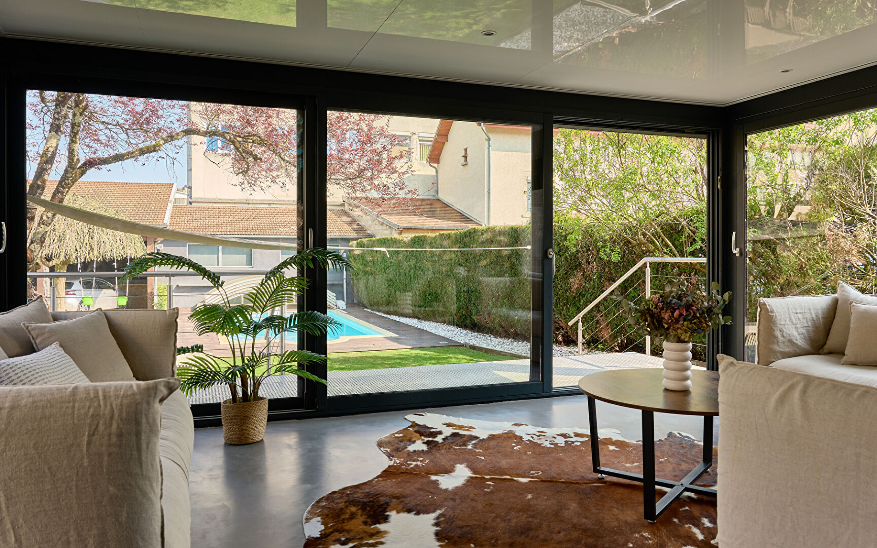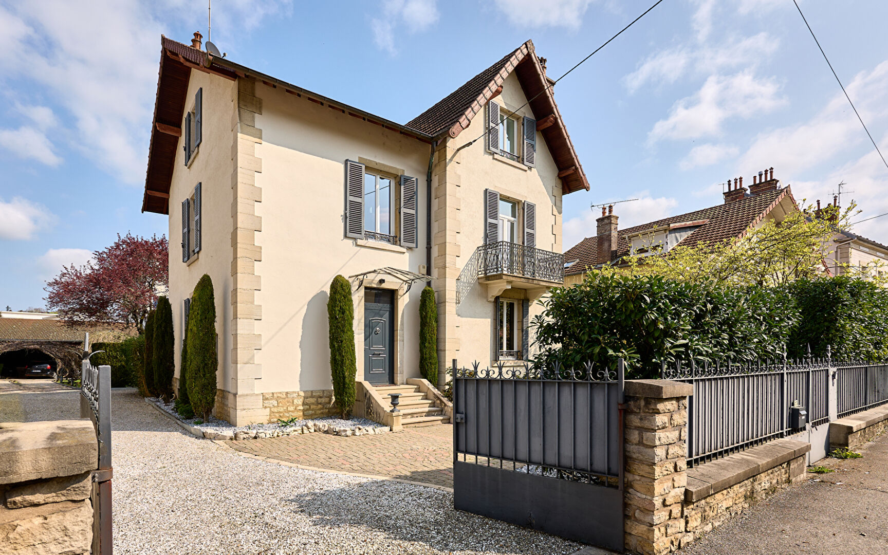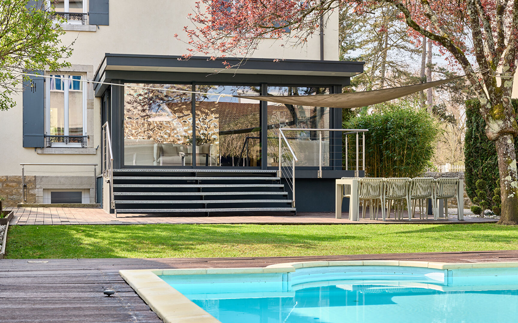 Maison de maître à Lons-le-Saunier Au coeur de Lons-le-Saunier, cette maison de maître s'impose avec justesse. Sa silhouette en pierre affirme une présence élégante, tandis que l'écriture intérieure révèle une rénovation maîtrisée, où le caractère d'origine dialogue avec une lecture contemporaine, sobre et structurée. Parquets anciens, boiseries, cheminées et hauteurs sous plafond composent un socle patrimonial fort, mis en valeur par de larges ouvertures laissant circuler une lumière naturelle constante. A l'extérieur, le jardin arboré et la piscine installent un cadre de vie rare en centre-ville, pensé pour conjuguer intimité et usage quotidien. Une organisation fluide, pensée pour la vie actuelle La distribution s'articule autour d'un escalier central, véritable colonne vertébrale de la maison, desservant des volumes équilibrés entre espaces de réception et zones plus intimistes. Les pièces de vie se déploient avec générosité, dans une continuité naturelle vers une véranda ouverte sur le jardin et la piscine. Cet espace crée une véritable extension du séjour, offrant une relation directe avec l'extérieur et renforçant la sensation de volume et de lumière. La cuisine, au traitement résolument contemporain, s'intègre avec cohérence dans l'ensemble, conjuguant fonctionnalité et esthétique épurée. Les aménagements sur mesure prolongent cette lecture, avec une attention portée aux lignes, aux matériaux et à la circulation. La maison développe quatre chambres aux proportions confortables, adaptées à une vie de famille ou à un usage mixte (chambres, bureau, espace invité). Une suite parentale vient structurer l'ensemble avec un niveau de confort attendu sur ce type de bien. Un extérieur structuré, rare en coeur de ville Le terrain, plat et arboré, constitue un véritable prolongement des espaces de vie. Il offre différentes séquences d'usage : zones ombragées, espaces ouverts, perspectives végétales préservant l'intimité. La piscine, protégée par un dôme, s'inscrit naturellement dans cet environnement et permet une utilisation prolongée sur la saison, avec une approche discrète et qualitative. La terrasse en bois accompagne cet espace, pensée comme un lieu de vie à part entière. Fonctionnalités et dépendances La propriété dispose de deux stationnements abrités, apportant confort et praticité au quotidien en centre-ville. Une dépendance indépendante complète l'ensemble. Elle peut accueillir différents usages selon les besoins : atelier, espace de stockage, salle de sport ou encore espace créatif. L'ensemble compose une adresse cohérente et aboutie, où l'esthétique, la fonctionnalité et la qualité des volumes s'inscrivent dans une même exigence. Une maison de maître à Lons-le-Saunier pensée pour une vie contemporaine, sans renoncer à l'âme du lieu. Lons le Saunier, une ville vivante au coeur du Jura Vivre dans une maison de maître en centre-ville de Lons le Saunier, c'est choisir un quotidien où tout se fait avec aisance. Les commerces, les écoles et les services s'inscrivent naturellement dans le rythme de la ville, sans contrainte, avec cette liberté propre aux adresses centrales. Le Jura apporte, lui, une profondeur de décor. On y retrouve une identité douce et authentique, entre culture locale, gastronomie, paysages préservés et une manière d'habiter plus attentive au temps. La ville conserve une dimension humaine, tout en restant connectée aux grands axes, ce qui renforce l'intérêt de cette localisation. Avis de l'agence : Cette maison de maître à Lons le Saunier se distingue par une combinaison très rare : une adresse centrale, une architecture de caractère, et un jardin arboré avec piscine. La rénovation récente apporte une lecture contemporaine, tout en conservant les marqueurs essentiels de l'ancien. Sirine EL BEGGAR (EI) Agent Commercial - Numéro RSAC : 894149673 - BESANCON.