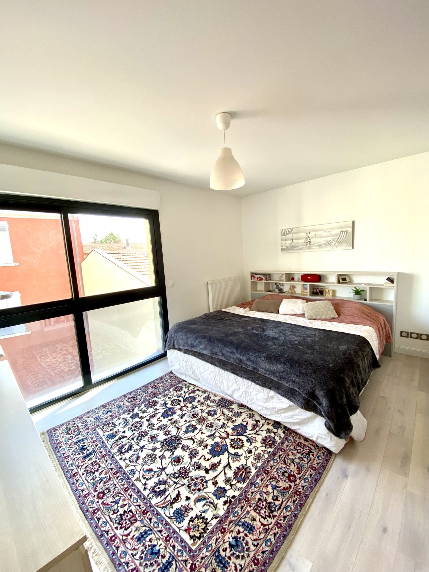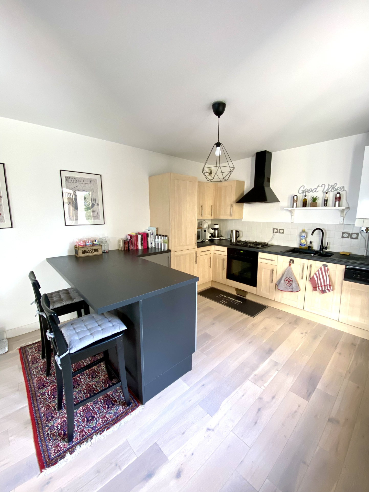 L'appartement se compose d'une spacieuse pièce de vie de 43 m2 avec parquet, climatisation réversible, et cuisine ouverte entièrement équipée avec îlot central, offrant un accès direct à une terrasse de 9 m2.