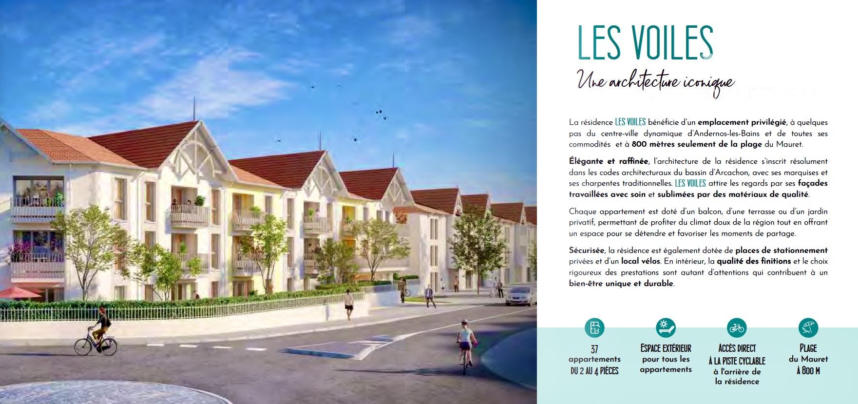 L'Agence du Littoral vous propose 'La résidence LES VOILES ' bénéficie d'un emplacement privilégié, à quelques pas du centre-ville dynamique d'Andernos-les-Bains et de toutes ses commodités et à 800 mètres seulement de la plage du Mauret. Élégante et raffinée, l'architecture de la résidence s'inscrit résolument dans les codes architecturaux du bassin d'Arcachon, avec ses marquises et ses charpentes traditionnelles. LES VOILES attire les regards par ses façades travaillées avec soin et sublimées par des matériaux de qualité. Chaque appartement est doté d'un balcon, d'une terrasse ou d'un jardin privatif, permettant de profiter du climat doux de la région tout en offrant un espace pour se détendre et favoriser les moments de partage. Sécurisée, la résidence est également dotée de places de stationnement privées et d'un local vélos. En intérieur, la qualité des finitions et le choix rigoureux des prestations. LIVRAISON 2027