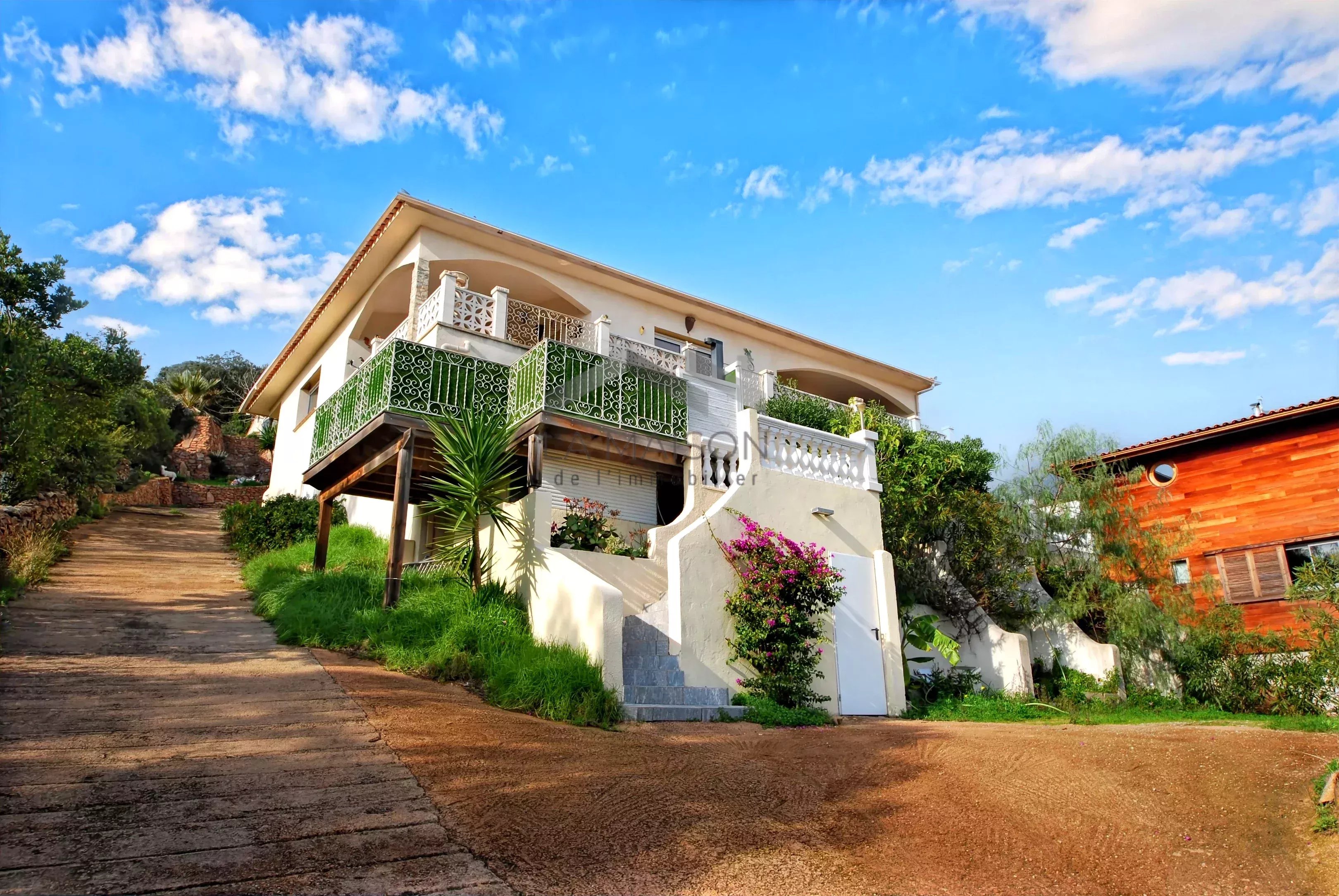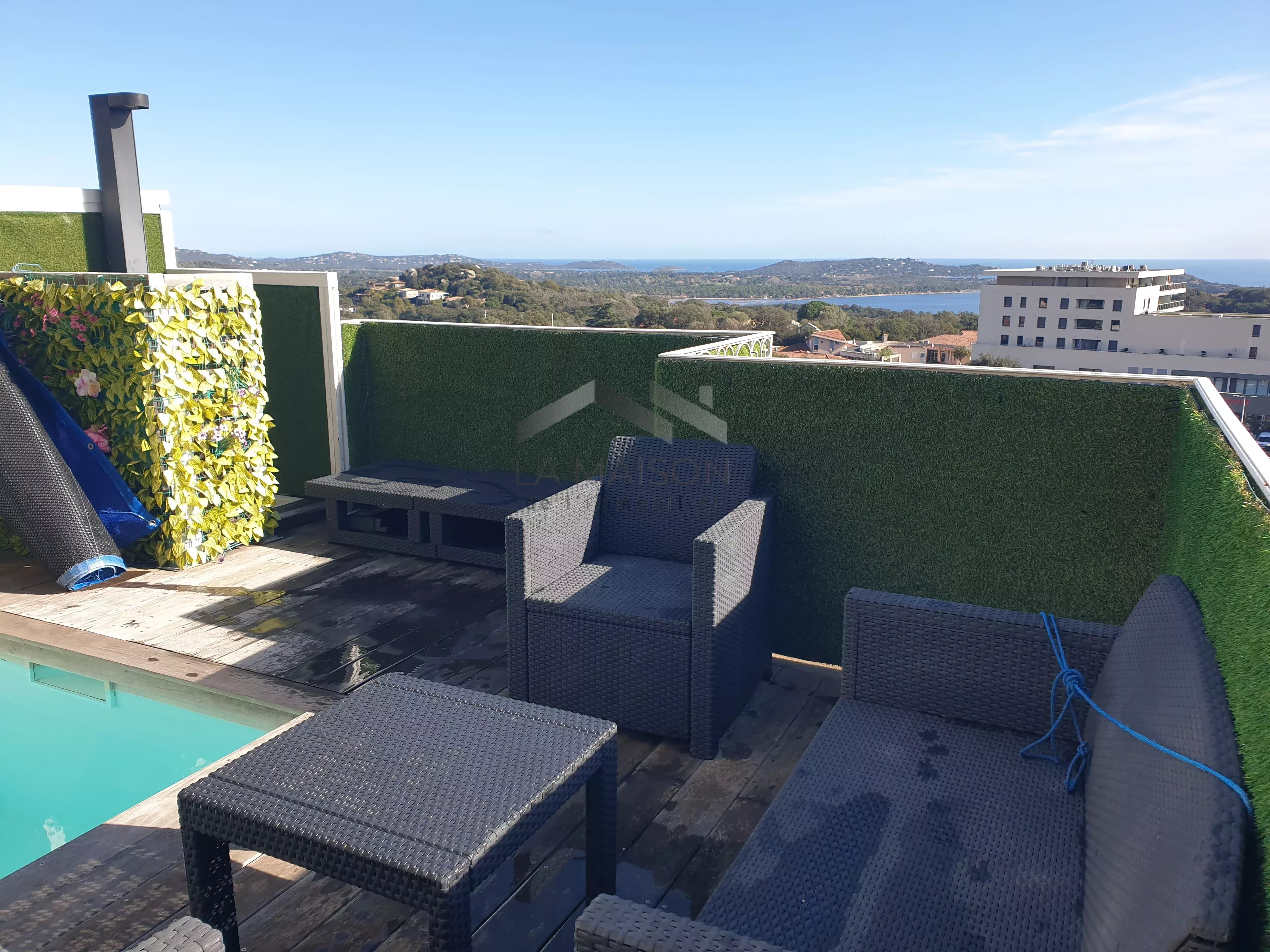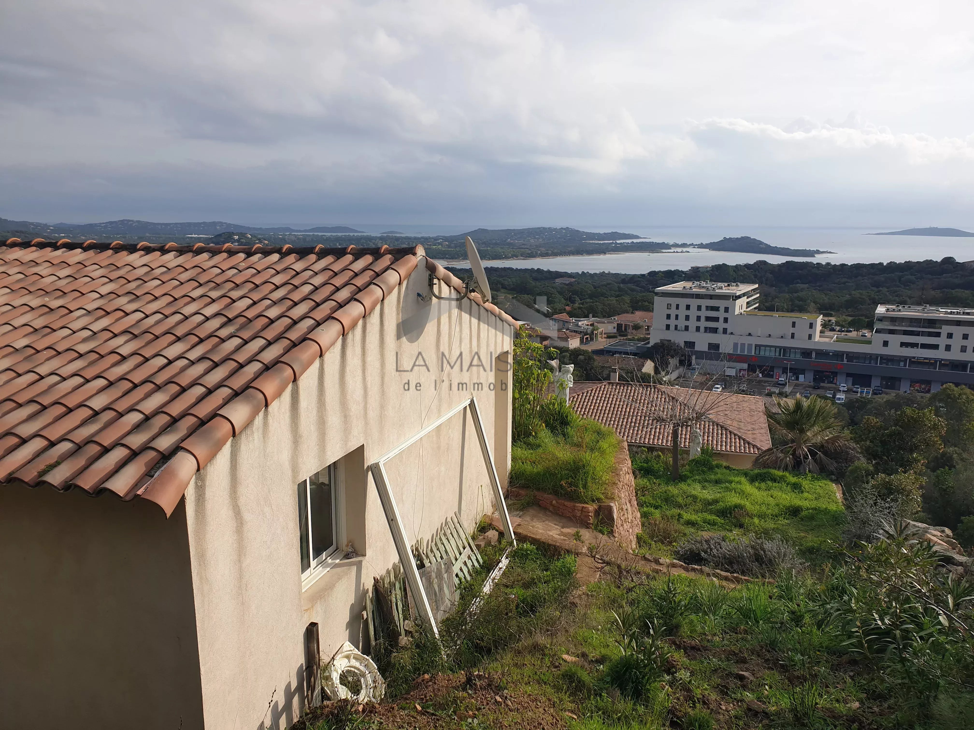 Venez saisir cette opportunité dans le quartier de La Trinité de Porto-Vecchio, d'acquérir un terrain de 2710 m² à fort potentiel constructible, supportant un ensemble immobilier orienté plein Est avec vue sur la mer en tout point de la parcelle. Ce terrain permet la réalisation de petits ensembles résidentiels collectifs en R+1 à R+2 dans le respect des règles d'urbanisme en vigueur et d'une bonne intégration. Cette parcelle est située en zone UV du plan local d'urbanisme en attente d'approbation, qui prévoit une constructibilité en R+2 avec une hauteur maximale de 9 m à l'égout. Configuration actuelle Au centre du terrain se trouve une villa principale comprenant deux appartements : Un appartement principal de type 7 d'une surface habitable d'environ 178 m², disposant d'une entrée de plain-pied à l'ouest. Ce logement, établi sur deux niveaux, propose à l'étage supérieur un double salon-séjour avec cuisine attenante et terrasse d'environ 60 m² offrant une vue panoramique sur les paysages et la mer, un cellier, un dégagement desservant une salle de bain à terminer, un cabinet de toilettes, deux chambres dont une avec salle d'eau et un dressing. Au niveau inférieur, accessible par un escalier intérieur, se trouve un dégagement desservant un espace détente avec sauna, un espace sport, une kitchenette, une chambre, un cabinet de toilettes à équiper, une douche à équiper, un dégagement donnant accès à la piscine partiellement couverte avec une terrasse offrant une vue sur la mer. Un deuxième appartement d'une surface d'environ 38 m² de type 2 est situé au rez-de-chaussée surélevé accessible par un escalier sur la façade est. Ce logement dispose d'un salon-séjour avec cuisine donnant sur une terrasse avec jacuzzi et vue sur la mer, d'une salle d'eau avec WC et d'une chambre. Sur la partie haute du terrain se trouve une deuxième villa de type 2 d'une surface habitable d'environ 48 m², comprenant un salon-séjour-cuisine et une chambre donnant sur une terrasse dominant les paysages et la mer, ainsi qu'une salle d'eau avec WC. Sur la partie basse du terrain, deux mobil homes.