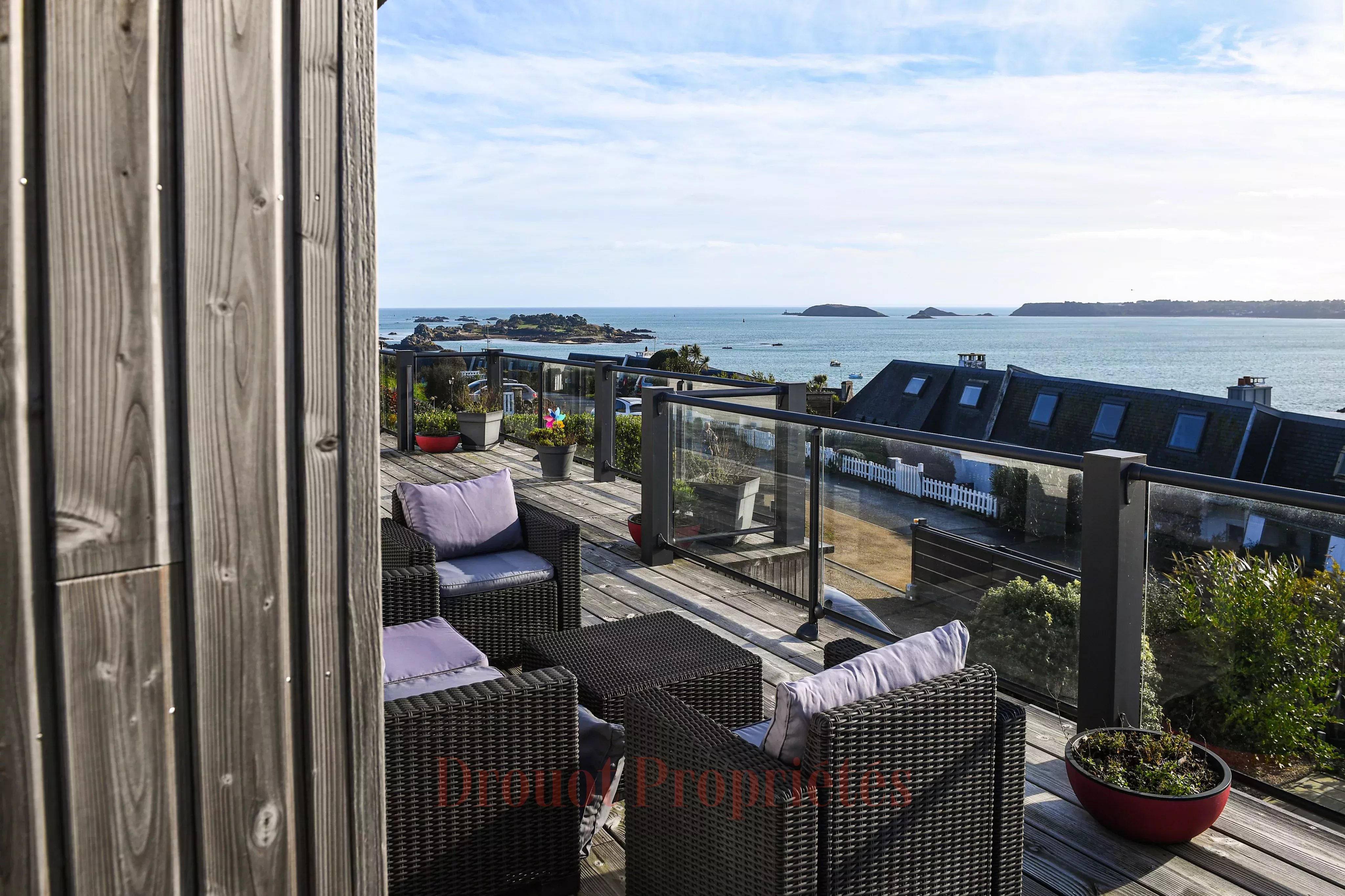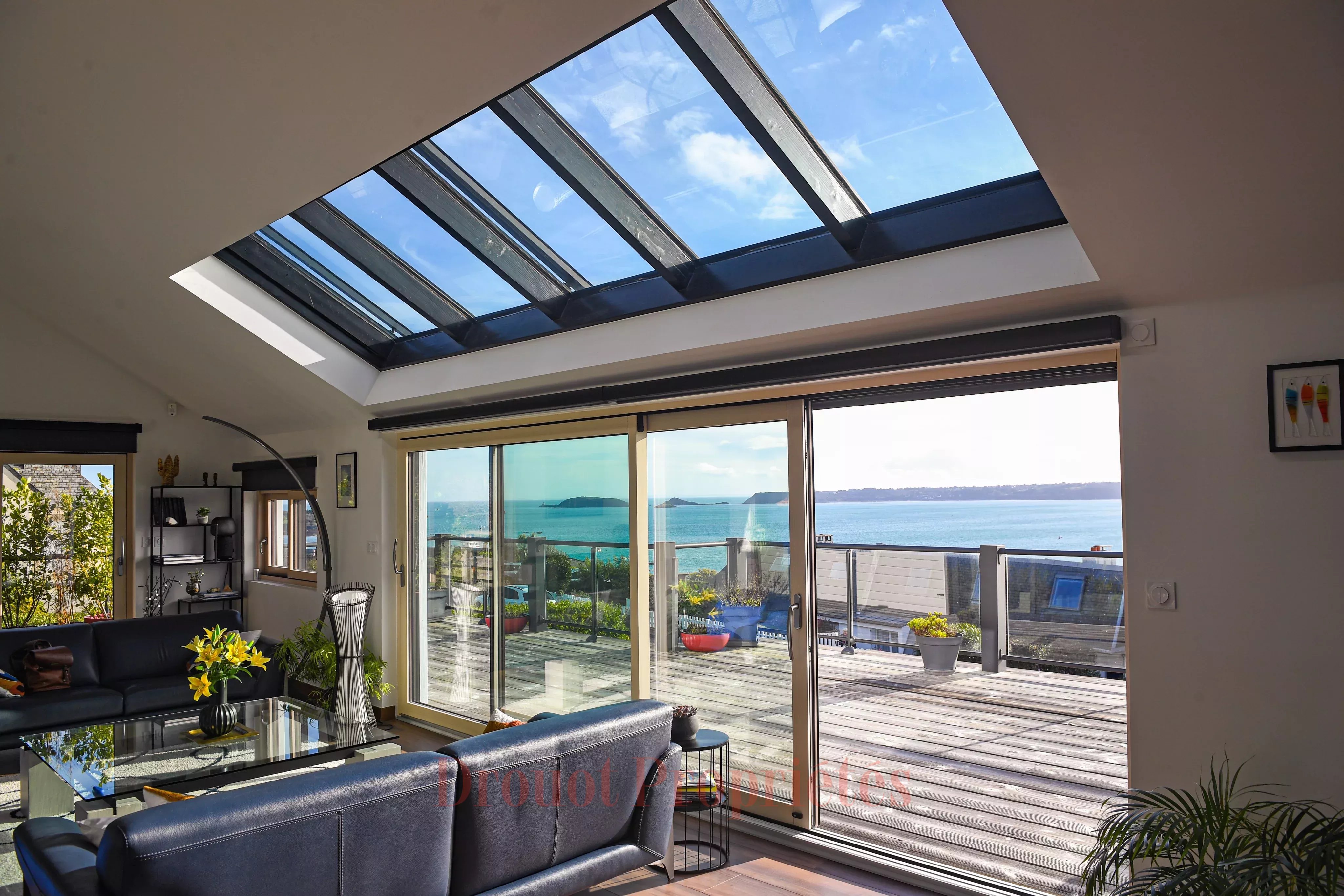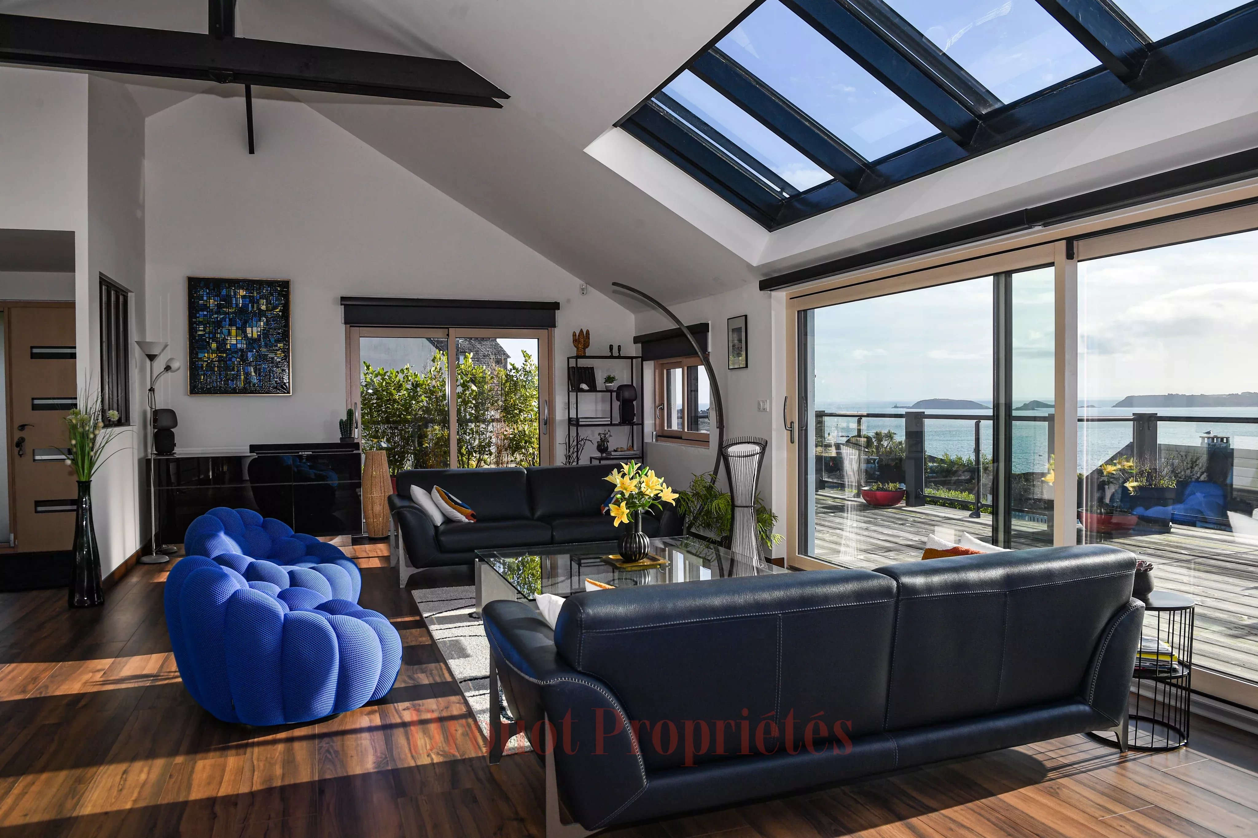 - À l’étage : Une entrée, accessible par une passerelle, dessert un espace de vie comprenant un séjour ouvrant de plain-pied sur une vaste terrasse avec vue dégagée sur le passage maritime, ainsi qu’une cuisine ouverte aménagée et équipée.