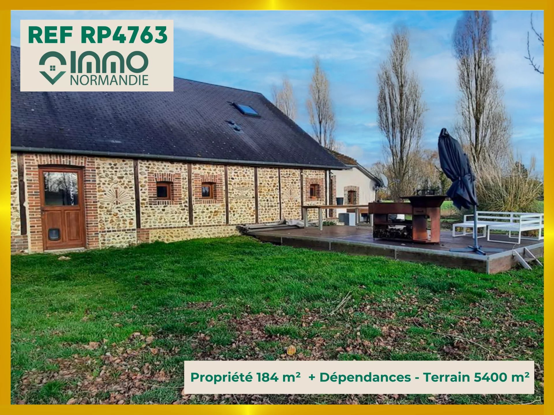EXCLUSIVITÉ - EXCLUSIVITÉ - EXCLUSIVITÉ Ici, la Normandie se gagne rapidement et, Paris s'oublie doucement en cours de chemin alternant près, vergers, cultures et forêts. En campagne avec petits commerces de proximité, Alliance d'authenticité où tomettes, colombages, briques et silex se côtoient, et d'espaces intérieurs qui se déploient pour offrir 184 m² habitables dont famille et amis(es) pourront profiter de suite. Organisée autour d'une entrée qui accueille : - D'UN CÔTÉ, une cuisine de 27 m² au charme unique complétée - pour l'aspect pratique - par un cellier, d'un convivial double séjour de près de 60 m² profitant d'un poêle à granulés/pellets, d'une belle salle de douche à l'italienne, de toilettes séparées, d'une spacieuse buanderie, de trois chambres indépendantes dont une de 28 m² ; - DE L'AUTRE CÔTÉ, des toilettes avec lave-mains, une chambre au rez-de-chaussée et une chambre au-dessus. EN POTENTIEL DE SURFACE SUPPLÉMENTAIRE : - Une construction accolée, en colombages, offrant au sol 24 m² environ + un grenier. EN DÉPENDANCES : - Un belle grange en briques de plus de 100 m² au sol + une mezzanine d'environ 40 m² + une charretterie avec belle hauteur sous faîtage d'environ 37 m² au sol. L'ENSEMBLE S'OFFRANT À DE MULTIPLES PROJETS. - Un garage. Une spacieuse terrasse s'ouvrant sur la campagne complète cette propriété édifiée sur 5400 m². Agence IMMO-NORMANDIE 4 agences Pour vous accompagner dans votre Projet immobilier -- LA BARRE EN OUCHE -- BEAUMONT LE ROGER -- -- BRIONNE -- THIBERVILLE -- Retrouvez toutes nos annonces et vidéos sur notre site www.immonormandie.fr Contact : Benjamin ROMUALD -06.33.72.85.24- entrepreneur individuel (E.I.) agissant en sa qualité d'agent commercial, inscrit au Registre Spécial des Agents Commerciaux sous le numéro RSAC 812 264 455 00013