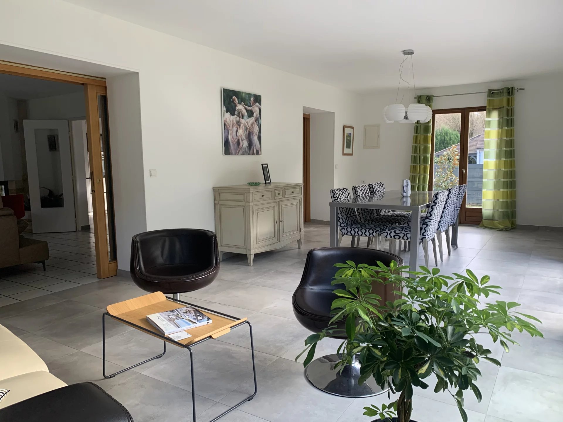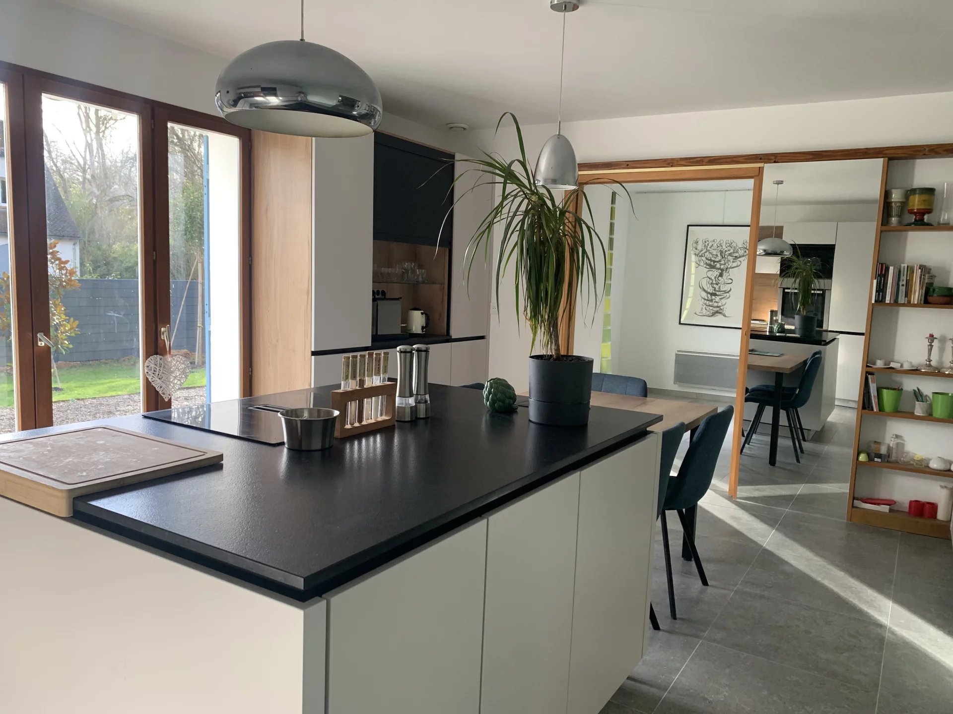 Dès l’entrée, vous serez séduit par un vaste espace de vie d’environ 90 m² comprenant un salon avec cheminée insert, une grande salle à manger baignée de lumière et une cuisine dînatoire avec îlot central. Ces pièces, reliées entre elles par de larges portes vitrées, offrent un agencement modulable, à la fois ouvert et intimiste selon vos envies.