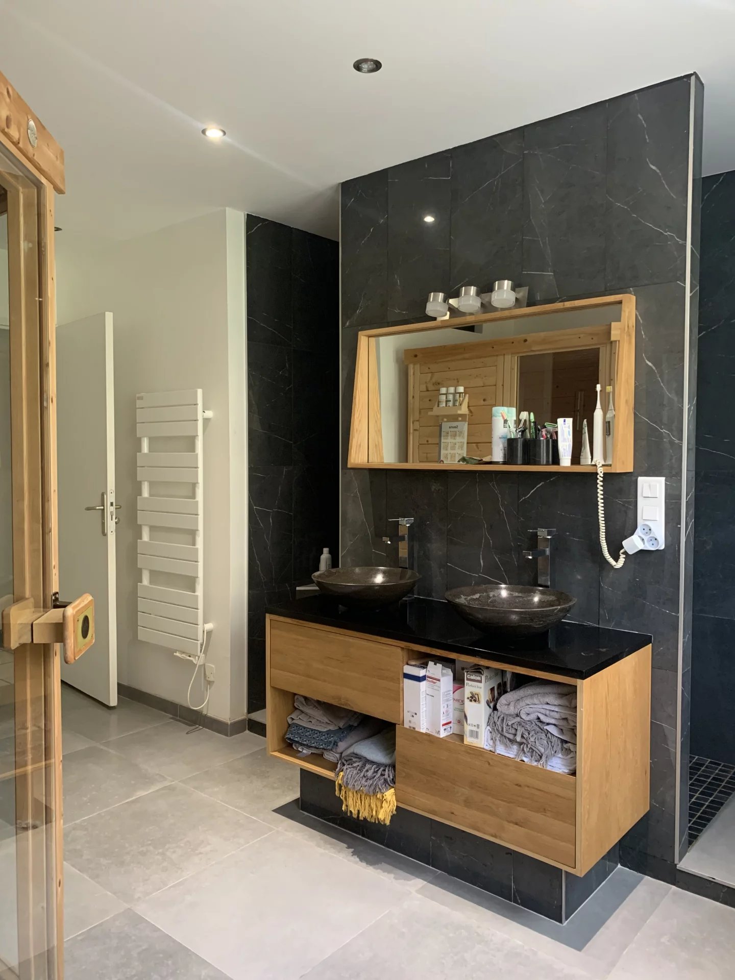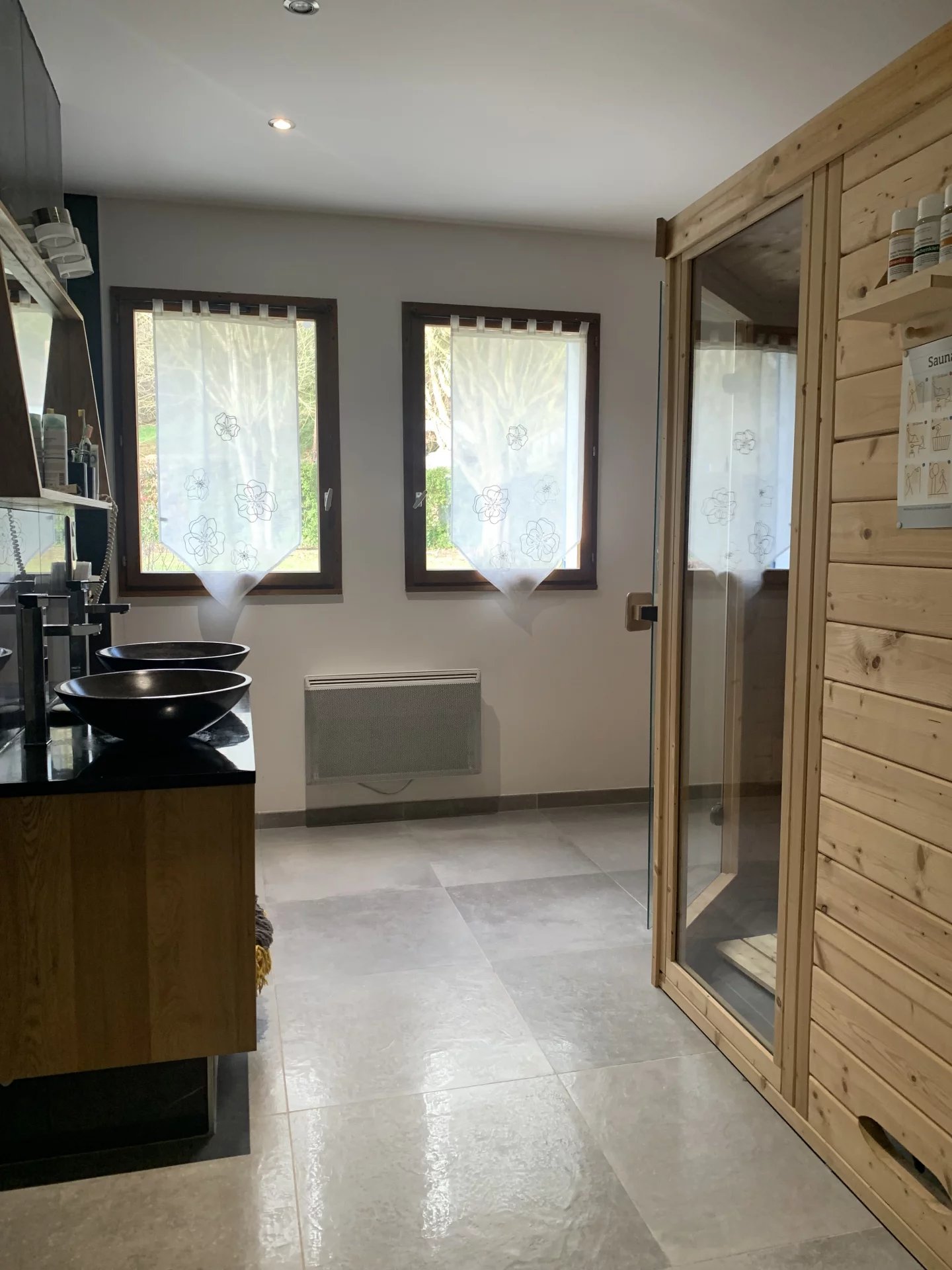 Le rez-de-chaussée propose également une arrière-cuisine pouvant faire office de buanderie, une chambre avec accès extérieur, une spacieuse salle d’eau équipée d’une douche, d’une double vasque et d’un sauna, un WC indépendant, ainsi qu’un studio communicant de 47 m², idéal pour un atelier, une salle de sport ou l’exercice d’une profession libérale.