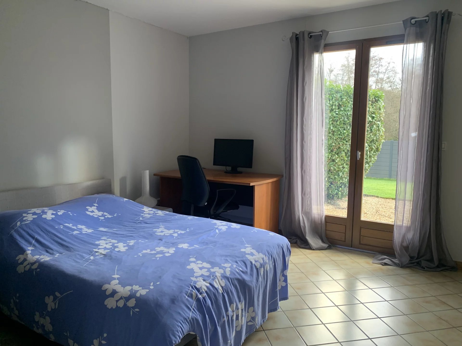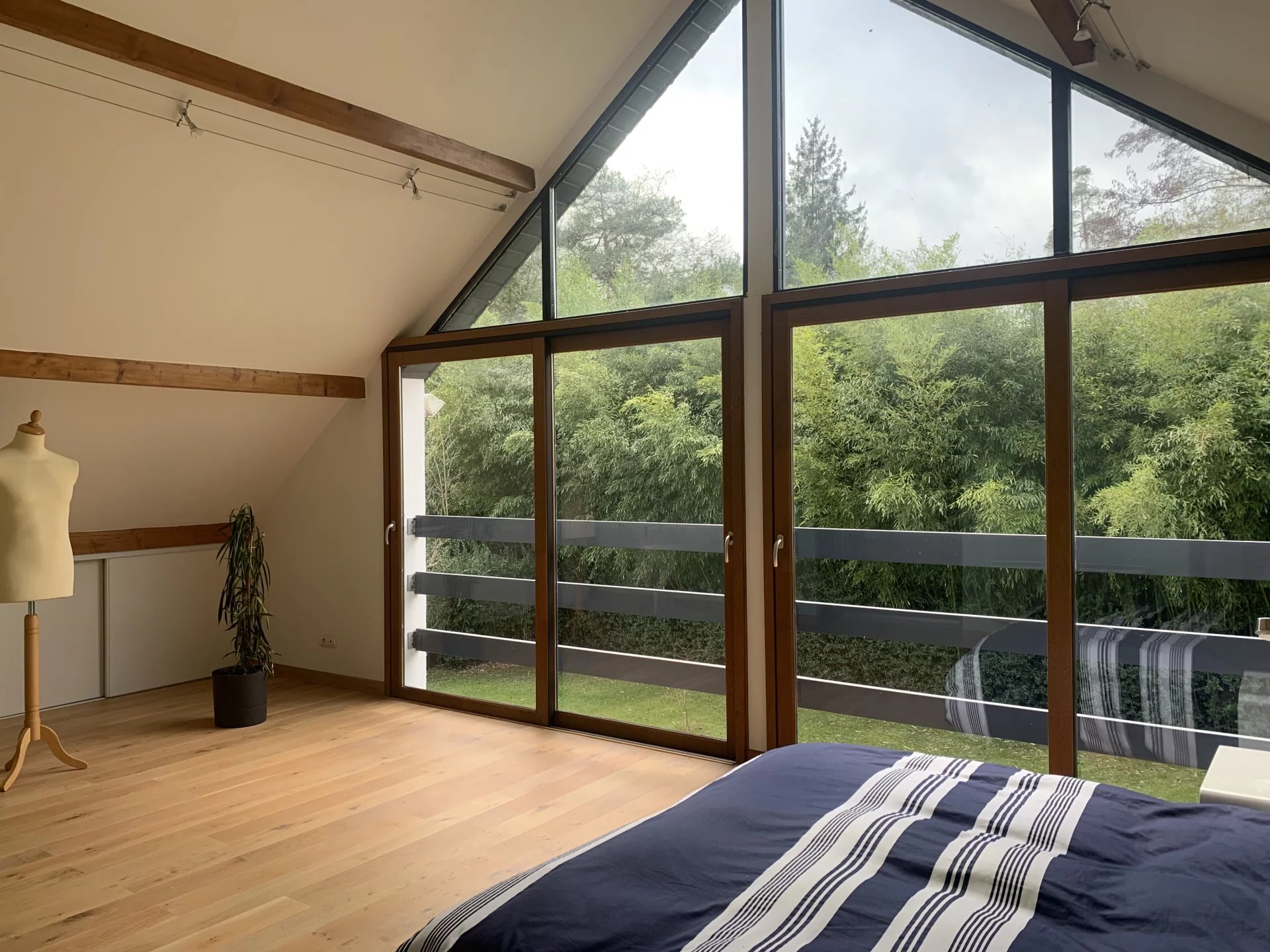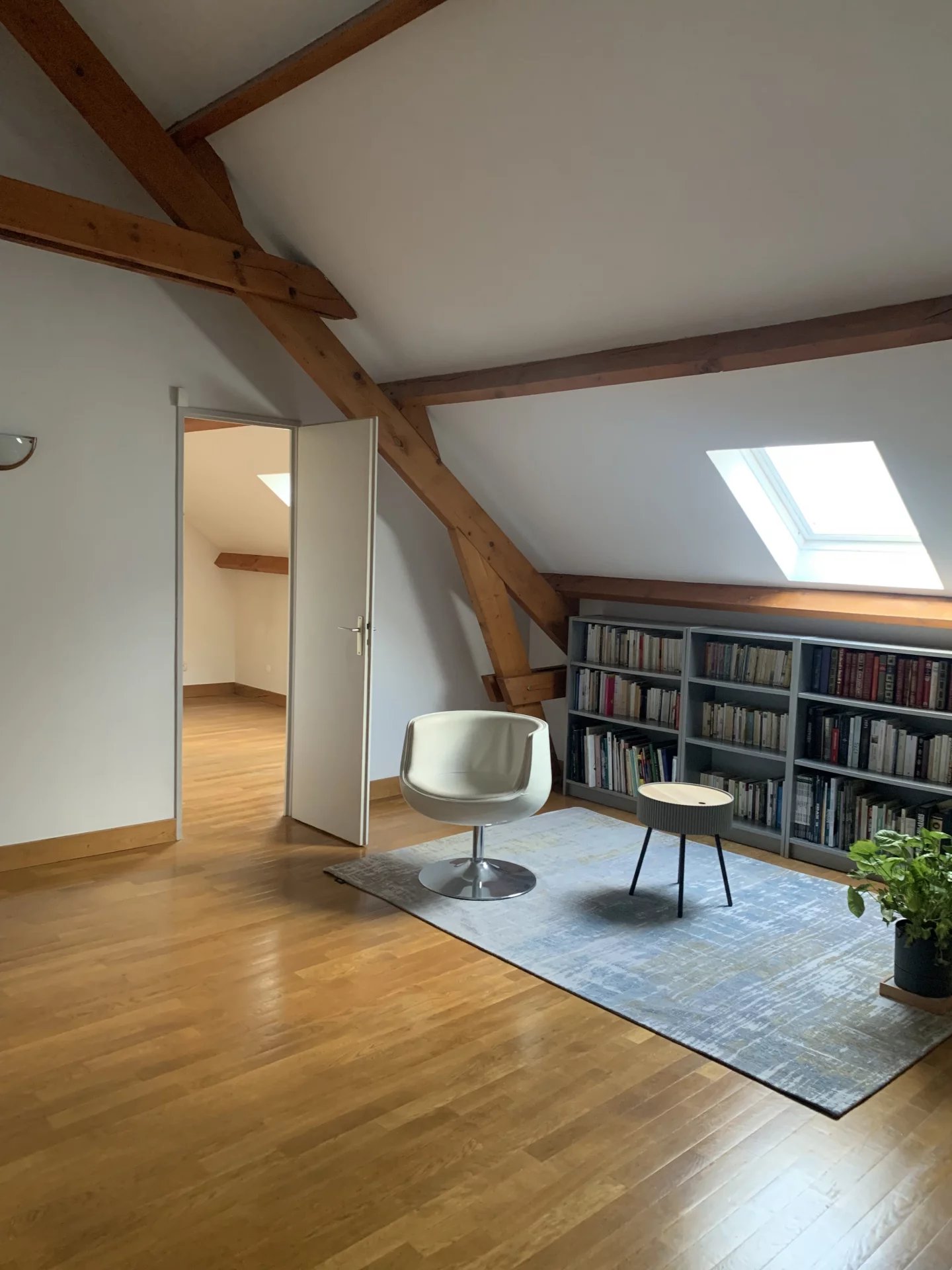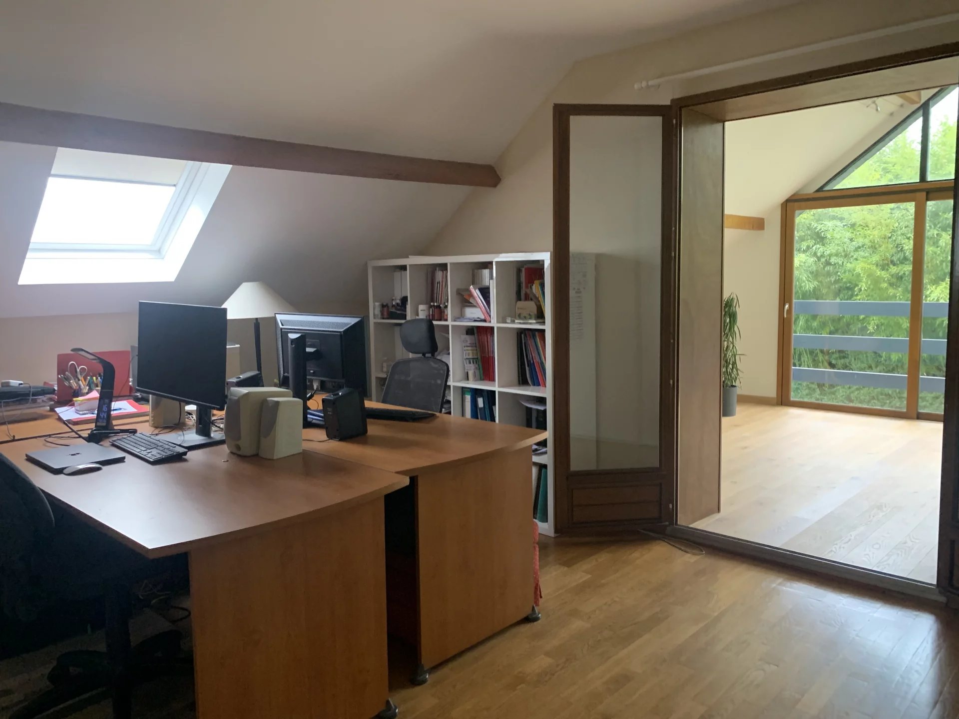 À l’étage, un grand palier de 17 m² dessert trois chambres, dont une particulièrement lumineuse grâce à sa belle hauteur sous plafond et sa baie vitrée ouvrant sur la verdure. Un grand bureau et un espace dressing attenants permettent la création d’une véritable suite parentale. Ce niveau comprend également une salle de bains indépendante avec WC et un débarras.