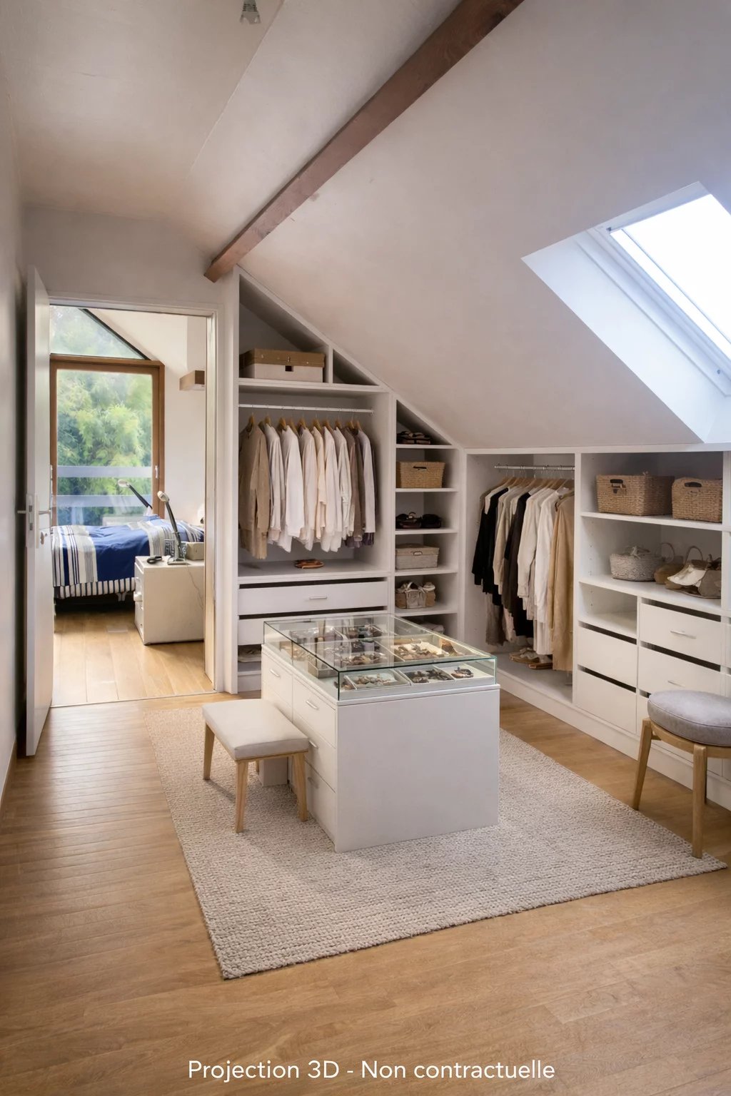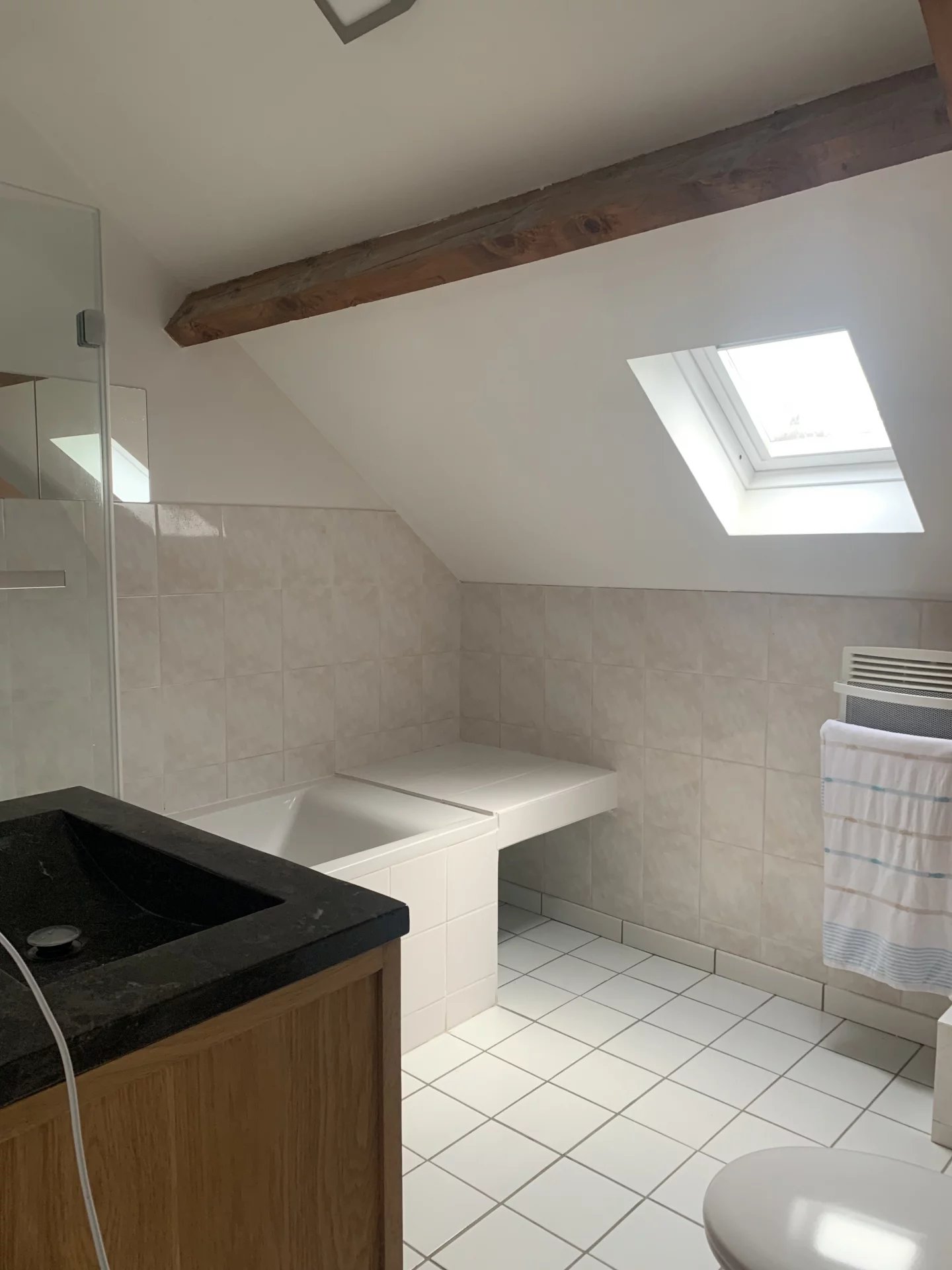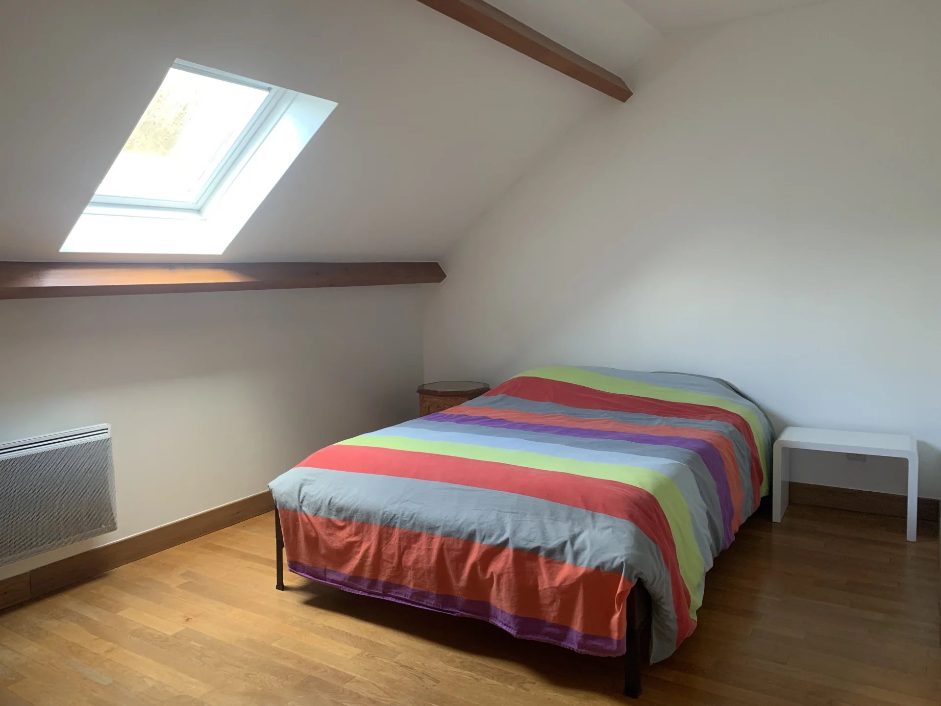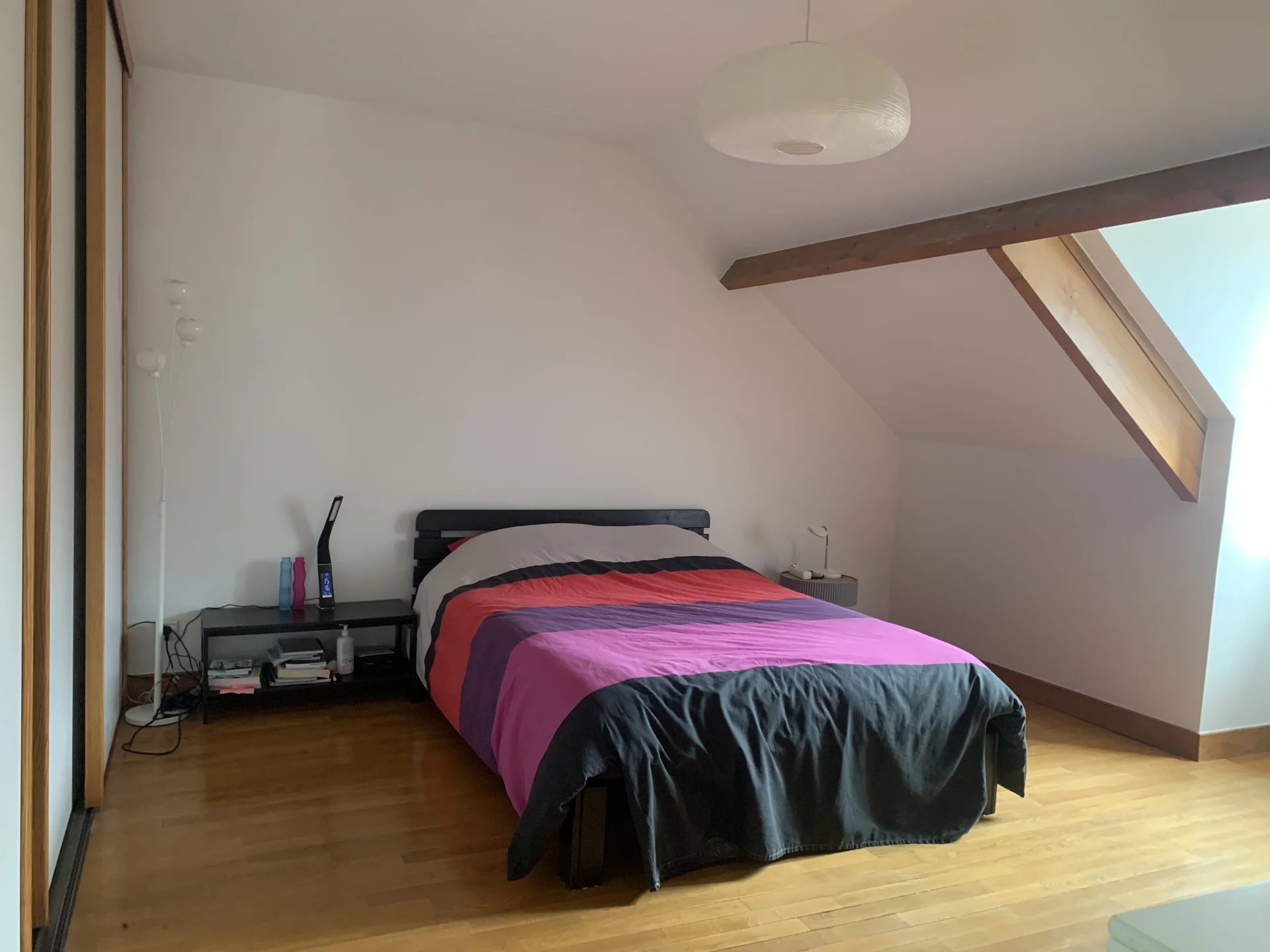 À l’étage, un grand palier de 17 m² dessert trois chambres, dont une particulièrement lumineuse grâce à sa belle hauteur sous plafond et sa baie vitrée ouvrant sur la verdure. Un grand bureau et un espace dressing attenants permettent la création d’une véritable suite parentale. Ce niveau comprend également une salle de bains indépendante avec WC et un débarras.
