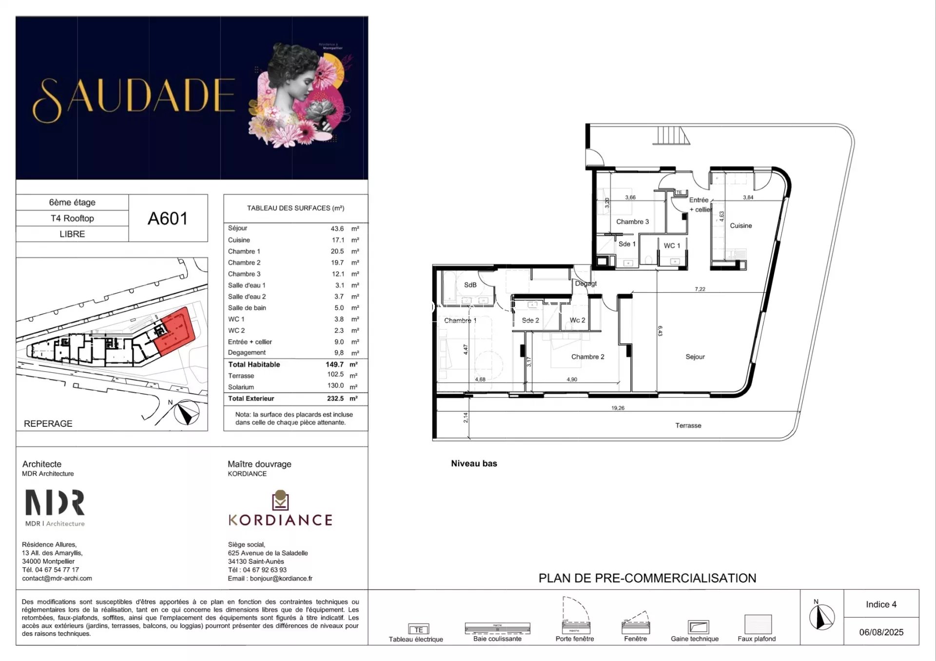 Au dernier étage, nous vous proposons 4 appartements d’exception en rooftop dont celui-ci exposé Sud avec vue imprenable : Surface habitable : 150 m² Séjour de près de 70 m² 3 suites Terrasse de plus de 100 m² + Solarium de 130 m² 3 Stationnements Des volumes spacieux s’y déploient avec harmonie et poésie. Grâce aux larges baies vitrées, le salon, baigné de lumière, respire le calme. L’utilisation de matériaux nobles et de finitions raffinées apporte élégance et charme. Comme un prolongement de la pièce à vivre, une vaste terrasse ouvre sur l’extérieur comme un jardin suspendu, promesse de moments de détente et de convivialité. Enfin, un espace extérieur privé et aménagé est accessible en rooftop (piscine ou jacuzzi, pergola...). L’âme de ces appartements est un subtil mélange de confort moderne et de douceur de vivre, à savourer jour après jour. PRESTATIONS SPÉCIALES ROOFTOP Menuiserie Alu + BSO (baie principale salon) Plinthes en médium Mur de couleur Spots Clim gainable Faïence toute hauteur (SDB / SE) + derrière le meuble Vasque Pare-douche / Pare-baignoire Lave-mains (WC) Parquet ou carrelage 90x90 ... Réservation disponible dès maintenant. Pour ne pas rater cette opportunité rare, contactez-moi !