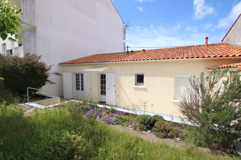 Royan, centre-ville et proche marché, belle maison F3 de plain-pied comprenant : Entrée avec placard, séjour, cuisine séparée et aménagée, dégagement, 2 chambres avec placards, salle d'eau, wc séparé. Cour avant sur rue - Garage - Terrasse - Débarras - Jardin - Chauffage électrique.