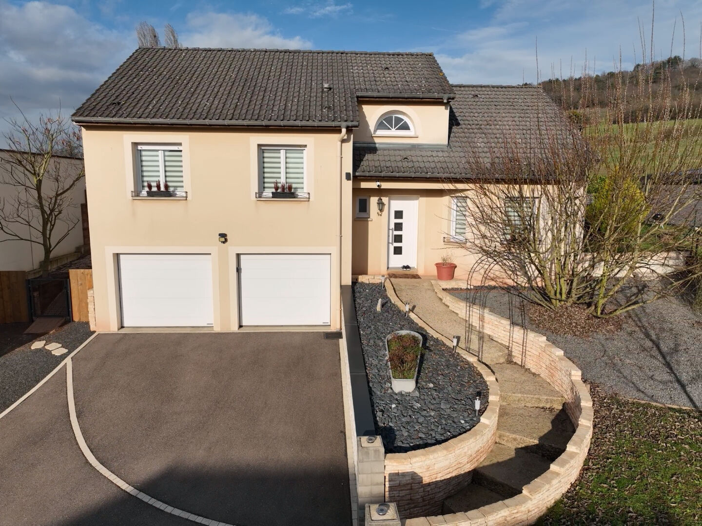 Située à Apach au pays des trois frontières à proximité immédiate du Luxembourg et de l'Allemagne cette maison individuelle offre un cadre de vie privilégié dans un environnement calme et verdoyant. Construite en 2005 et entièrement rénovée en 2021 cette maison développe une surface habitable de 141,85 m² et est implantée sur un terrain de 7 ares 48 centiares entièrement clos et sans vis à vis à l'arrière L'habitation s'ouvre sur une belle entrée avec placard intégré donnant accès à un salon-séjour traversant carrelé de 32,44 m² bénéficiant d'un bow window sur la façade avant et d'une porte fenêtre à l'arrière menant directement à une terrasse de 28 m² parfaitement exposée. La cuisine ouverte entièrement équipée dispose elle aussi d'un accès direct à la terrasse et au jardin, un wc séparé situé dans l'entrée complète ce niveau. Sur le demi niveau l'espace nuit se compose de trois chambres à coucher parquetées ainsi que d'une salle de bain familiale avec grande douche et un second wc. Au niveau supérieur un espace mezzanine mansardé de 26 m² surplombe le séjour et accueille un salon privé ainsi qu'un dégagement donnant sur une fenêtre à demi-lune idéal pour l'installation d'un bureau ou d'un espace jeux. En annexes la maison dispose d'une buanderie de 10 m² et d'un double garage avec double portes motorisées permettant d'accueillir jusqu'à trois véhicules ainsi qu'un espace atelier avec porte de service menant au jardin. A l'arrière de la propriété le jardin arboré sans vis à vis est agrémenté d'un cabanon et d'une balançoire avec une vue dégagée sur les champs et la nature environnante. A l'avant une large allée entièrement aménagée permet le stationnement de plusieurs véhicules ainsi qu'une bute paysager avec escalier donnant vers l'entrée de la propriété. La maison est équipée d'un système de chauffage central au gaz de ville avec chaudière à condensation de marque Viessmann. Un bien clé en main contemporain et idéal pour une famille recherchant le calme tout en restant à deux pas des frontières. A SAISIR ! Les informations sur les risques auxquels ce bien est exposé sont disponibles sur le site www.georisques.gouv.fr