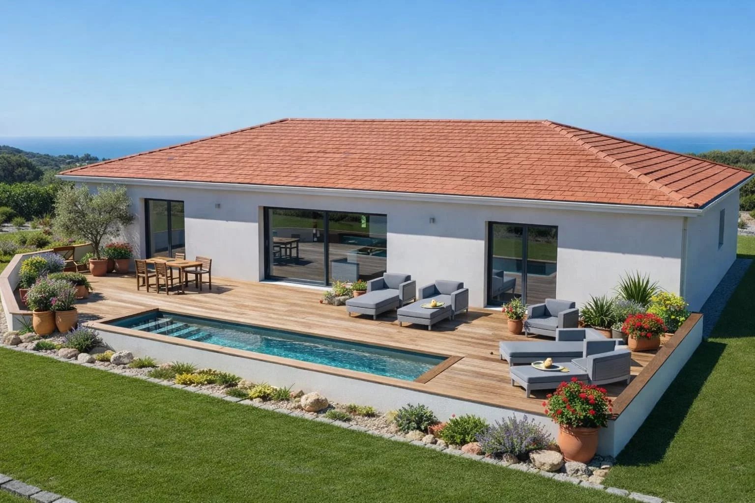 À seulement 5 minutes de la magnifique plage de Maora, cette villa neuve vendue achevée, dont la livraison est prévue en juillet 2026, développe environ 177 m² habitables, au cœur d’un environnement privilégié. Édifiée sur un terrain de 1 301 m², la propriété bénéficie d’une vue époustouflante sur les montagnes, offrant un cadre naturel préservé et apaisant. La villa s’ouvre sur une spacieuse et lumineuse pièce de vie, sublimée par de grandes baies vitrées à galandage, créant une parfaite continuité entre intérieur et extérieur. Elle dispose de 4 chambres, chacune avec sa salle d’eau ou salle de bains privative, ainsi que d’une climatisation gainable assurant un confort optimal en toute saison. Les prestations extérieures complètent harmonieusement l’ensemble : Piscine de 10 x 3 m Grande terrasse en bois exotique Terrain de pétanque La propriété sera entièrement clôturée par un mur en pierre de Bonifacio et bénéficiera d’un portail coulissant, ainsi que d’un carport double. Jardin paysagé avec vue dégagée sur la nature et les reliefs environnants.